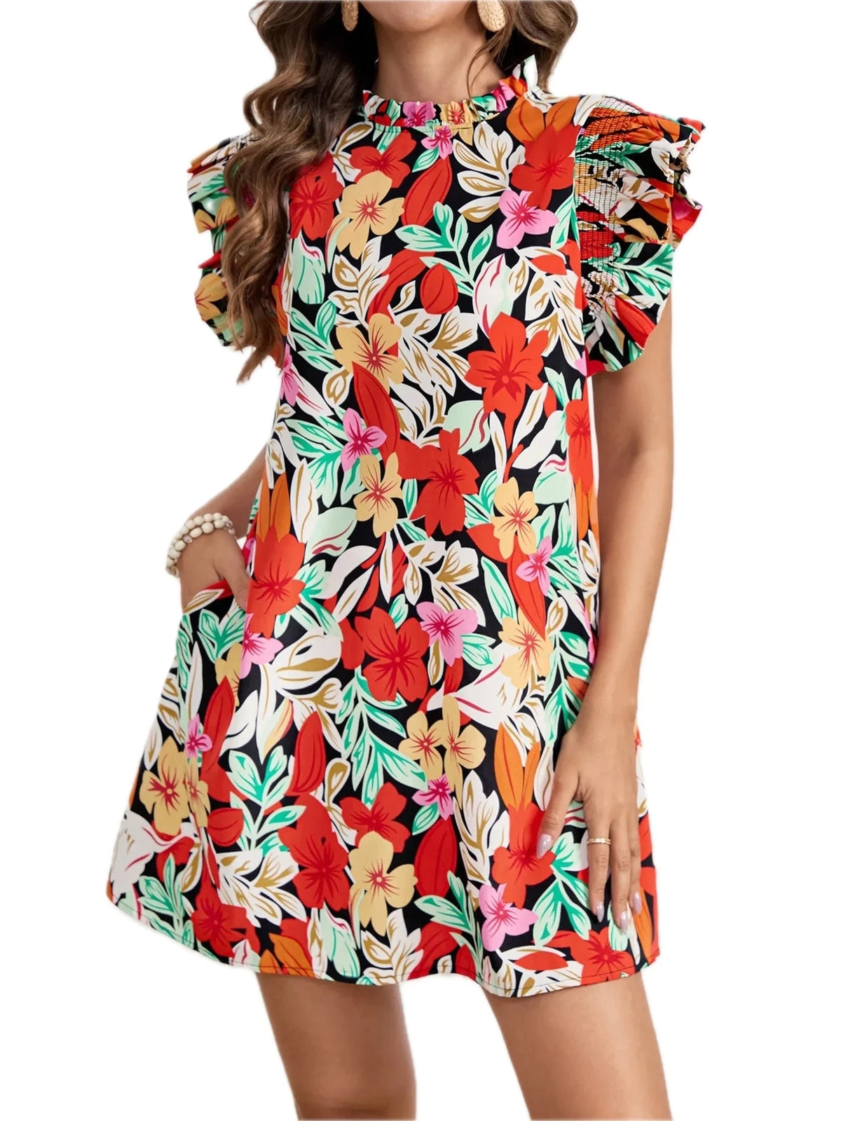 Women's Floral Ruffle Sleeve Summer Dress with Smocked Bodice and Lightweight Flowing Skirt for Casual Daywear
