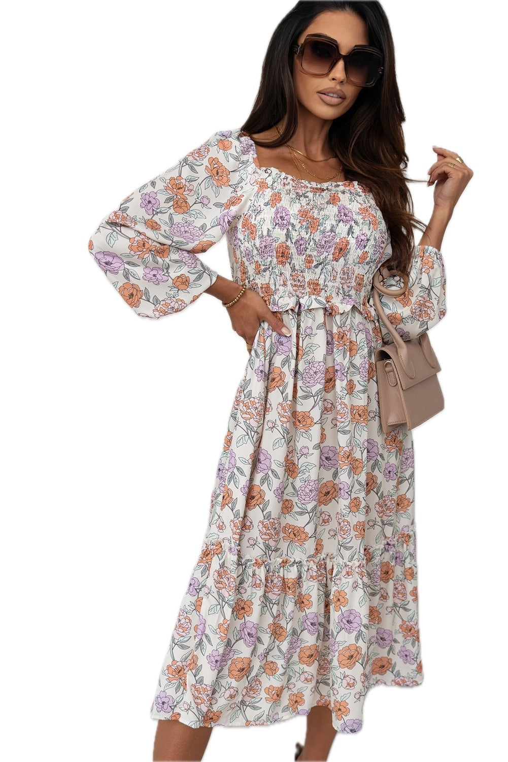 Women's Floral Smocked Square Neck Dress with Lightweight Sheer Bodice and 100% Polyester Fabric for Everyday Wear