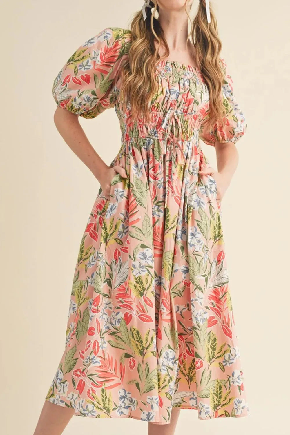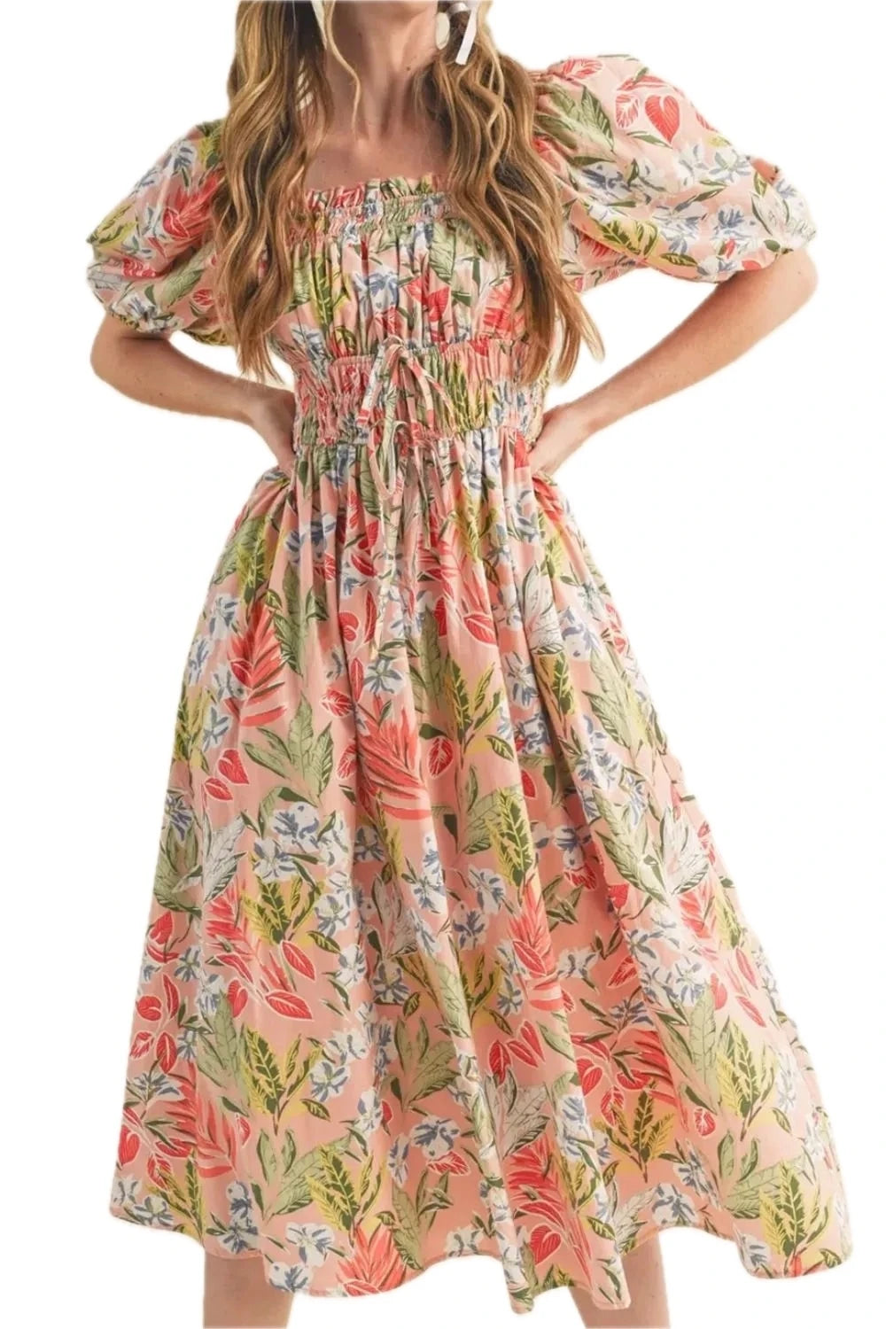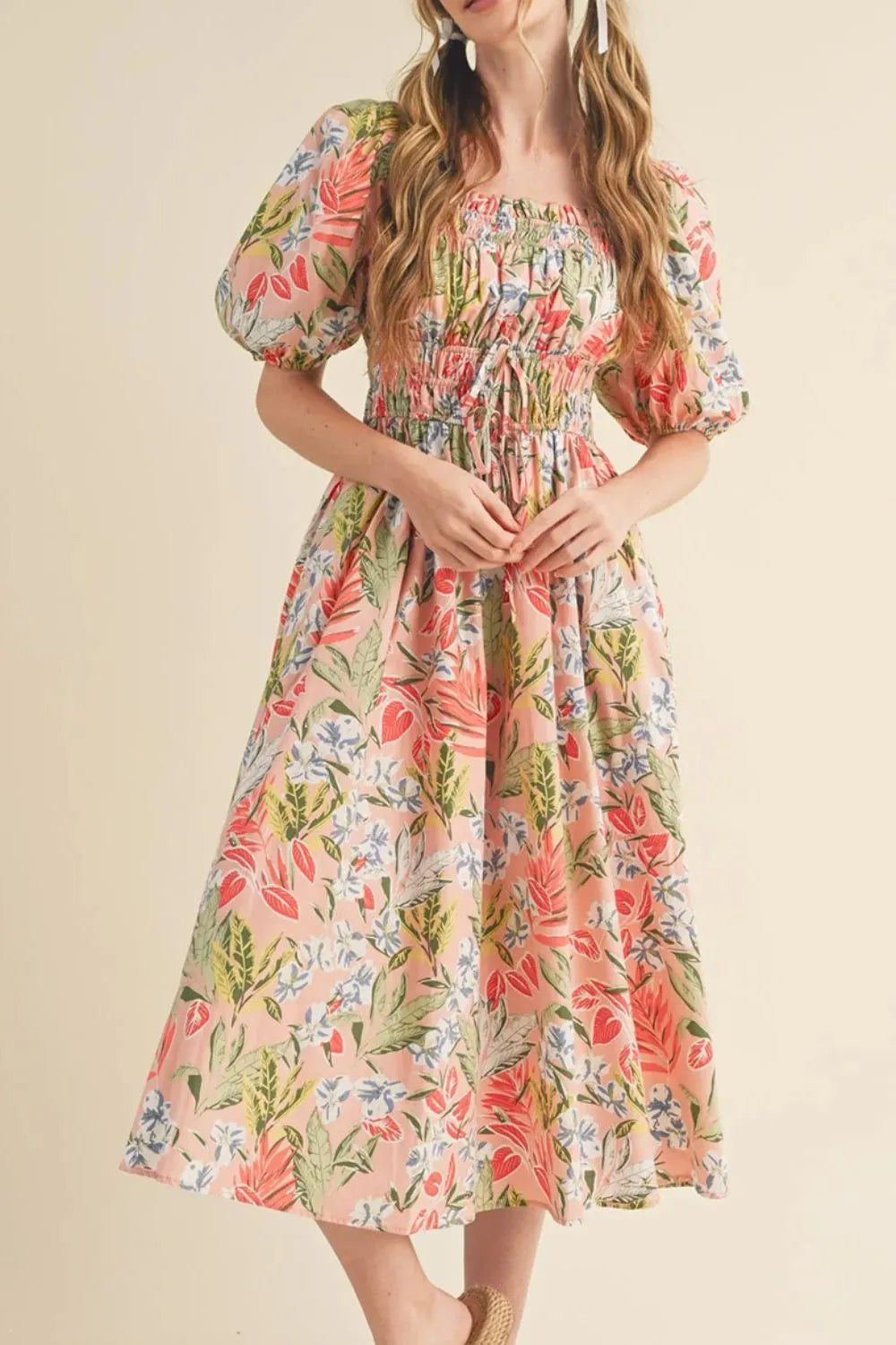 Womens Floral Smocked Square Neck Puff Short Sleeve Midi Dress in 100% Polyester Fabric Lightweight Casual Wear