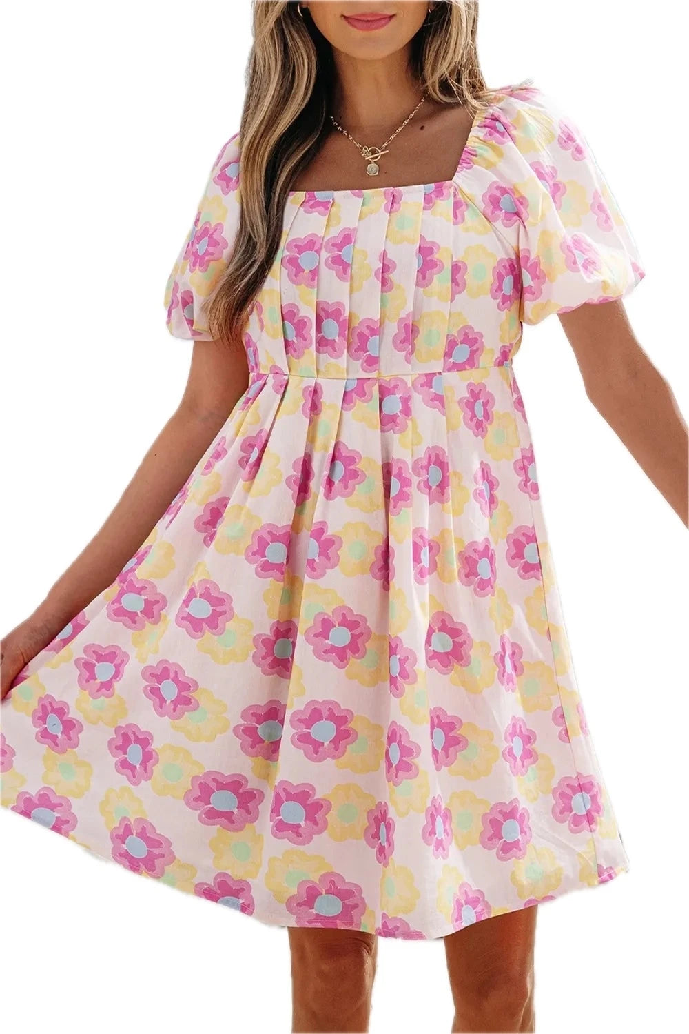 Women's Floral Square Neck Puff Sleeve Pleated Midi Dress with Flared Hem for Versatile Casual Party 100% Cotton