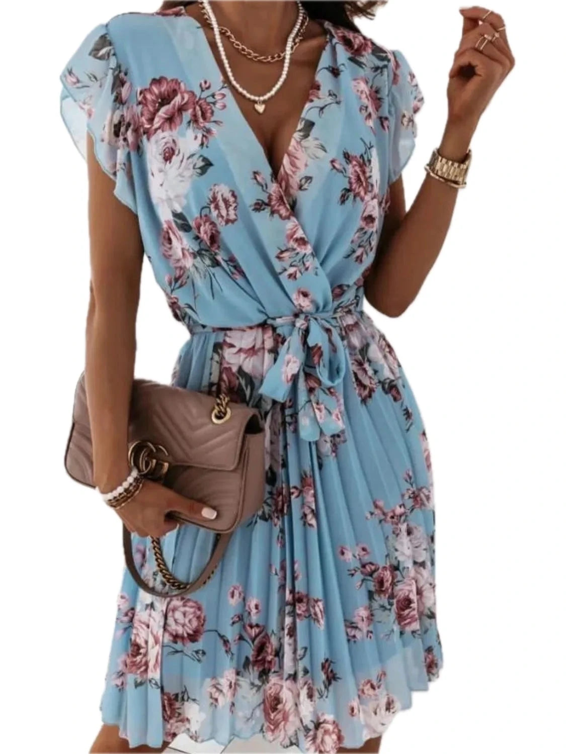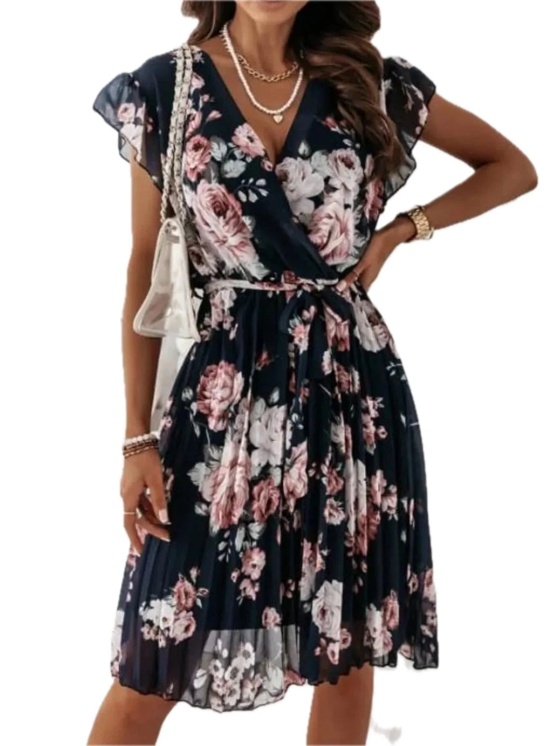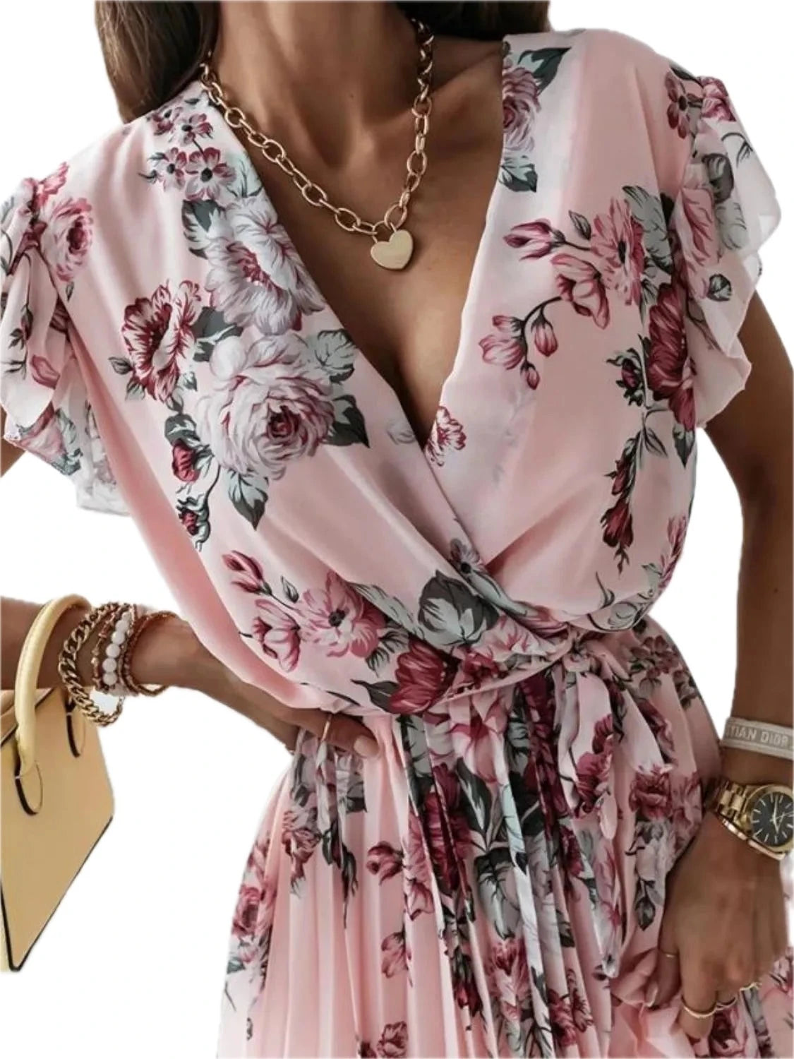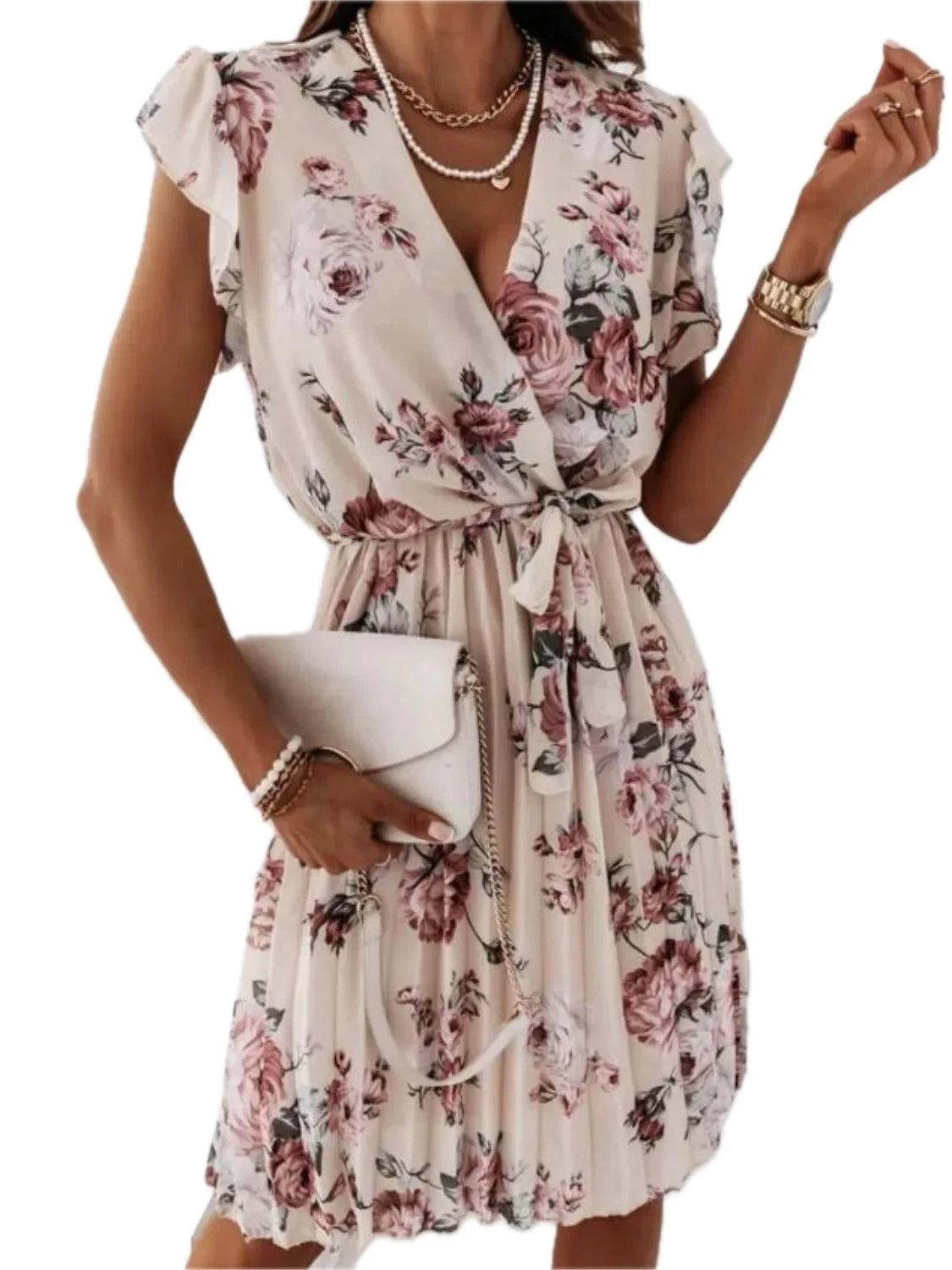 Women's Floral Surplice Ruffled Cap Sleeve Dress in Polyester Fabric with Frill and Lined Bodice for Elegant Wear