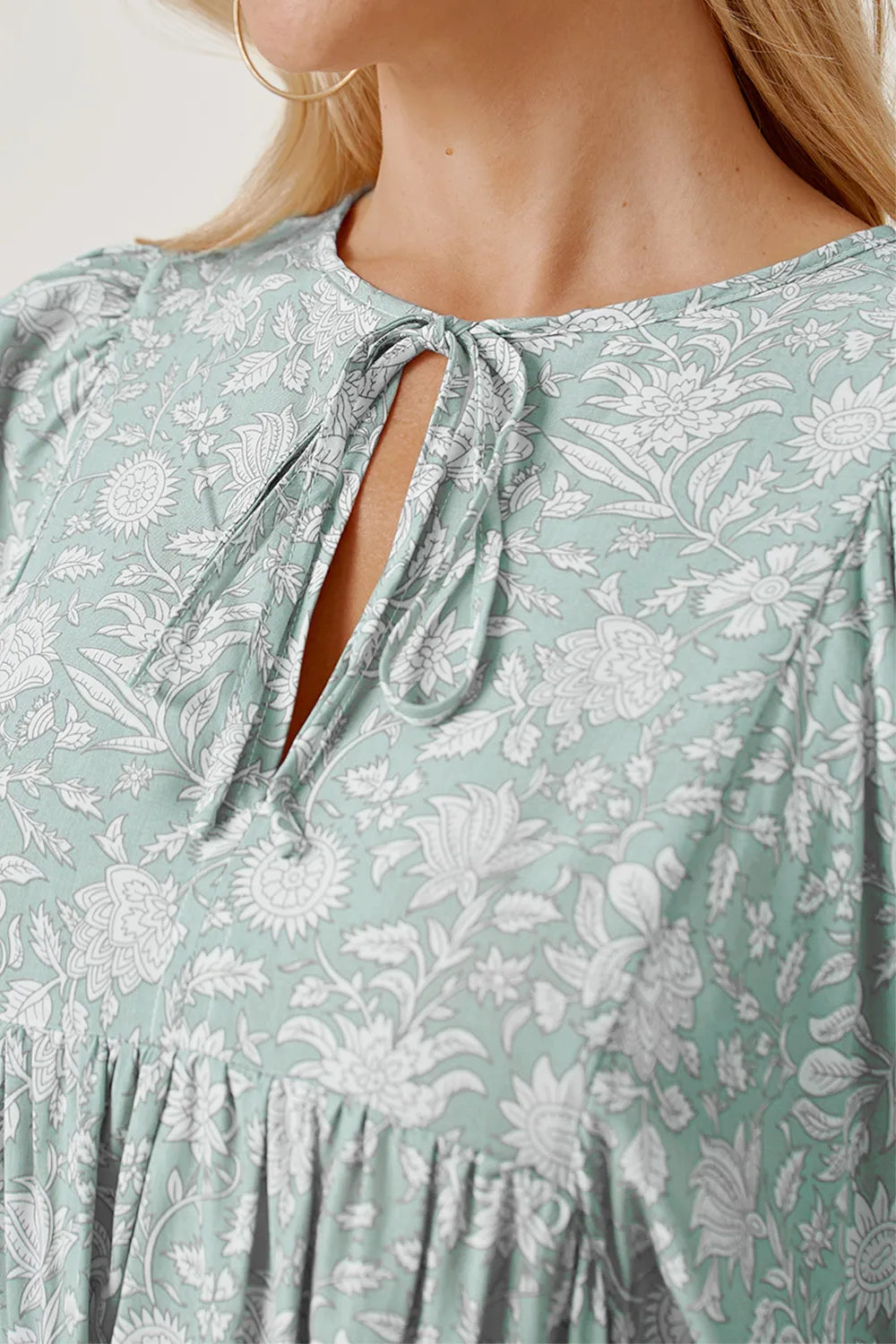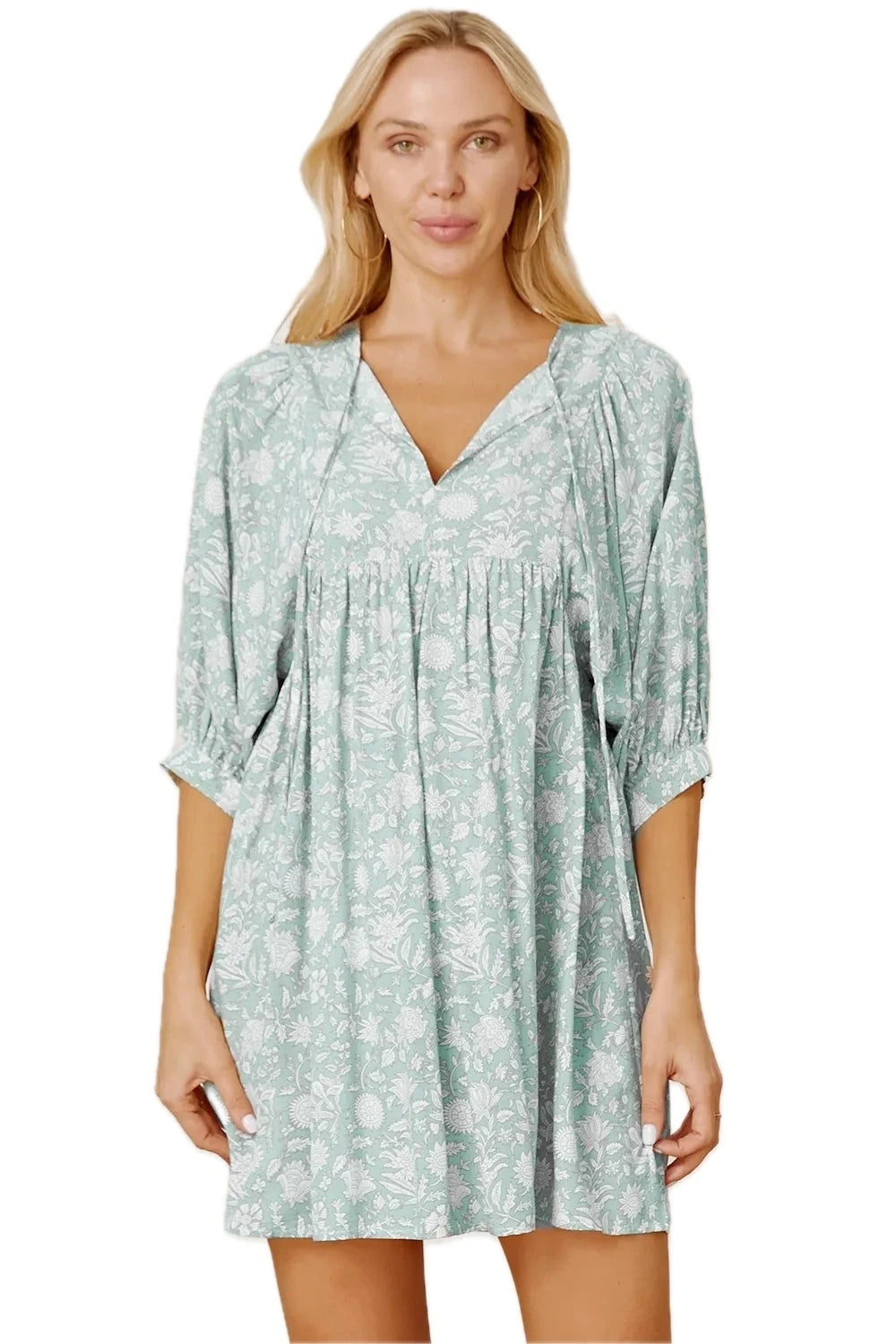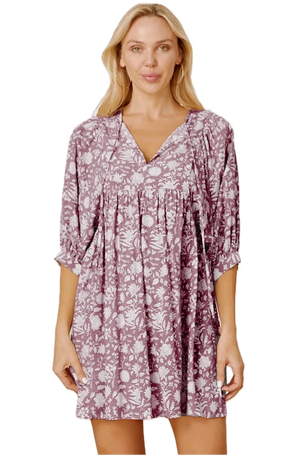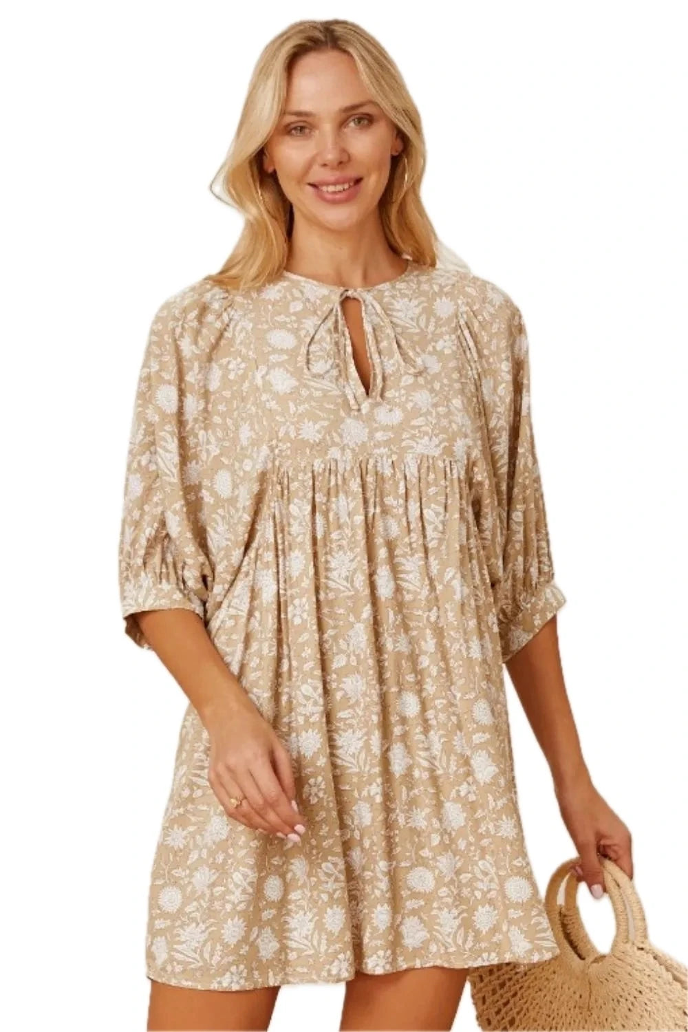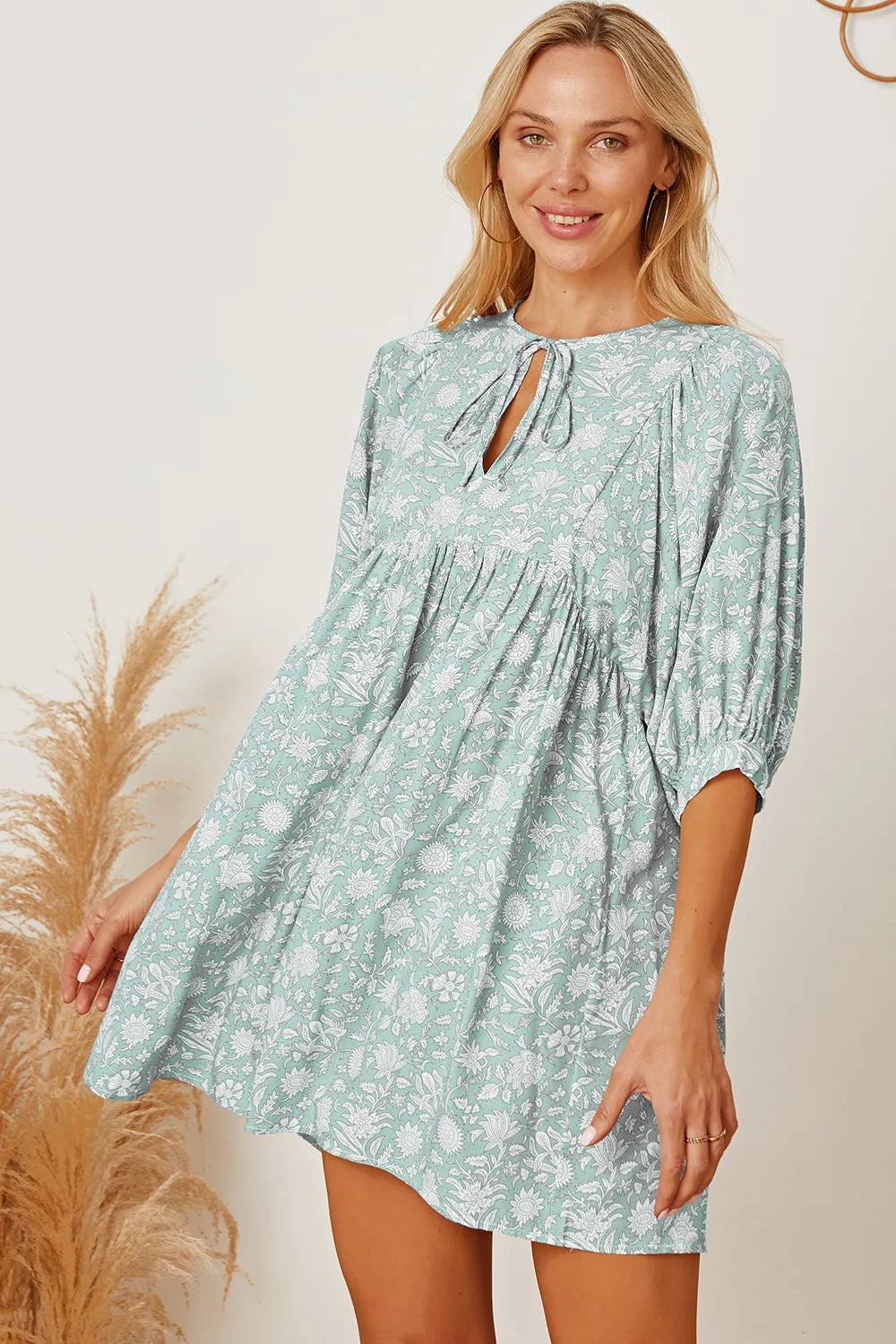 Women's Floral Tie Neck Ruched Babydoll Dress Featuring Soft Rayon Fabric for Lightweight Comfort and Flattering Fit