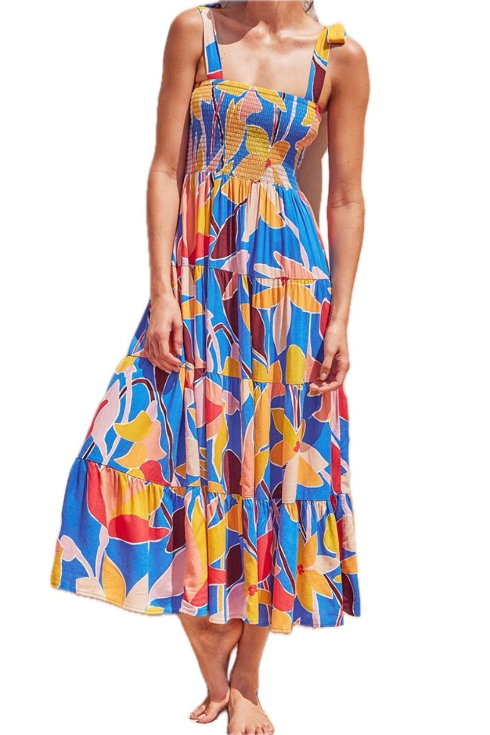 Women's Floral Tie Shoulder Smocked Tiered Maxi Dress Multicolored Pattern 100% Polyester Casual Sleeveless Square Neck Effortless Summer Chic