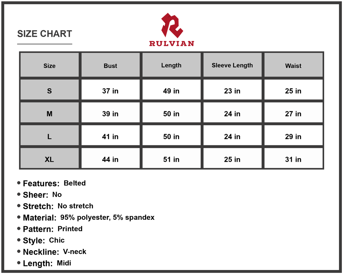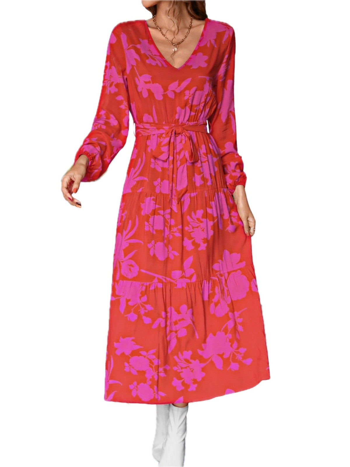 Women's Floral V-Neck Long Sleeve Dress with Belted Silhouette Perfect for Day or Evening Wear 95% Polyester 5% Spandex