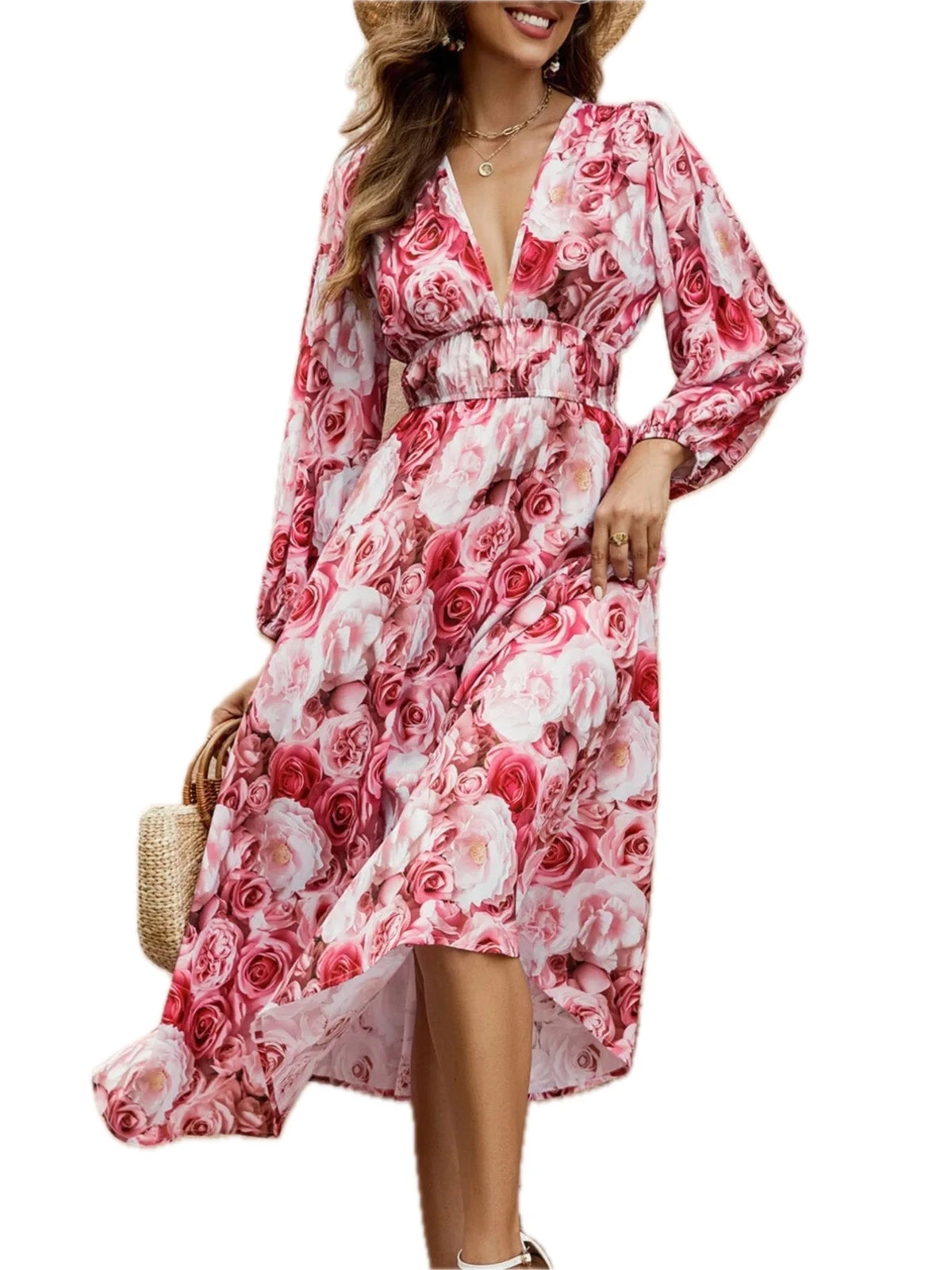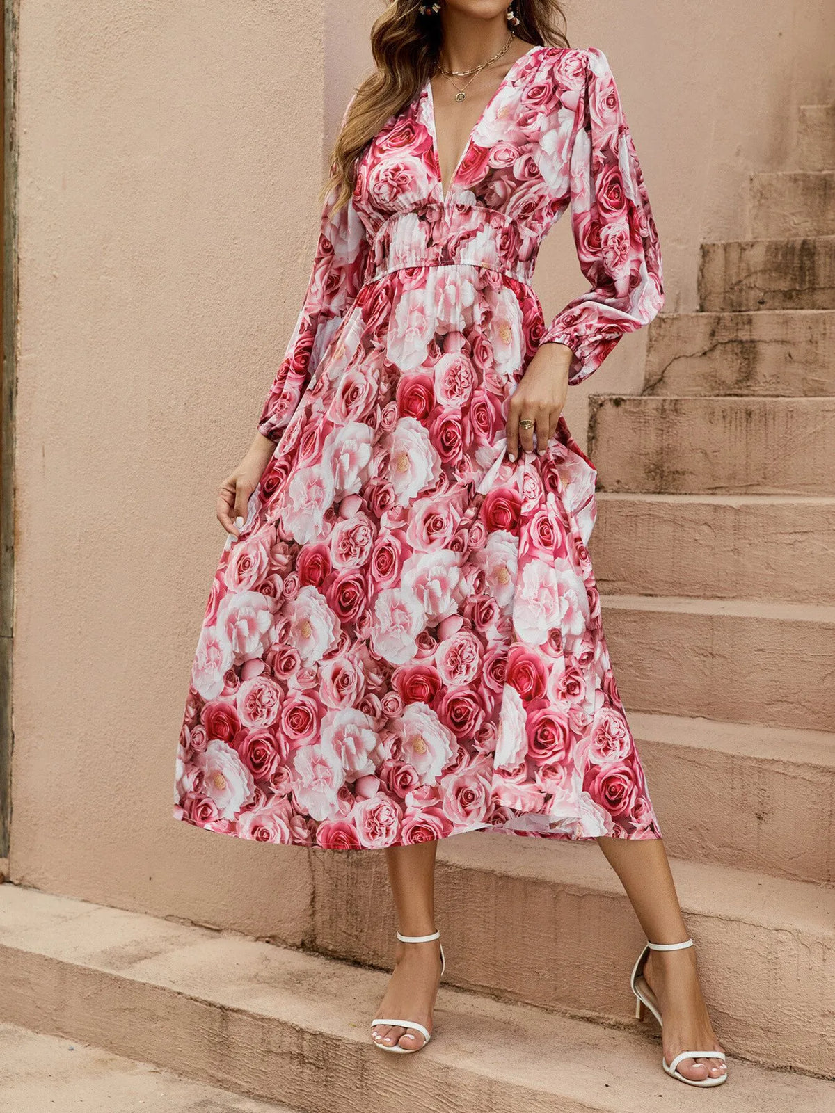 Women's Floral V Neck Long Sleeve Dress With Ruched Detail And Comfortable Fit In 100% Polyester Fabric Machine Washable