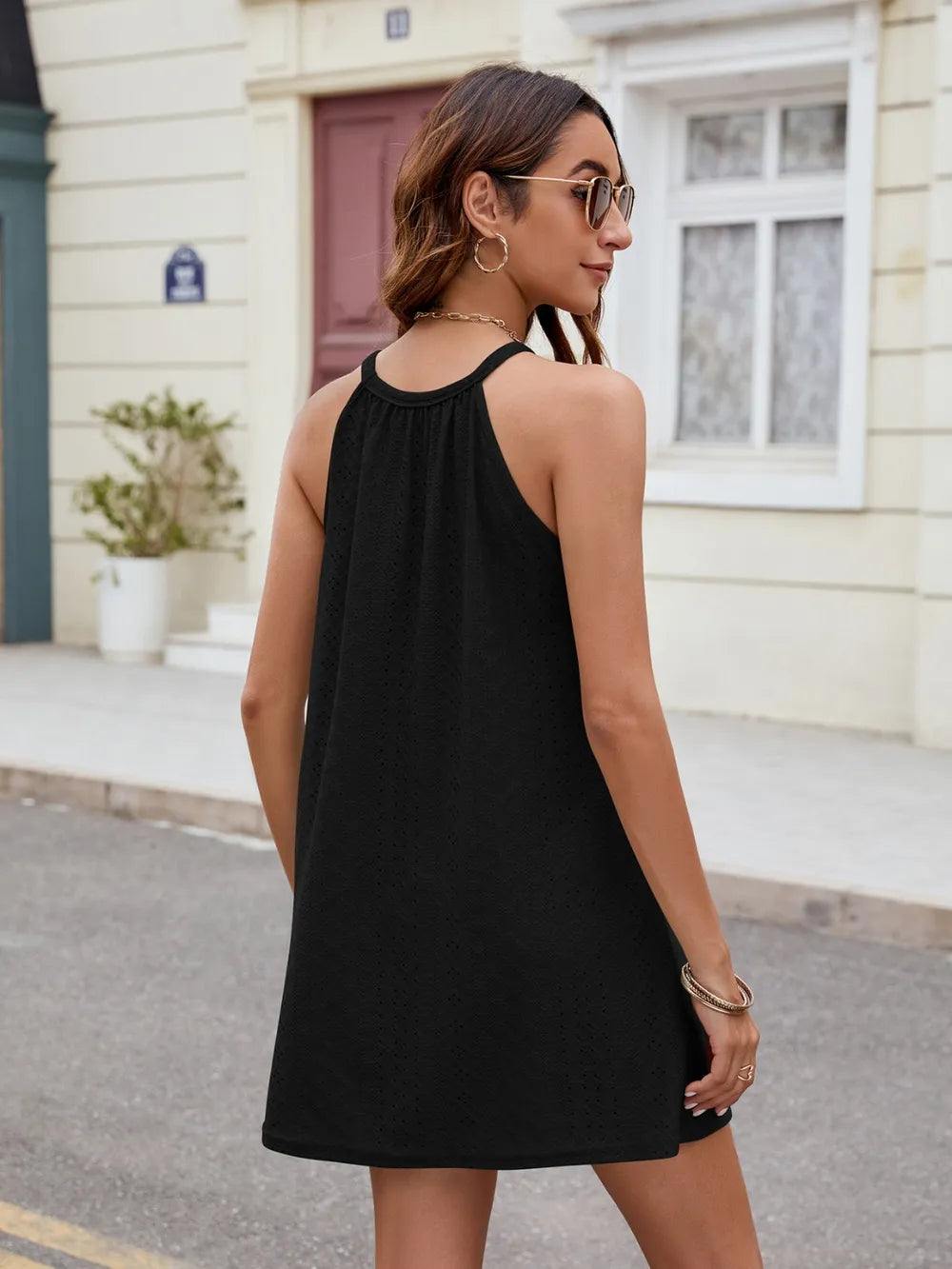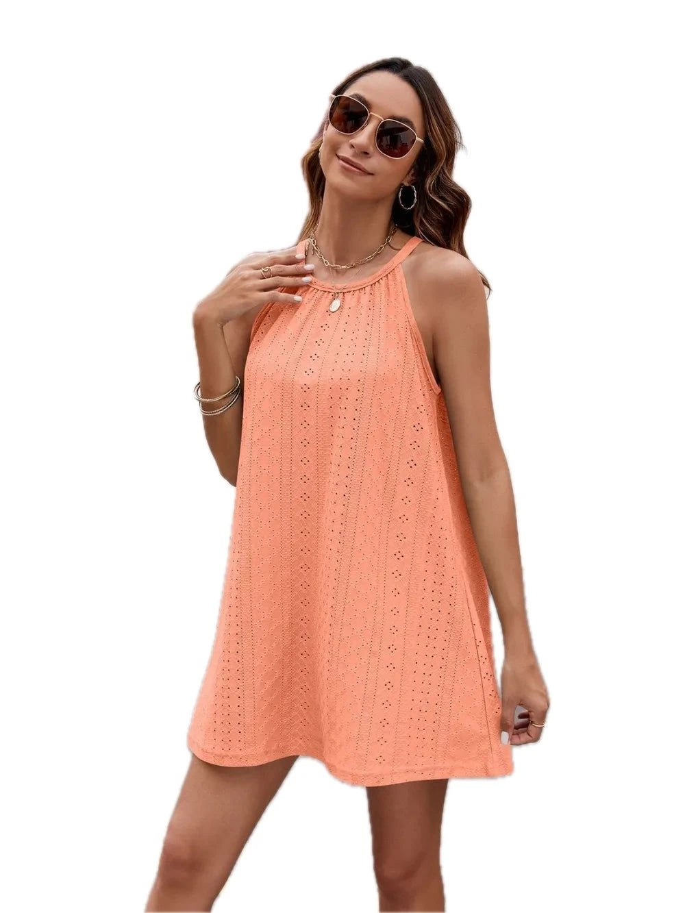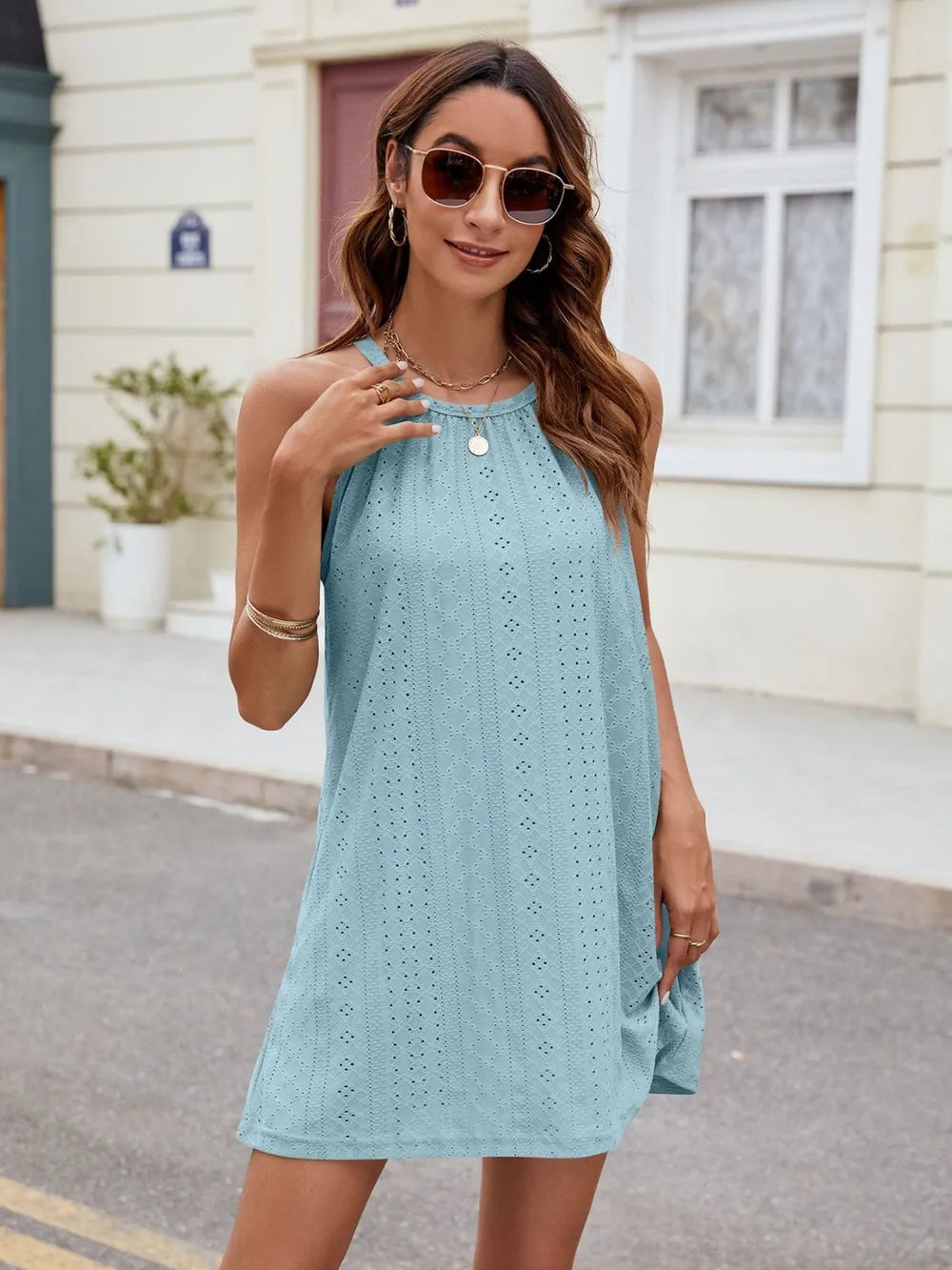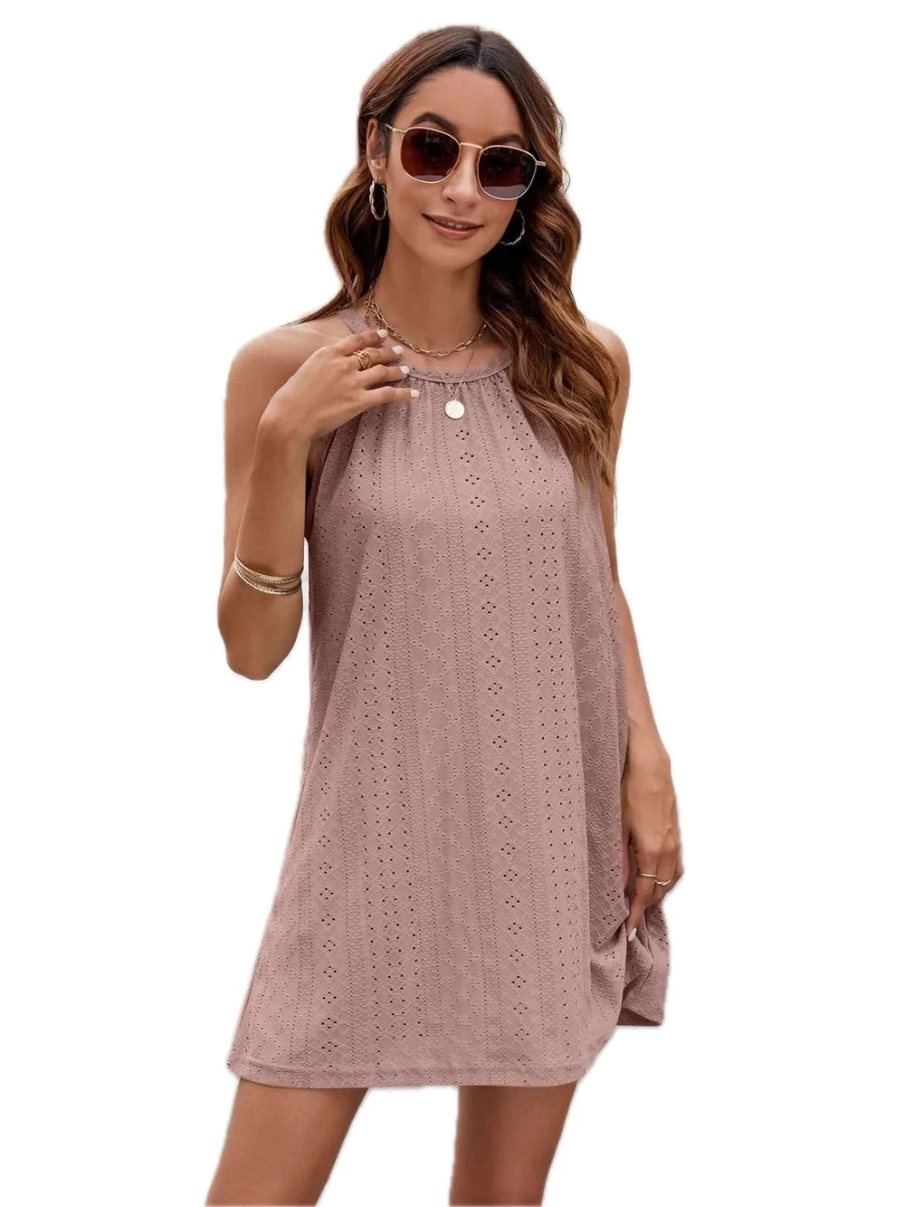 Women's Eyelet Sleeveless Mini Dress with Sheer Details and Stretchy Opaque Bodice 65% rayon 30% polyester 5% spandex
