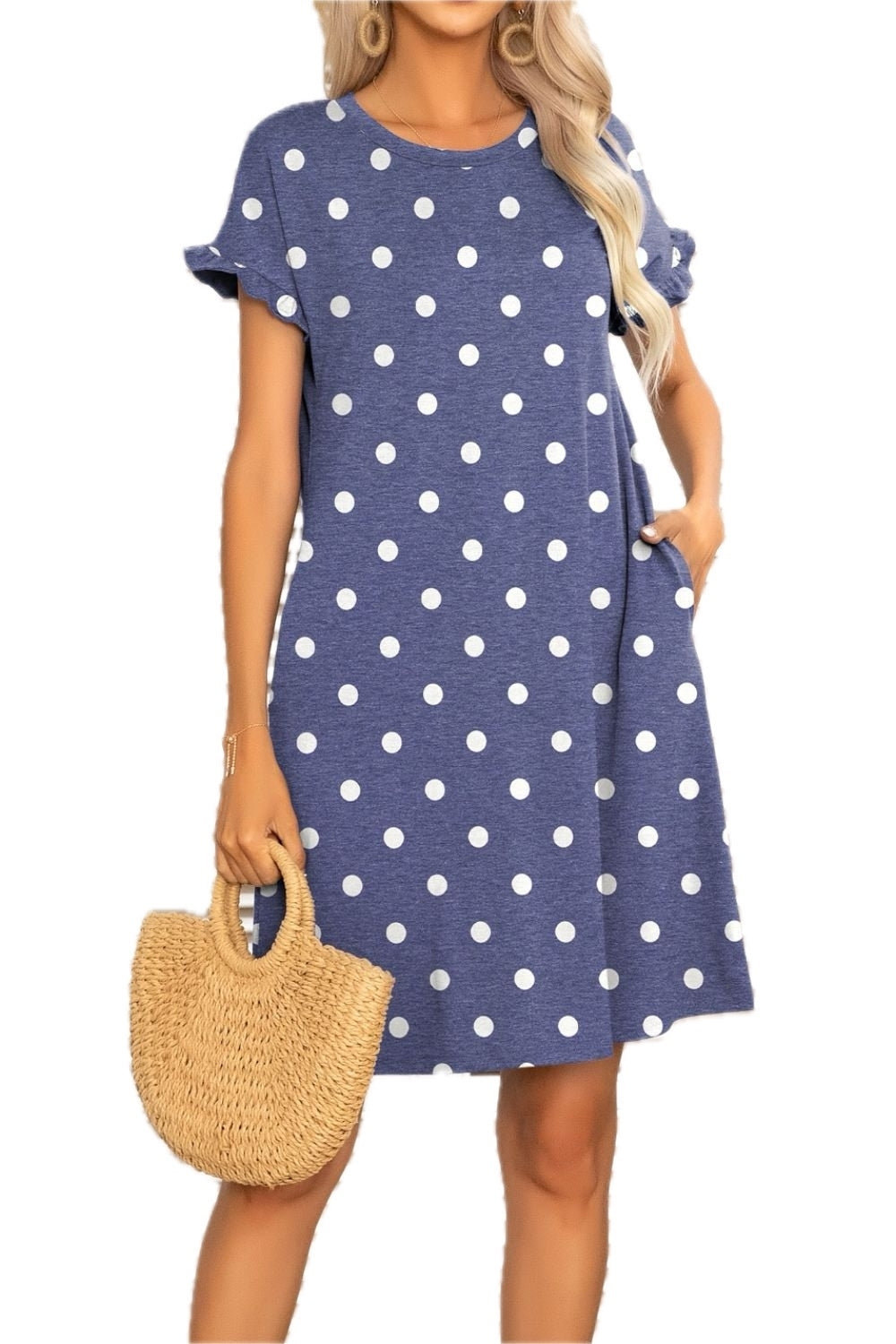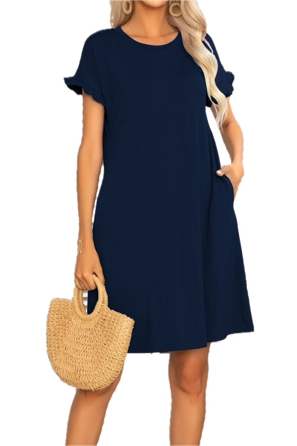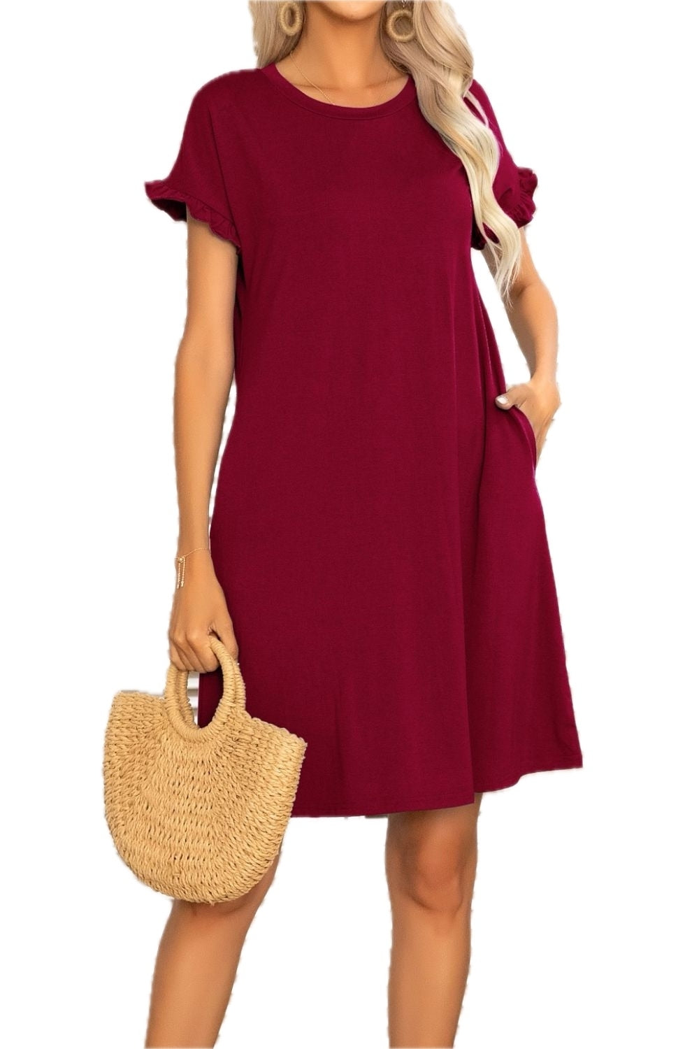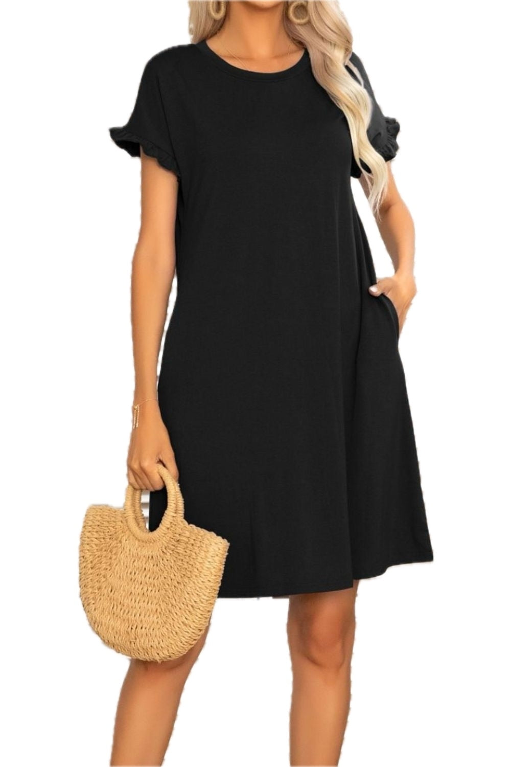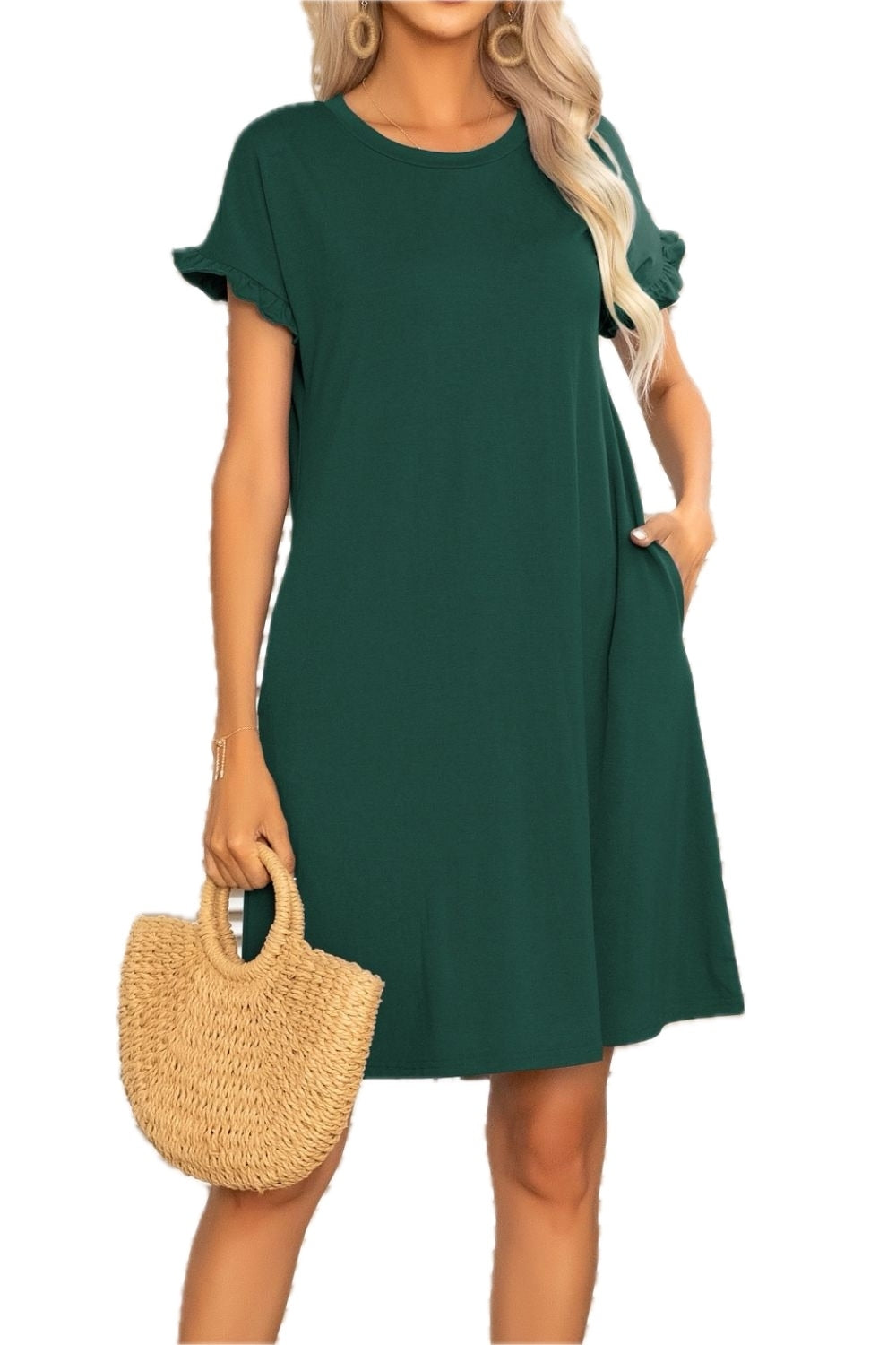 Women's Flounce Sleeve Round Neck Dress with Pockets Mini Length Short Sleeves 65% polyester 30% viscose 5% elastane
