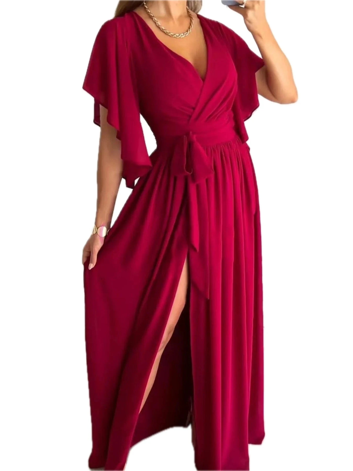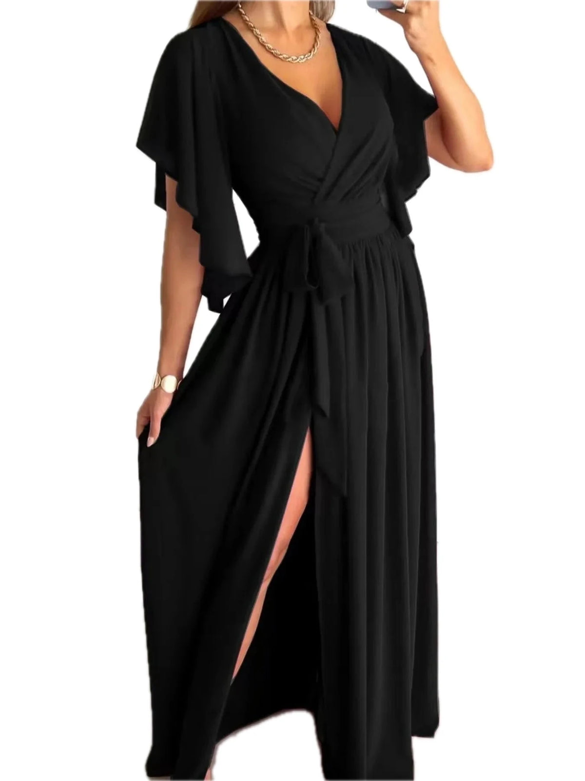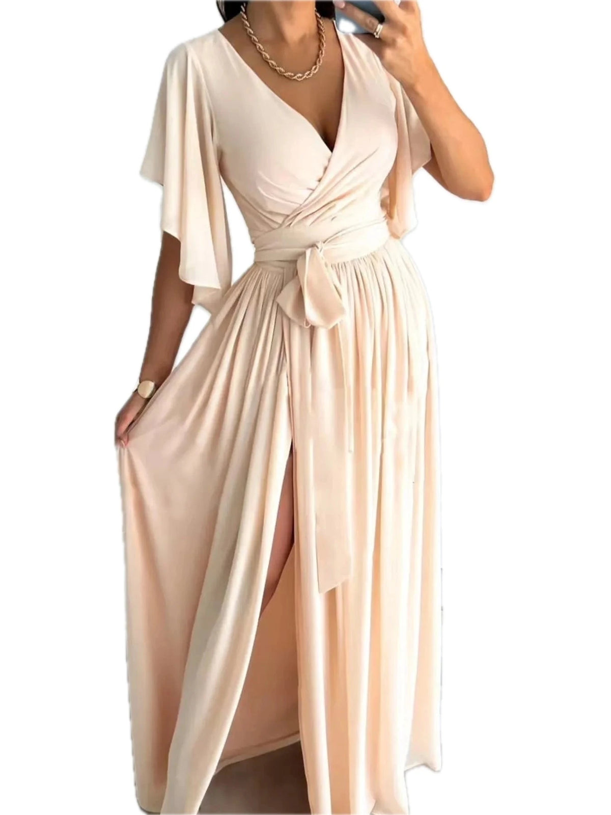 Women's Flutter Sleeve Surplice Tie Waist Dress Ruched Slit Detail Comfortable Elegant Everyday Wear 100% polyester