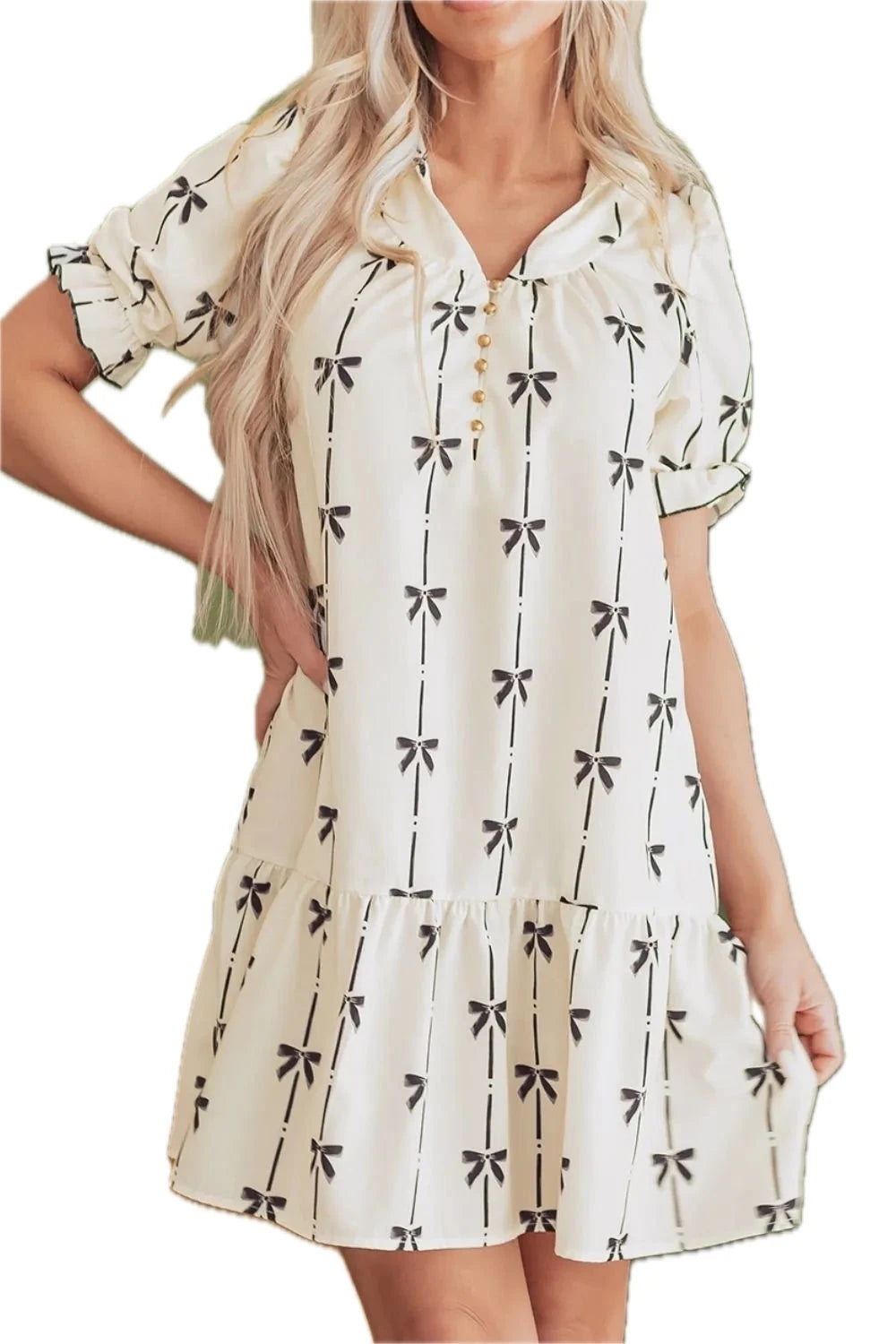 Women's Frill Bow Print Notched Short Sleeve Mini Dress 100% Polyester Fabric Stylish Summer Easy Care Machine Washable