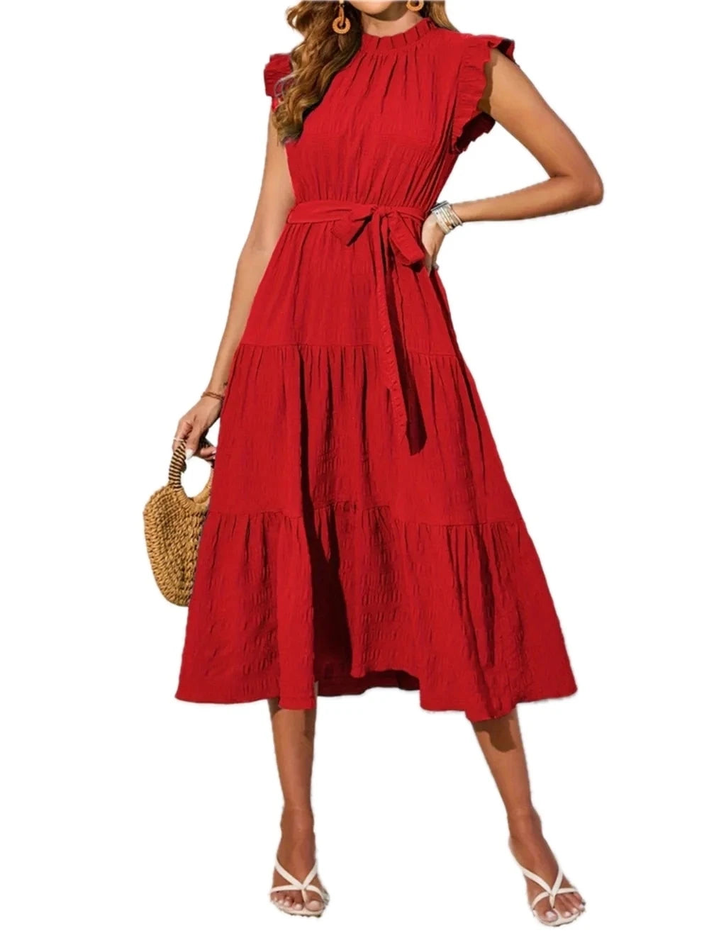 Women's Frill Mock Neck Ruffled Cap Sleeve Midi Dress in 100% Rayon Fabric for Flowy Comfort and Everyday Style