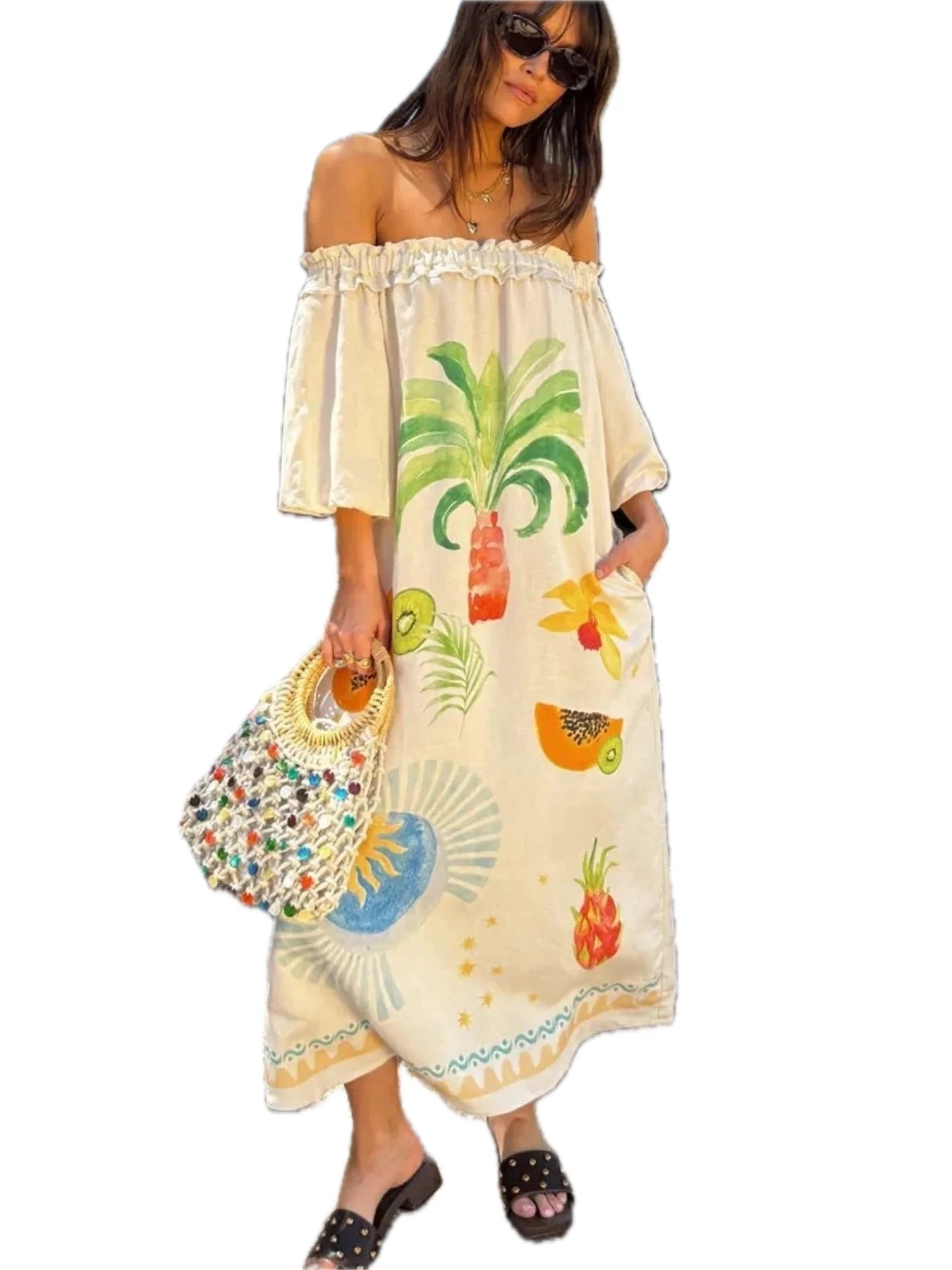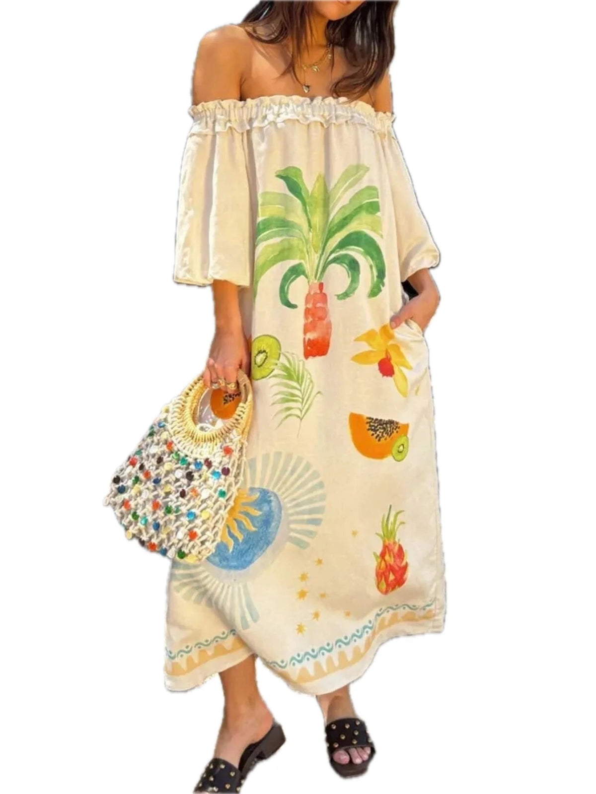 Women's Frill Printed Off Shoulder Dress with 100% Polyester Fabric for a Lightweight Flowy Look and Casual Elegant Wear