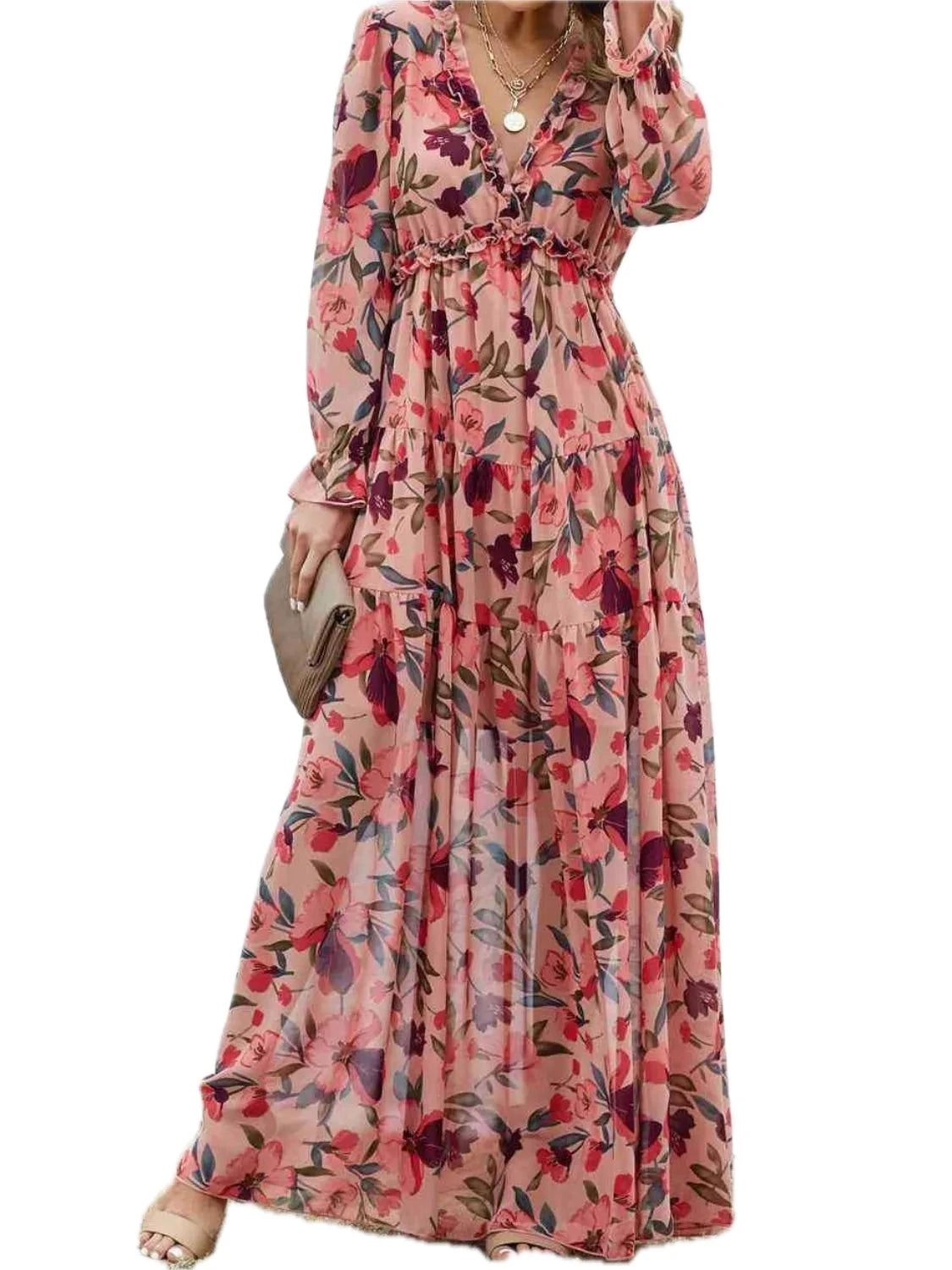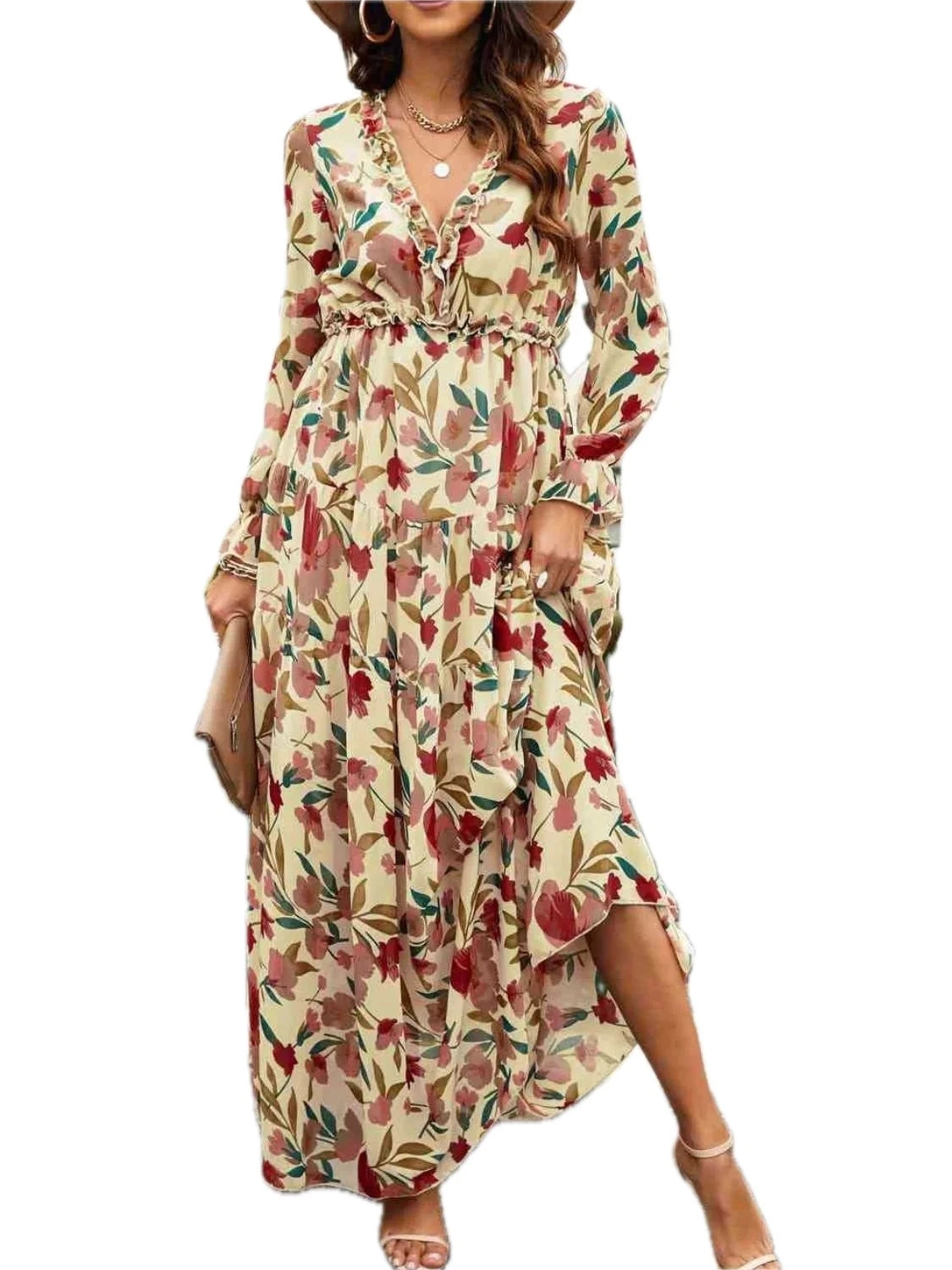 Women's Frill Printed V Neck Flounce Sleeve Dress in 100% Polyester Fabric for Elegant Everyday Wear and Easy Care