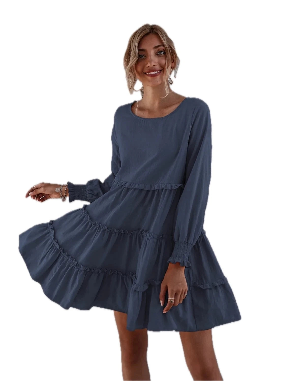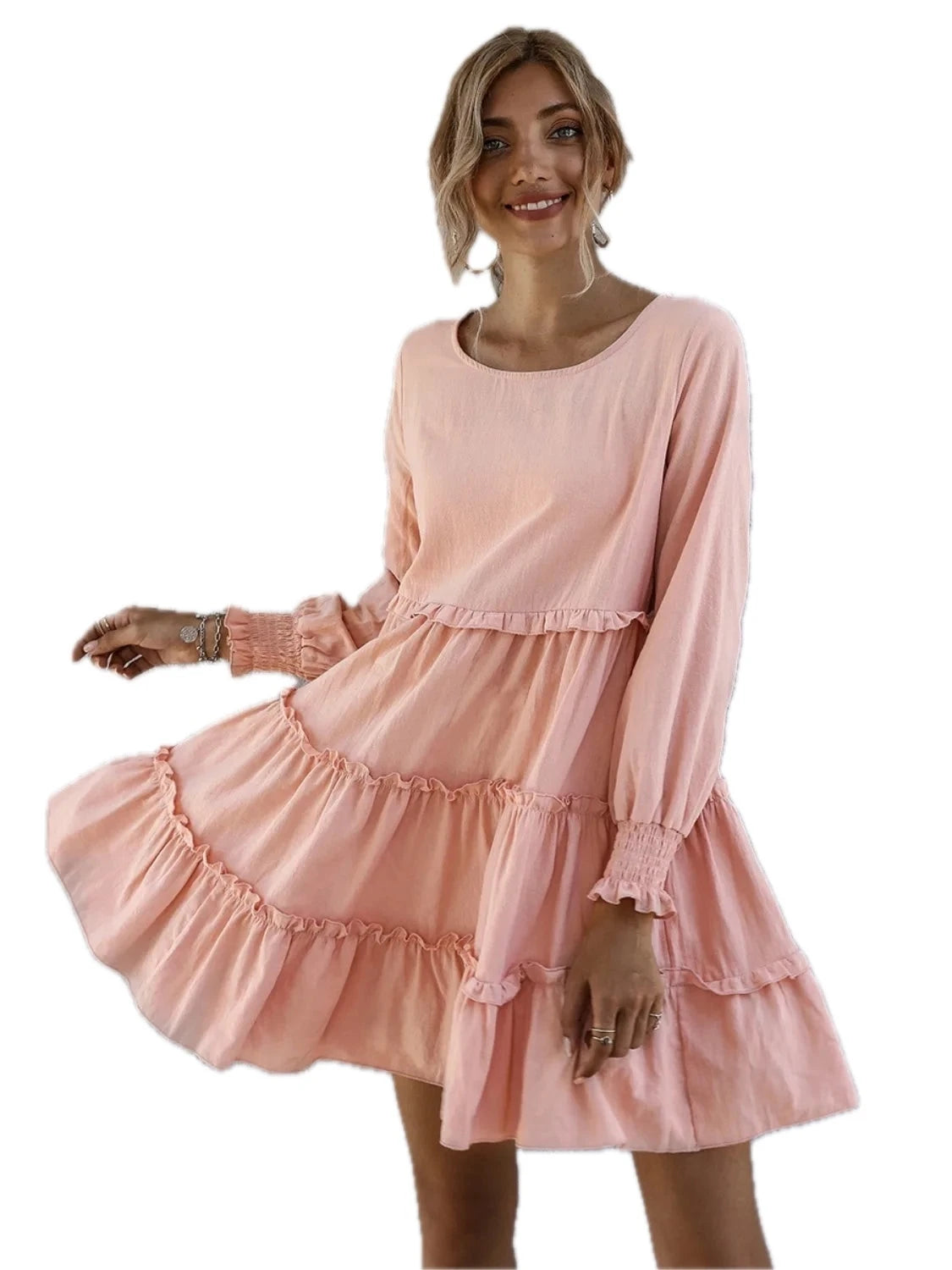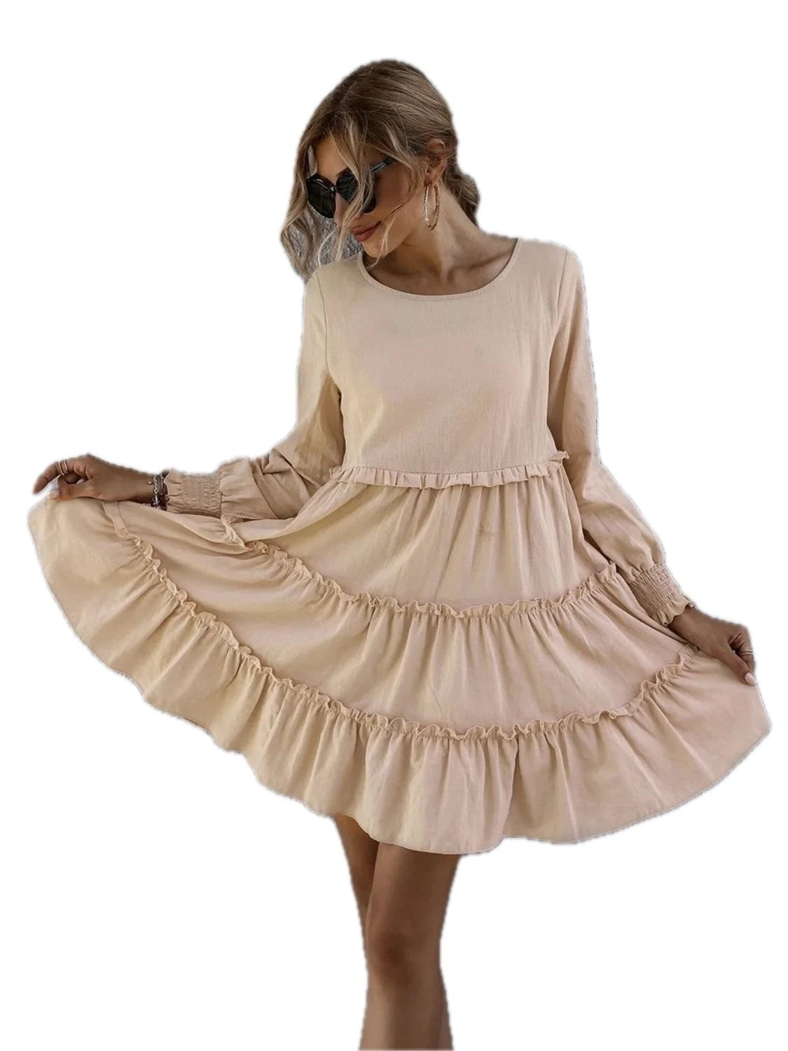 Women's Frill Tiered Long Sleeve Mini Dress in 100% Polyester Fabric for Elegant Everyday and Party Wear Chic