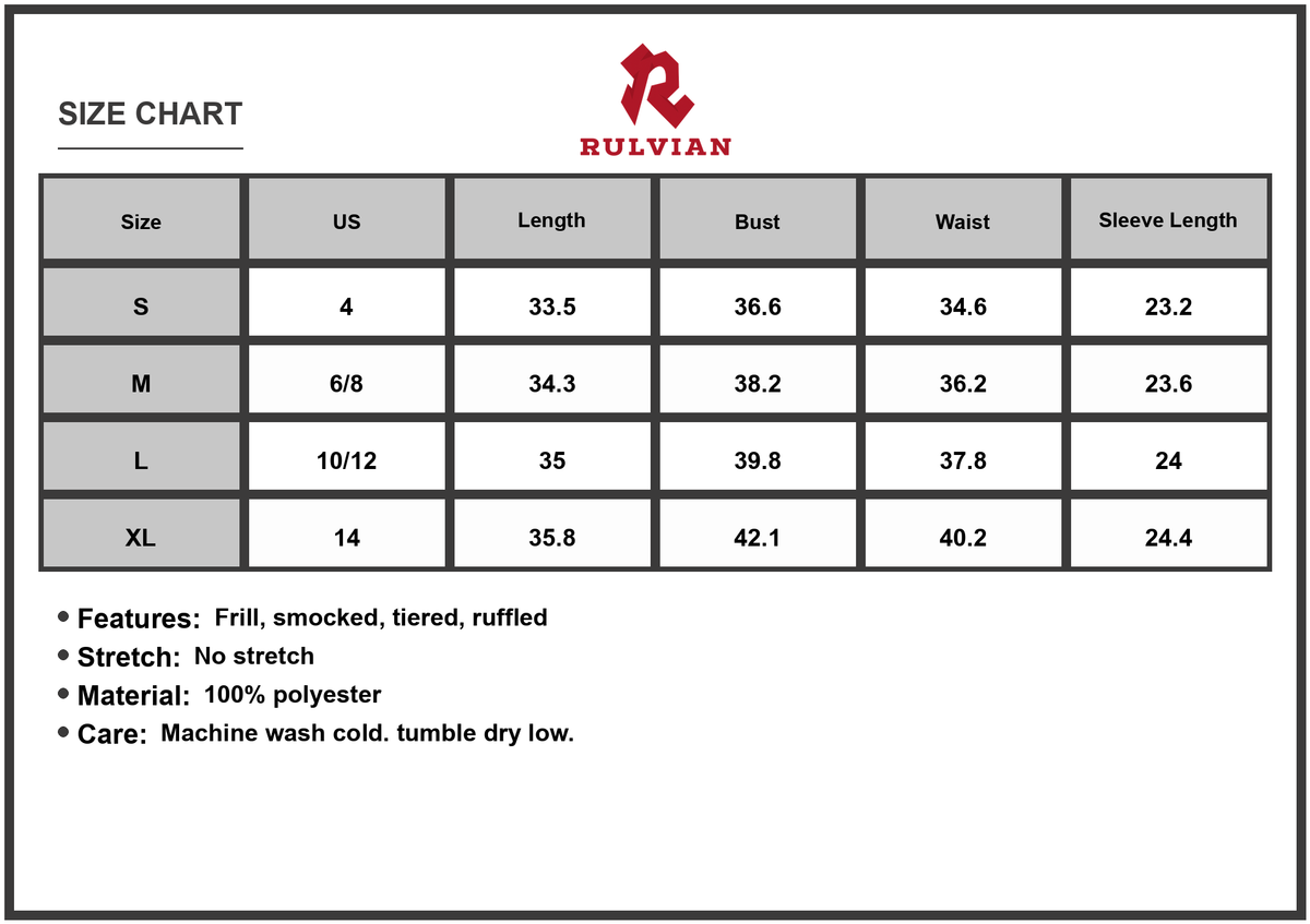 - Features: Frill, Smocked, Tiered, Ruffled