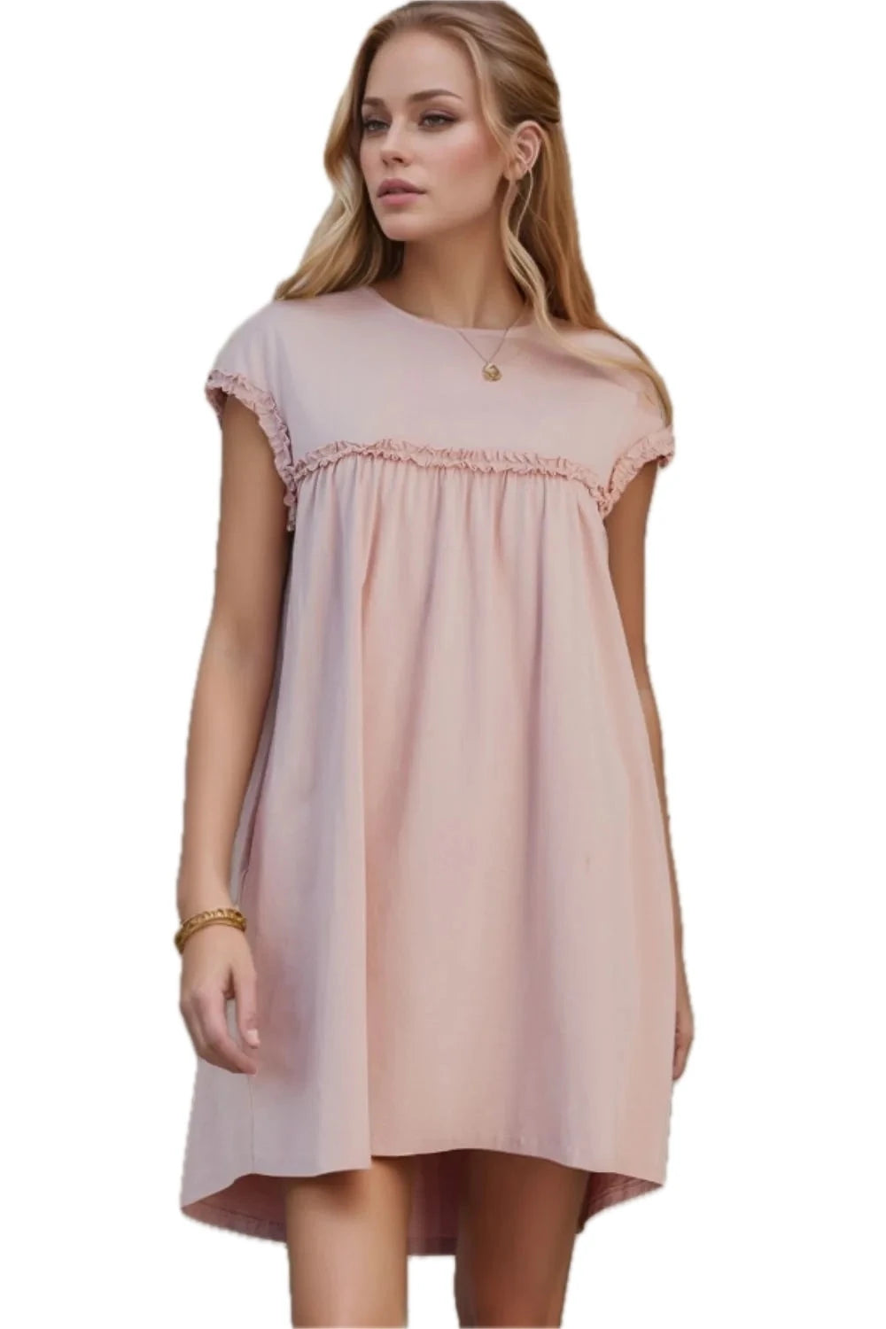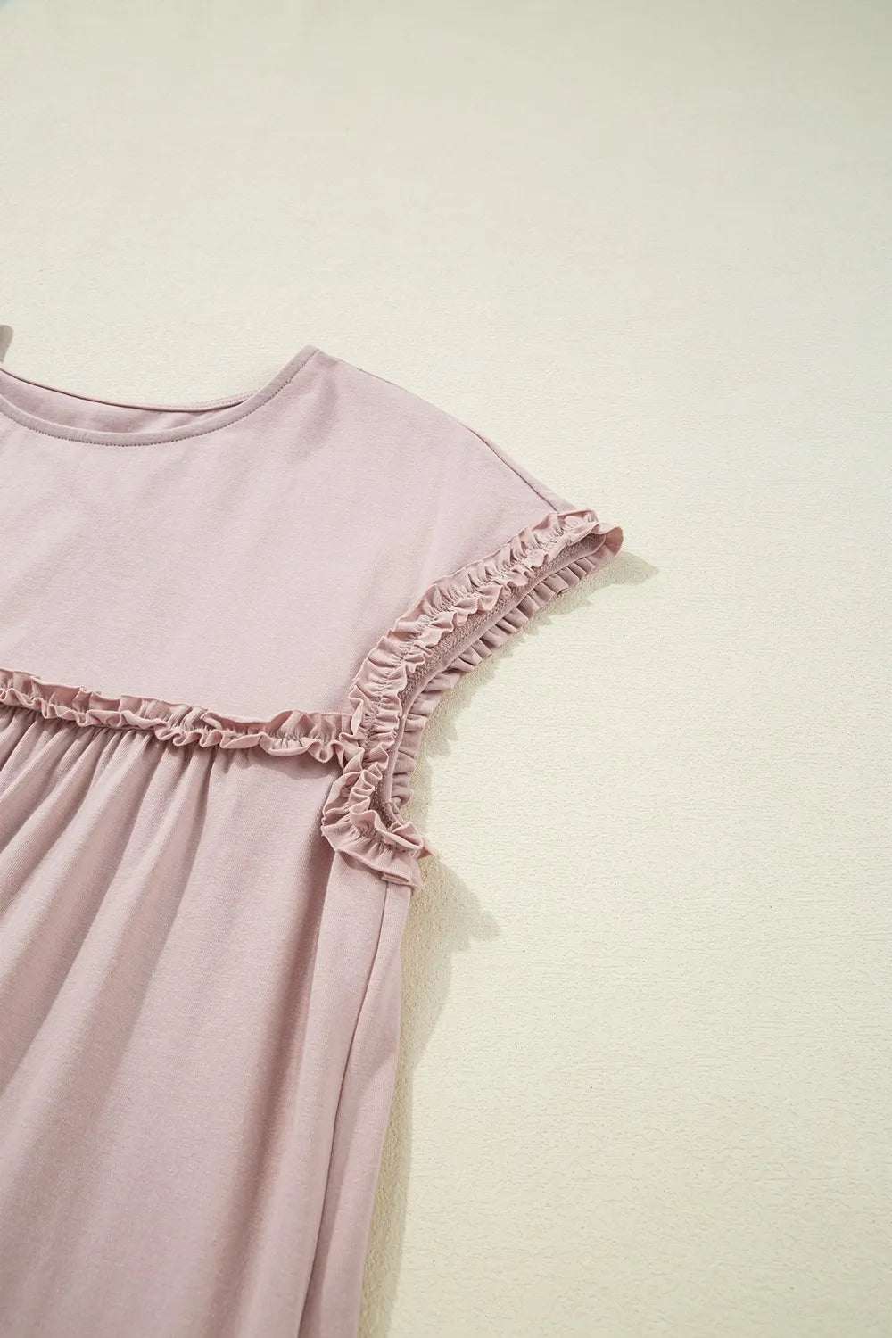 Women's Frilled Trim Crew Neck Cap Sleeve Loose Fit Mini Dress for Everyday Wear 95% Cotton 5% Elastane Soft Stretch