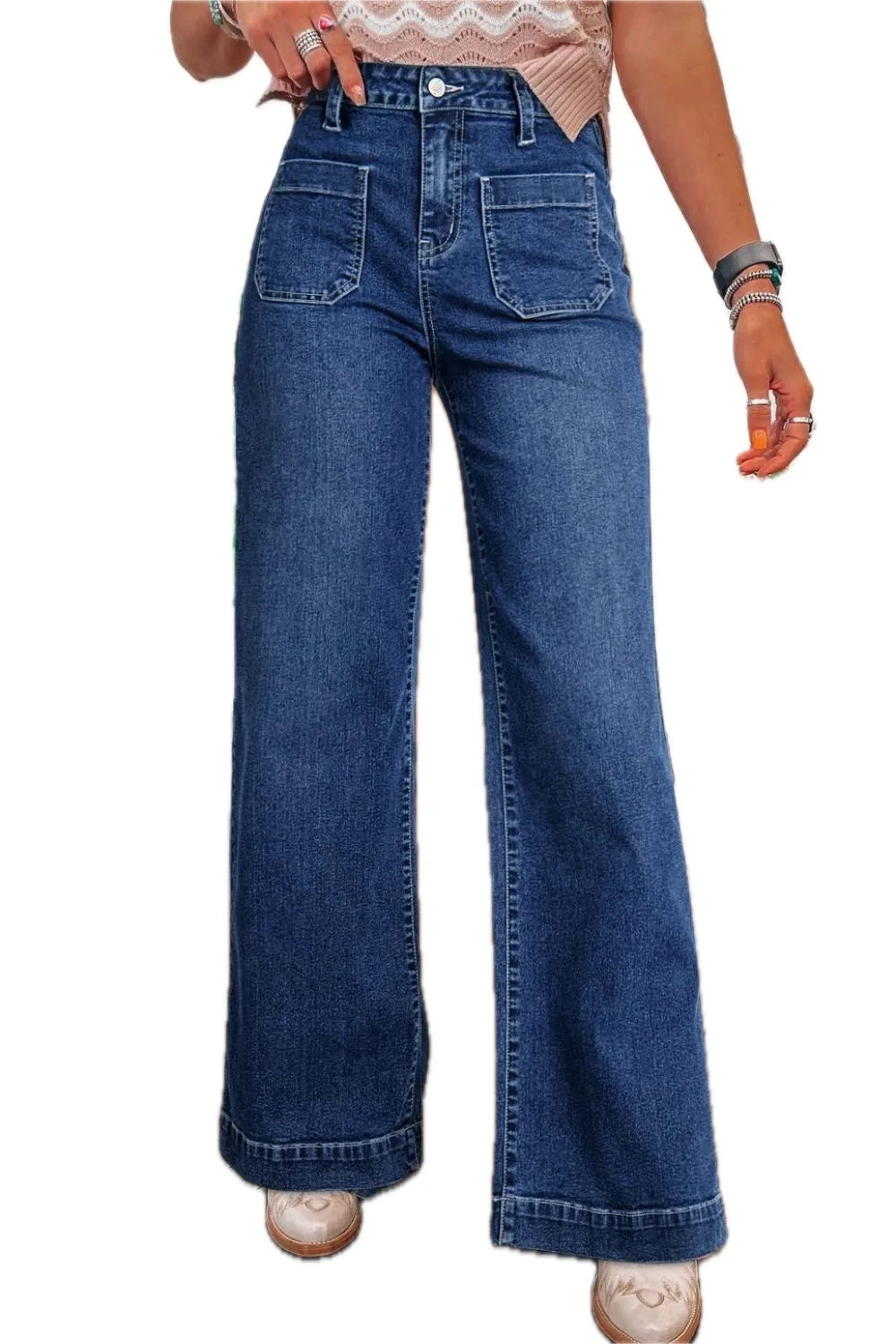 Women High Waisted Wide Leg Jeans with Patch Pocket Button Closure and Stretch Durable Denim Pants for Everyday Wear