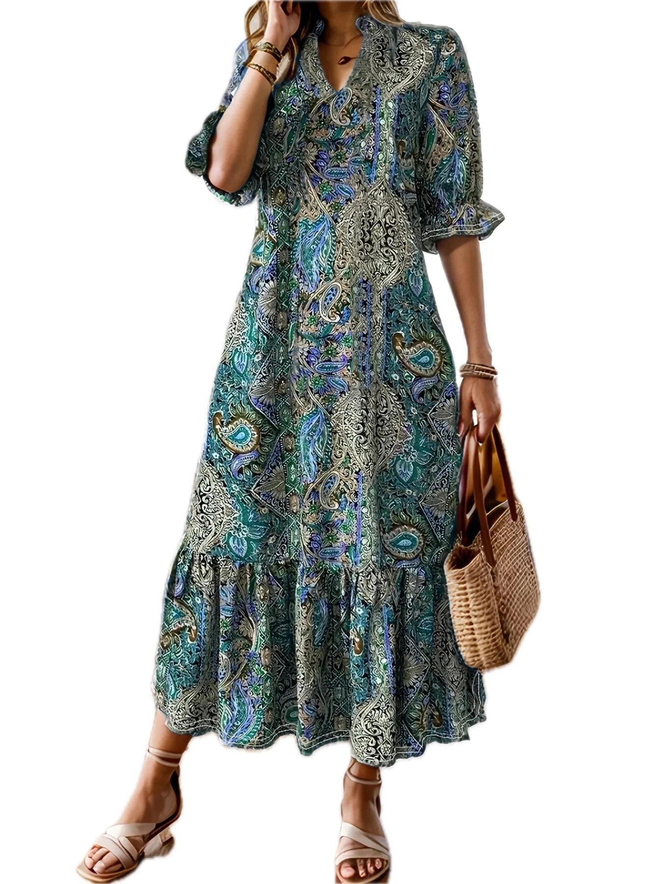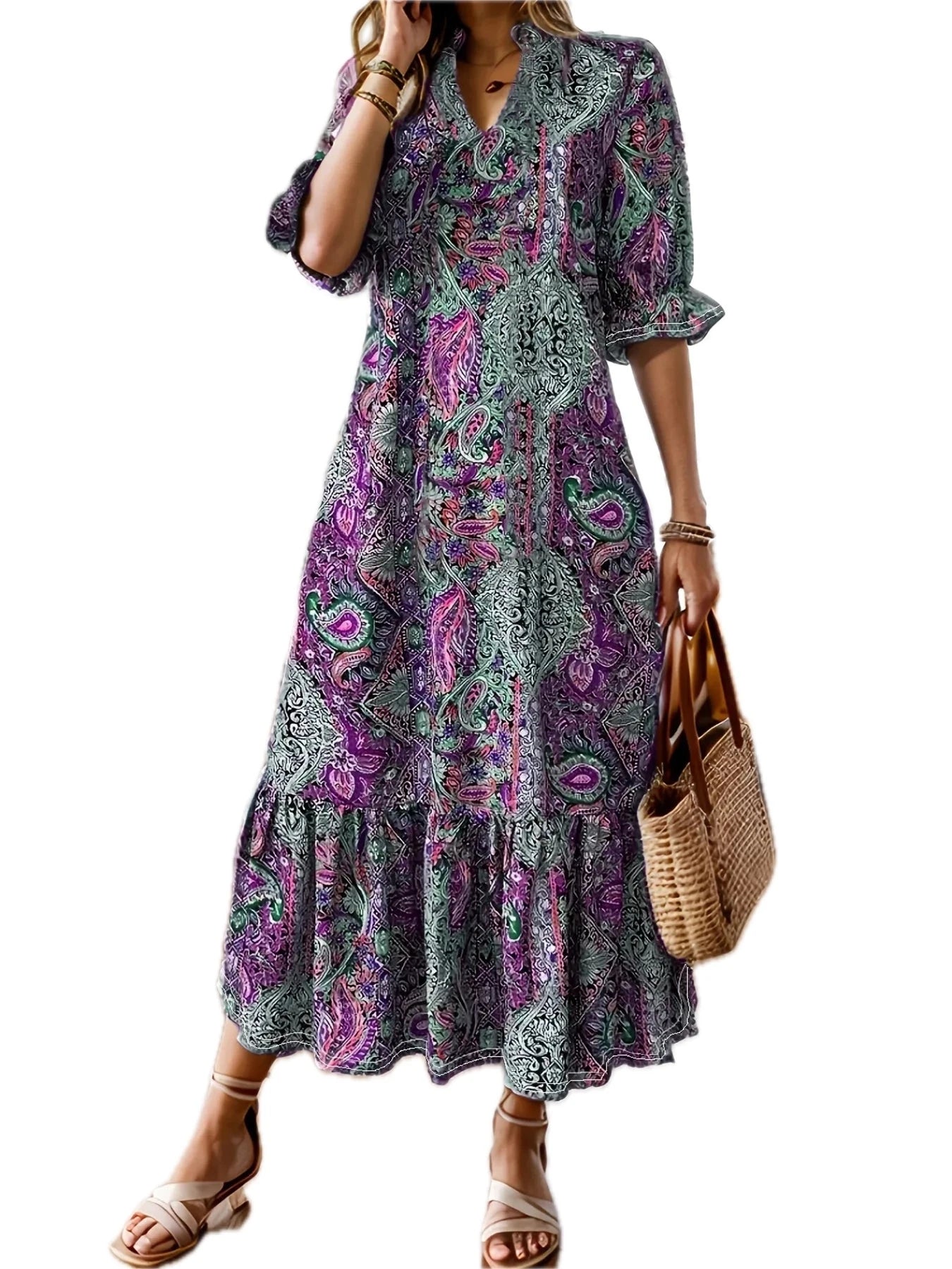 Women's Bohemian Paisley Print Midi Dress with Ruffle Hem Plus Size Full Length 100% Polyester Fabric for Everyday Wear