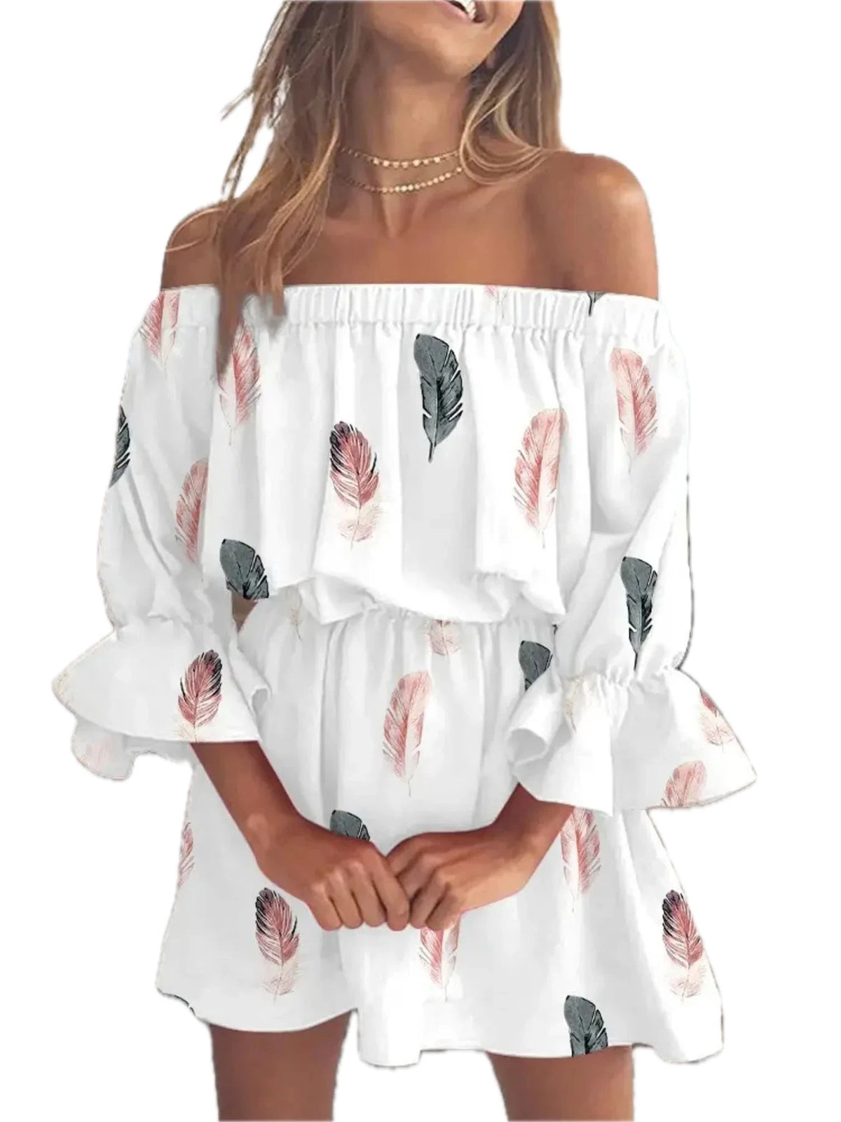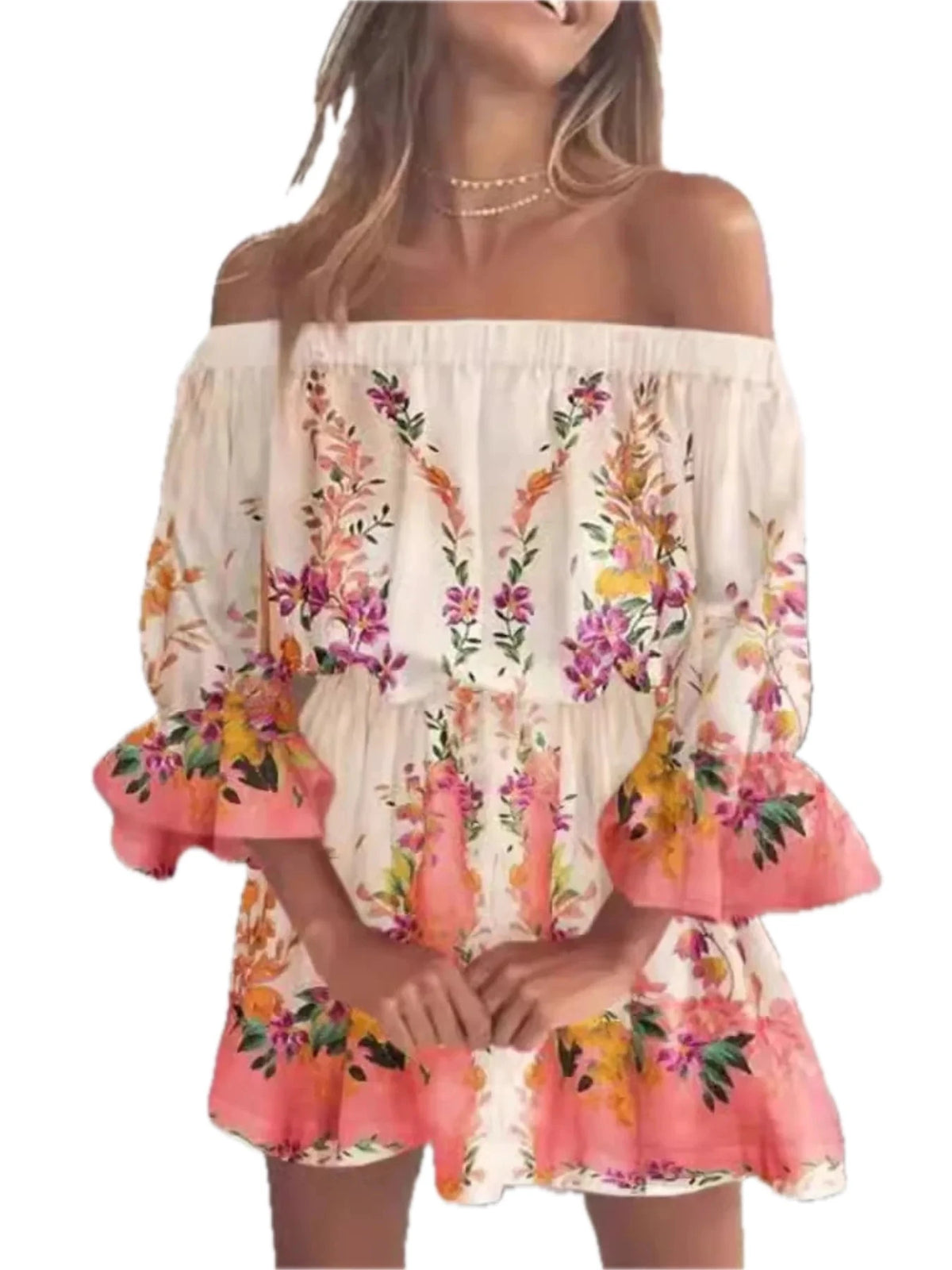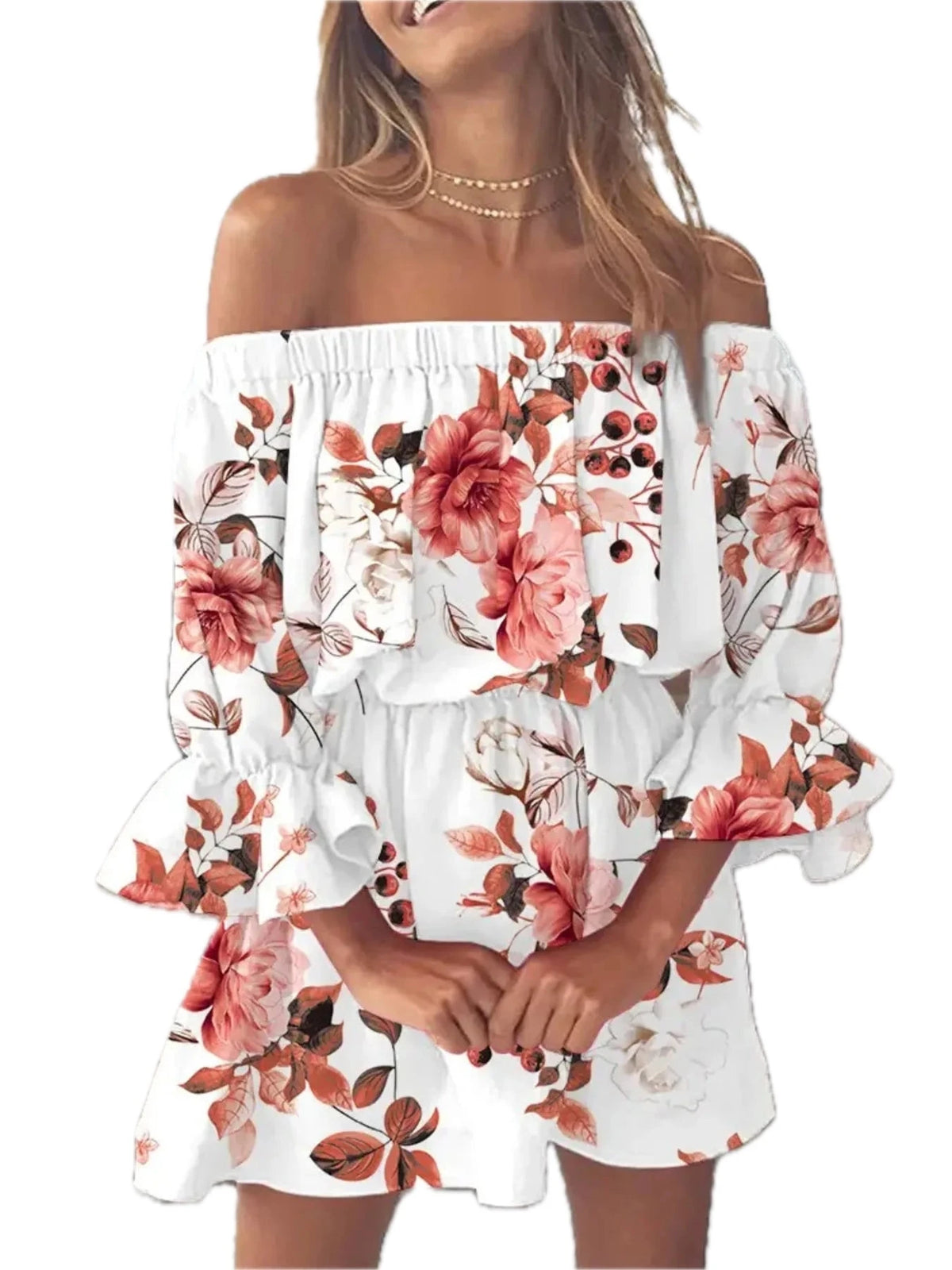 Women's Floral Full Size Off Shoulder Flounce Sleeve Mini Dress Plus Size 100% Polyester Fabric Classic Everyday Wear