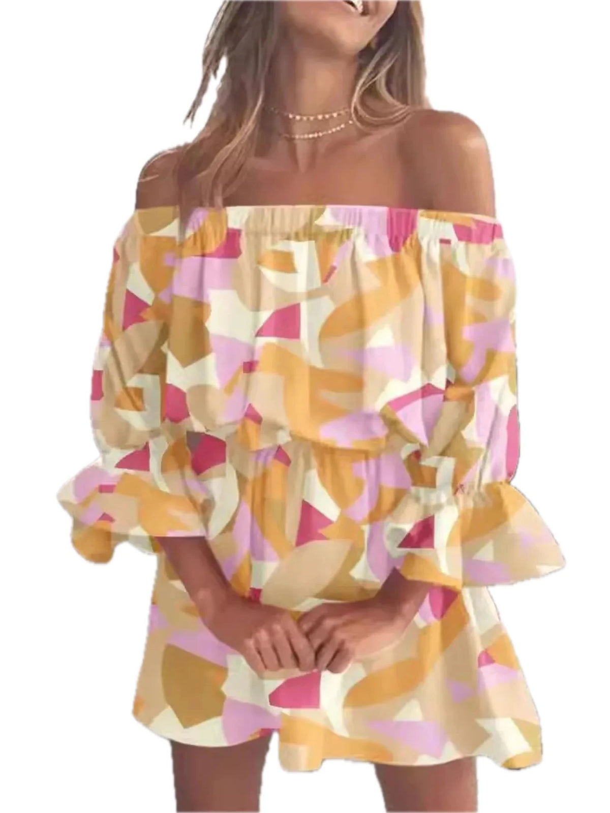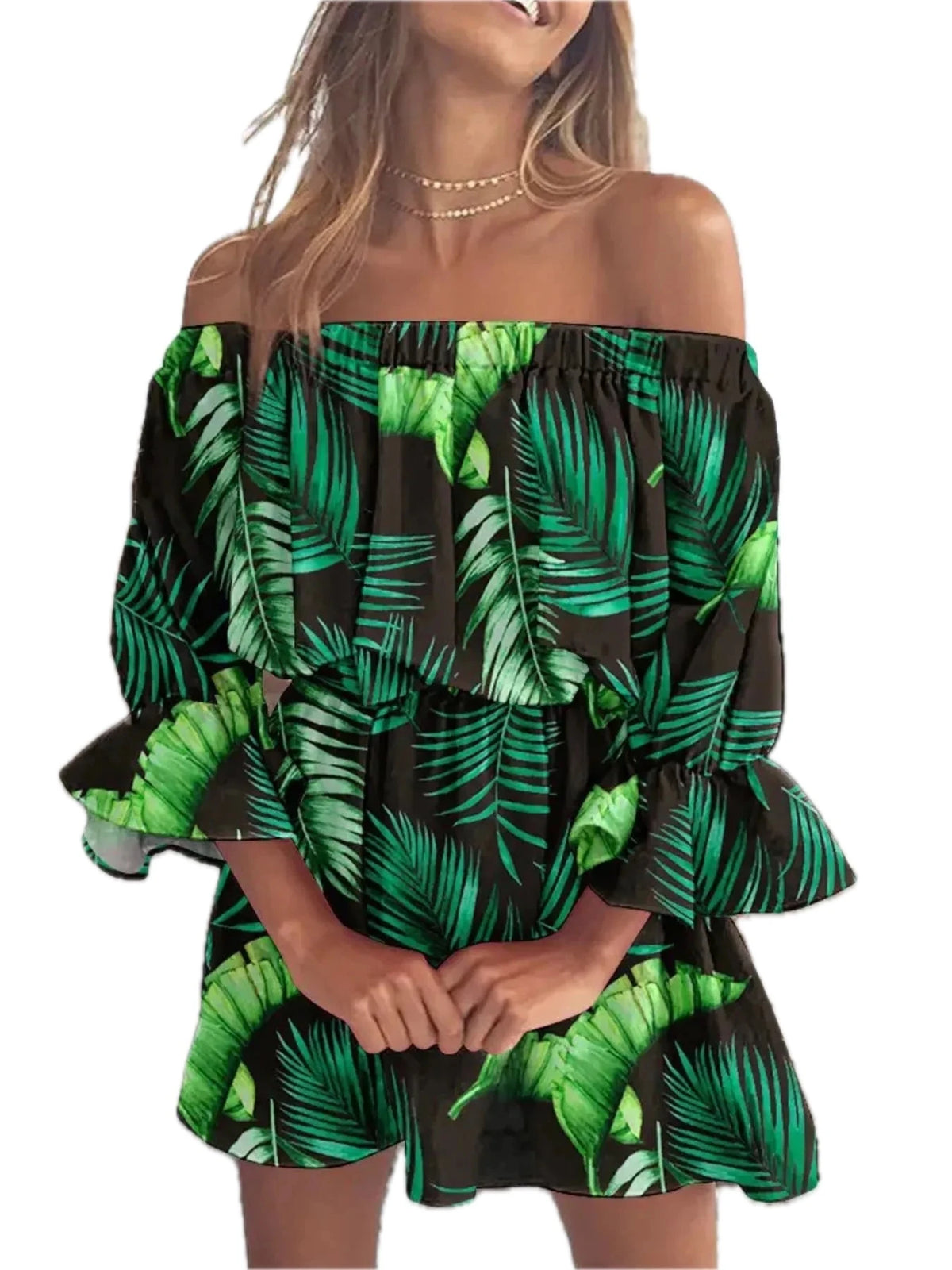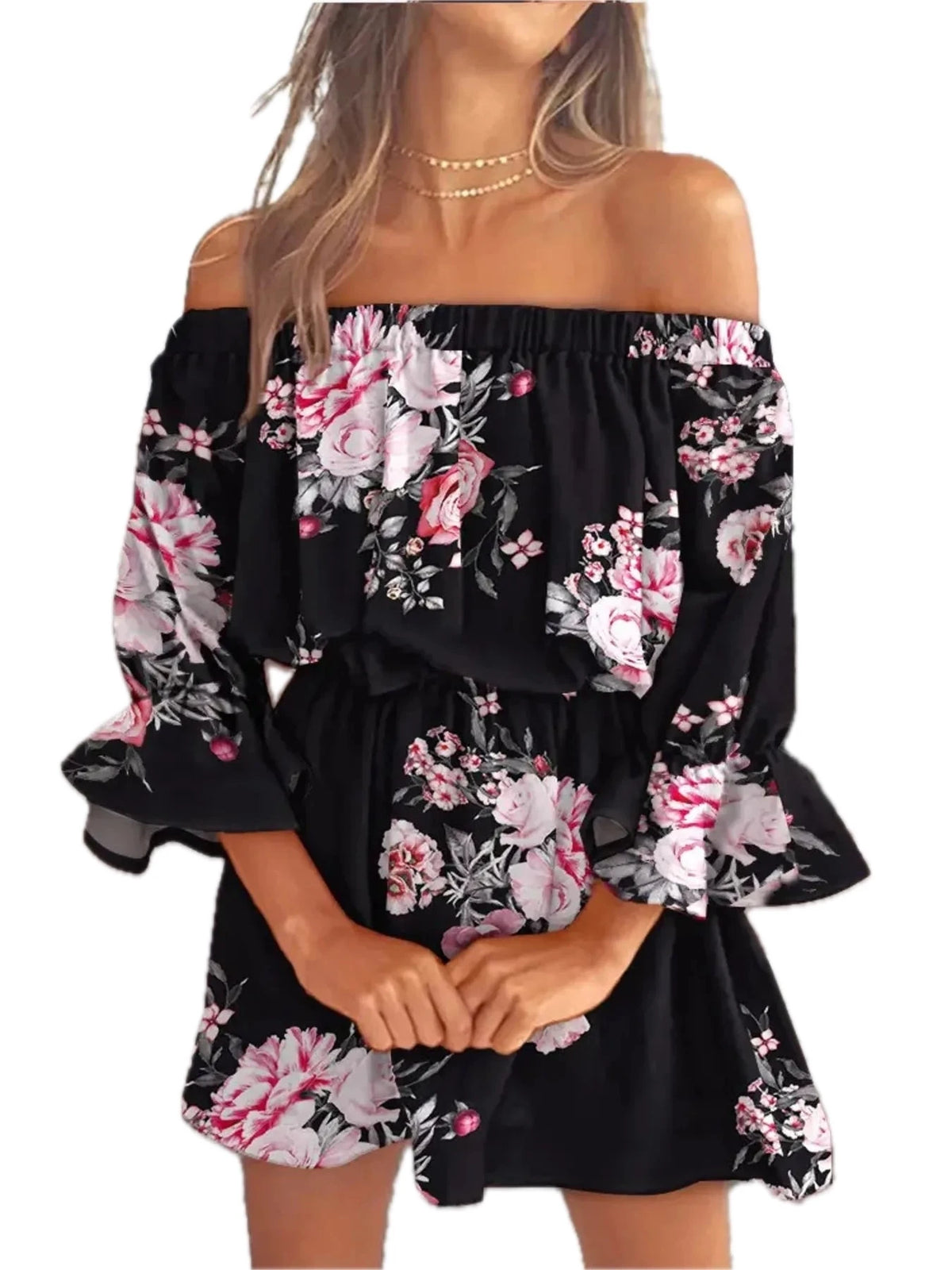 Women's Floral Full Size Off Shoulder Flounce Sleeve Mini Dress Plus Size 100% Polyester Fabric Classic Everyday Wear
