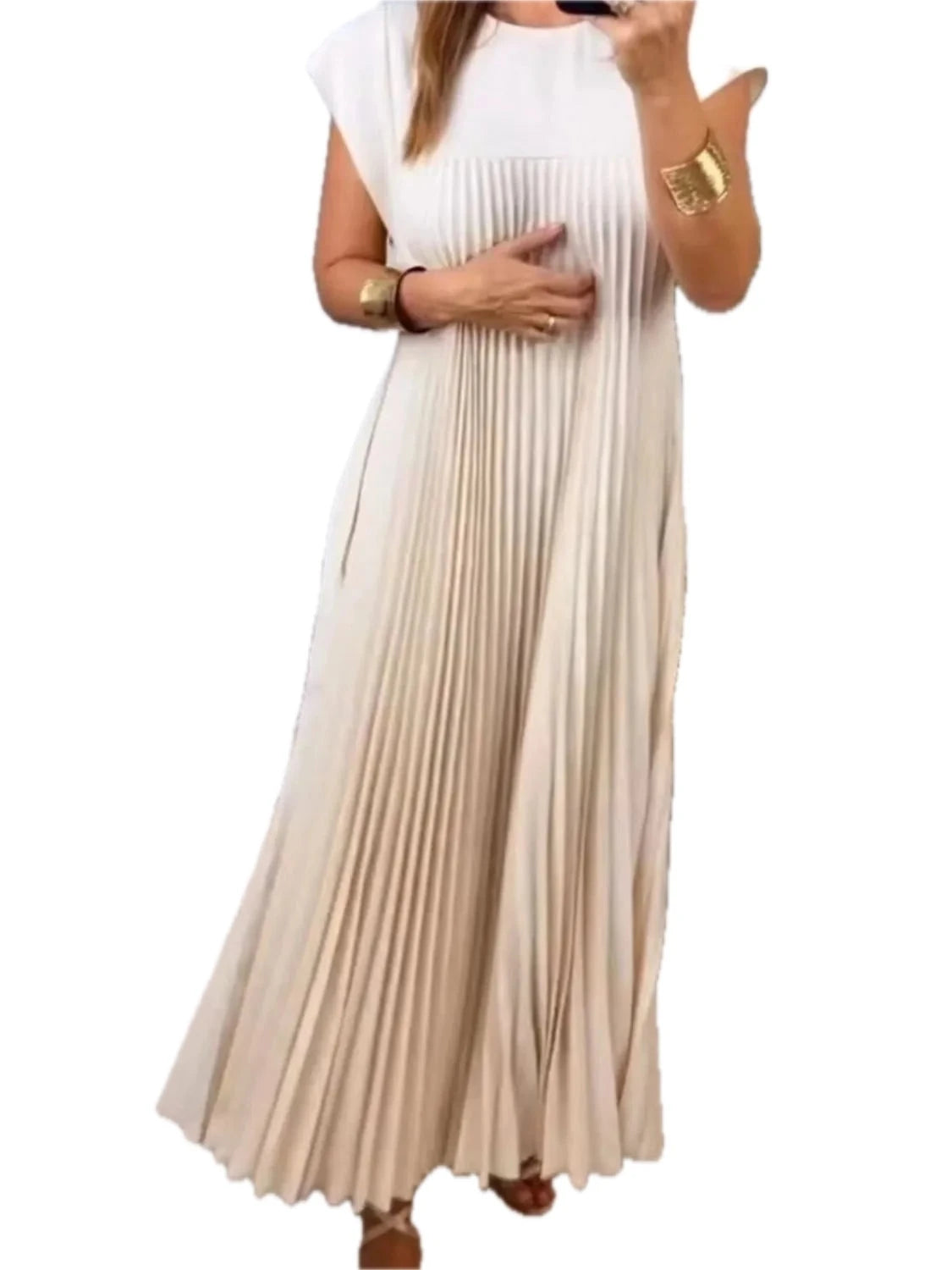 Women's Pleated Round Neck Maxi Dress 100% Polyester Plus Size Full Length Evening Gown Lightweight Easy Care