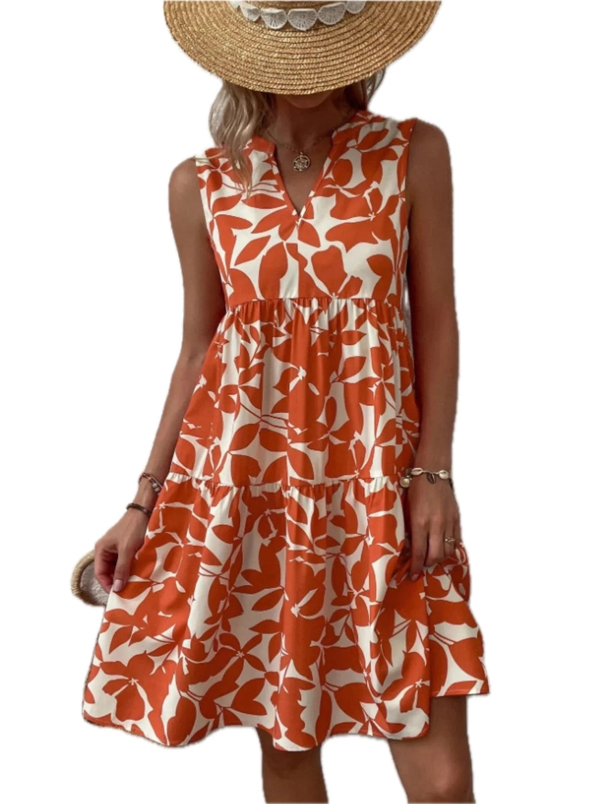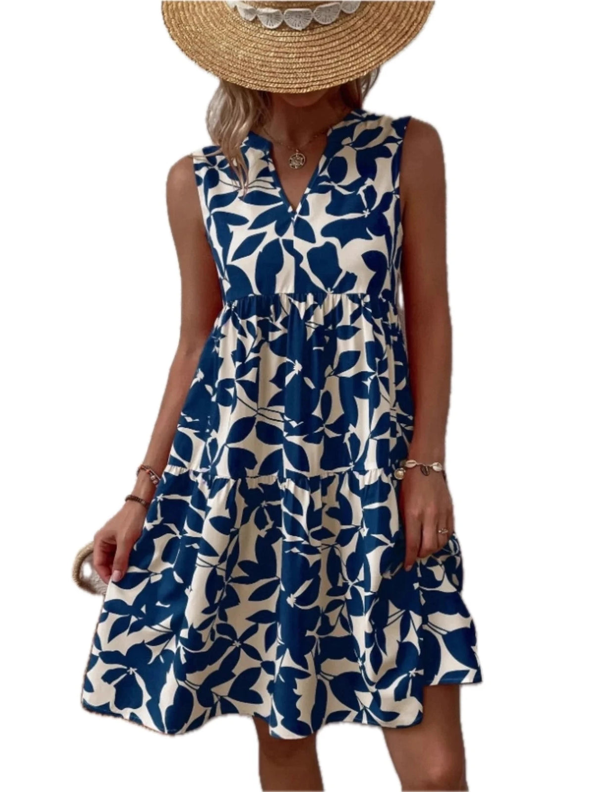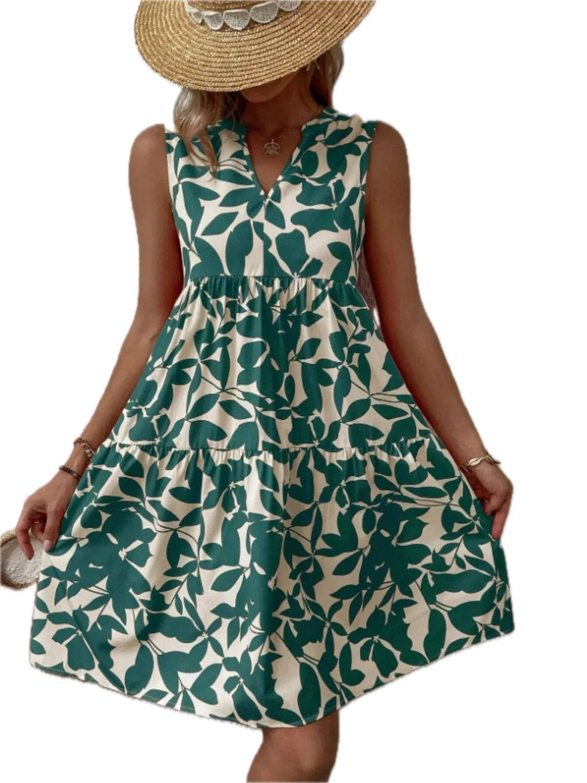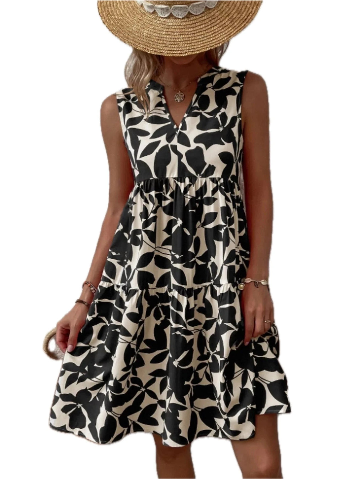 Women's Sleeveless Printed Notched Mini Dress Full Size Tiered Ruffle Dress Plus Size 100% polyester Soft Comfortable