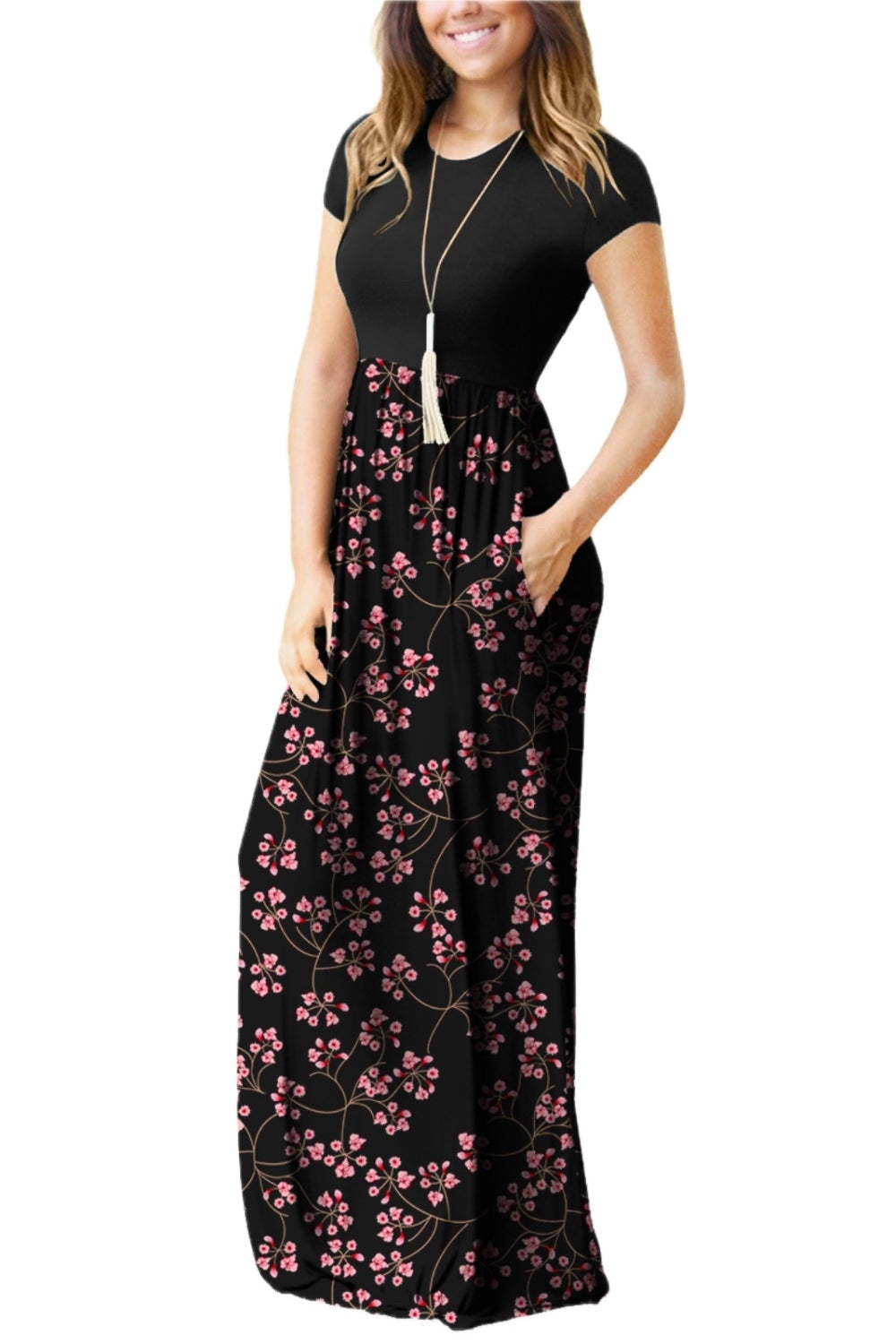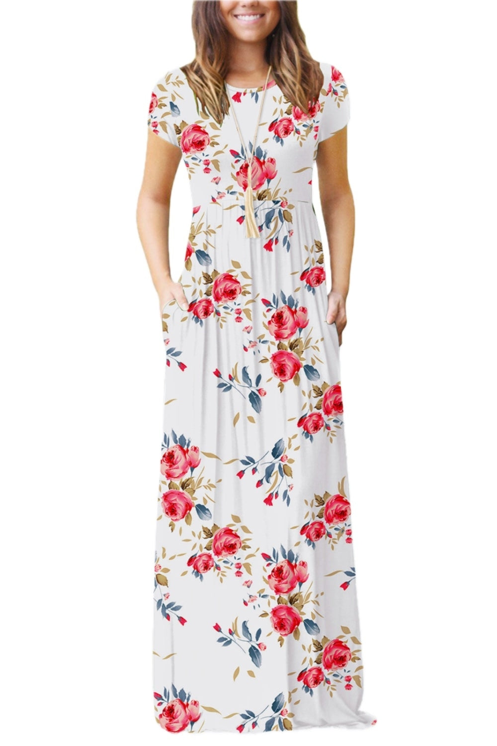 Women's Floral Printed Round Neck Short Sleeve Dress with Pockets For Everyday Wear Comfortable Fit 95% rayon 5% spandex
