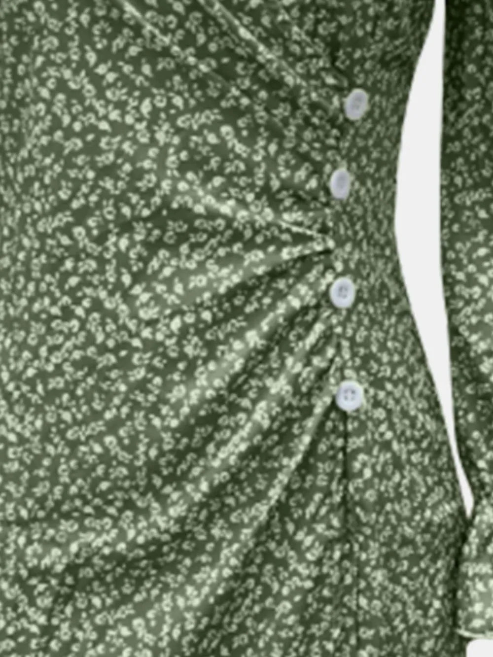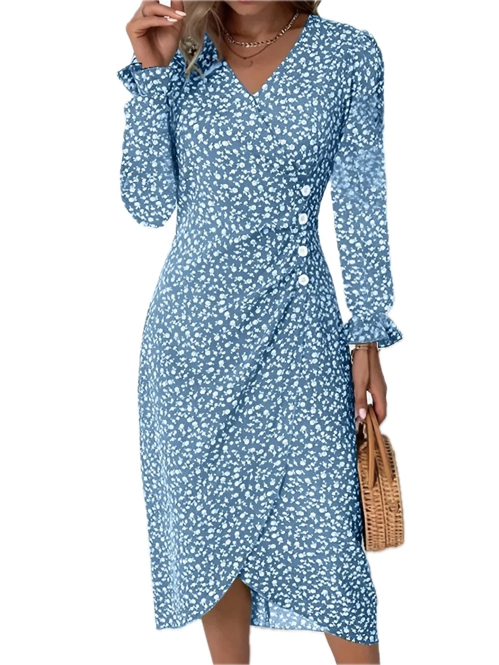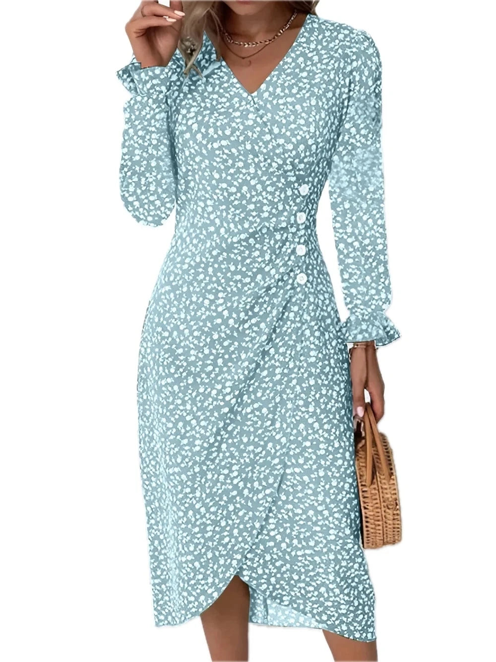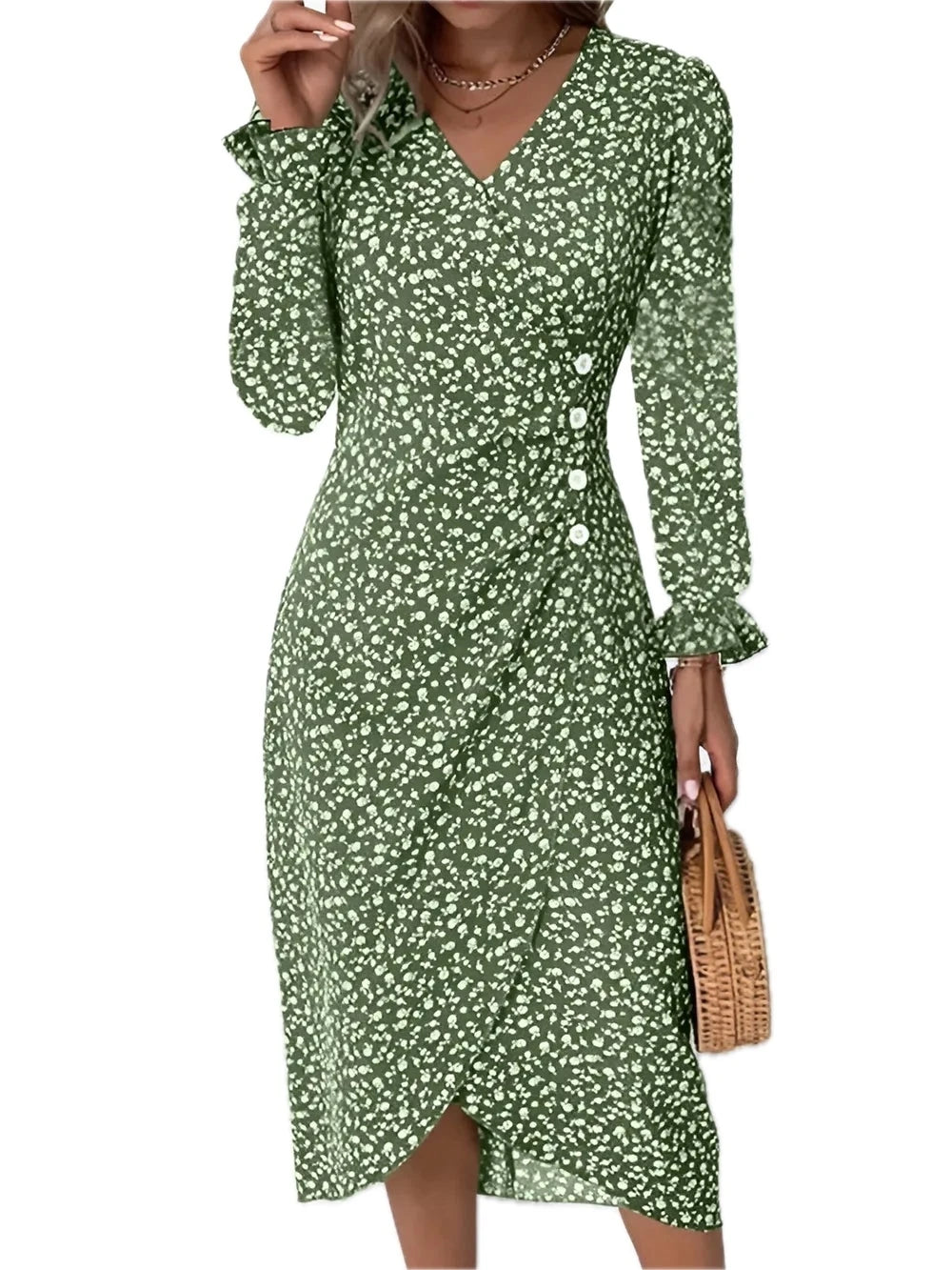 Women's Surplice Midi Dress with Long Sleeve Ruffled Sheer Details Decorative Button 100% Polyester for Everyday Wear