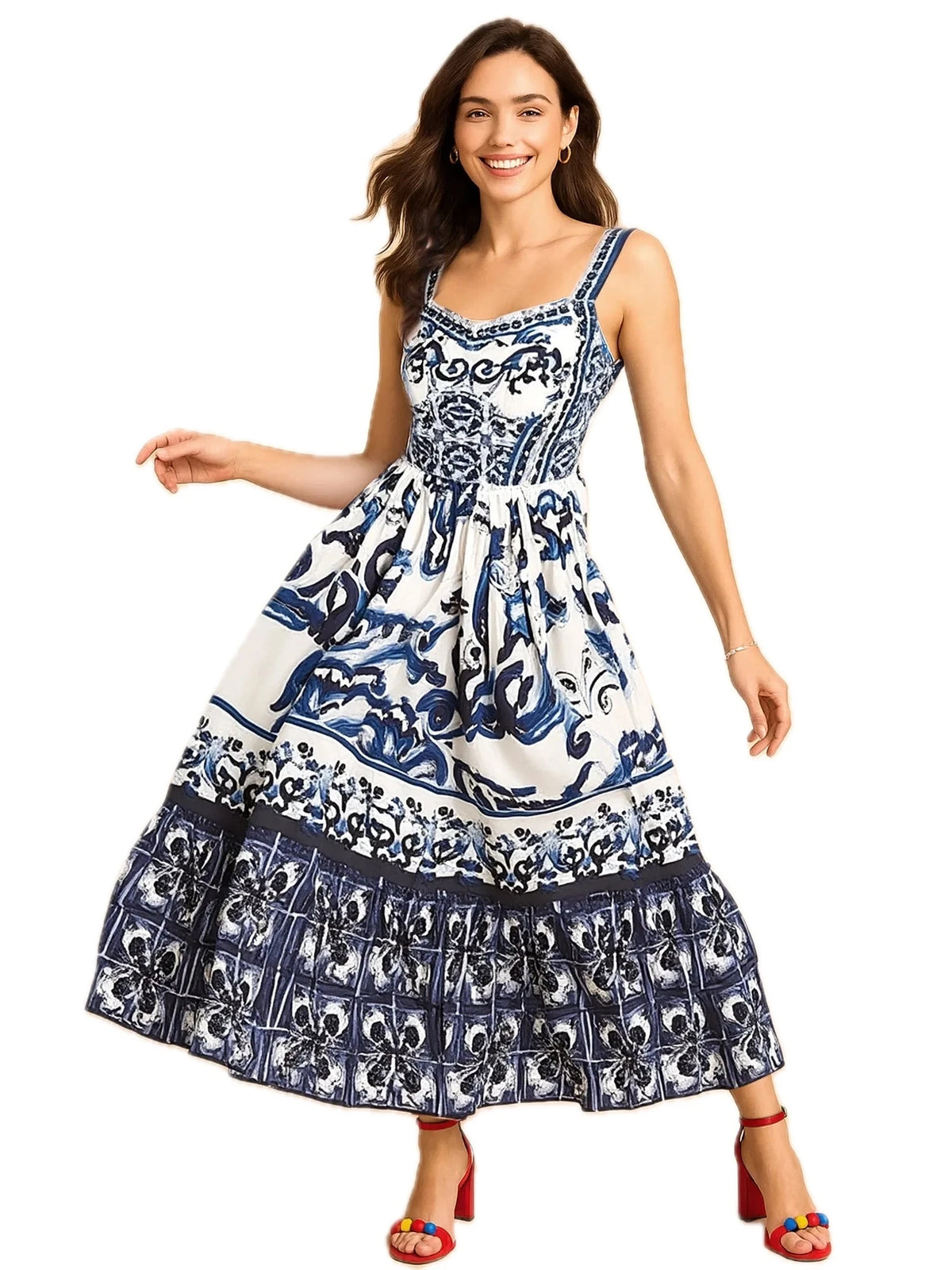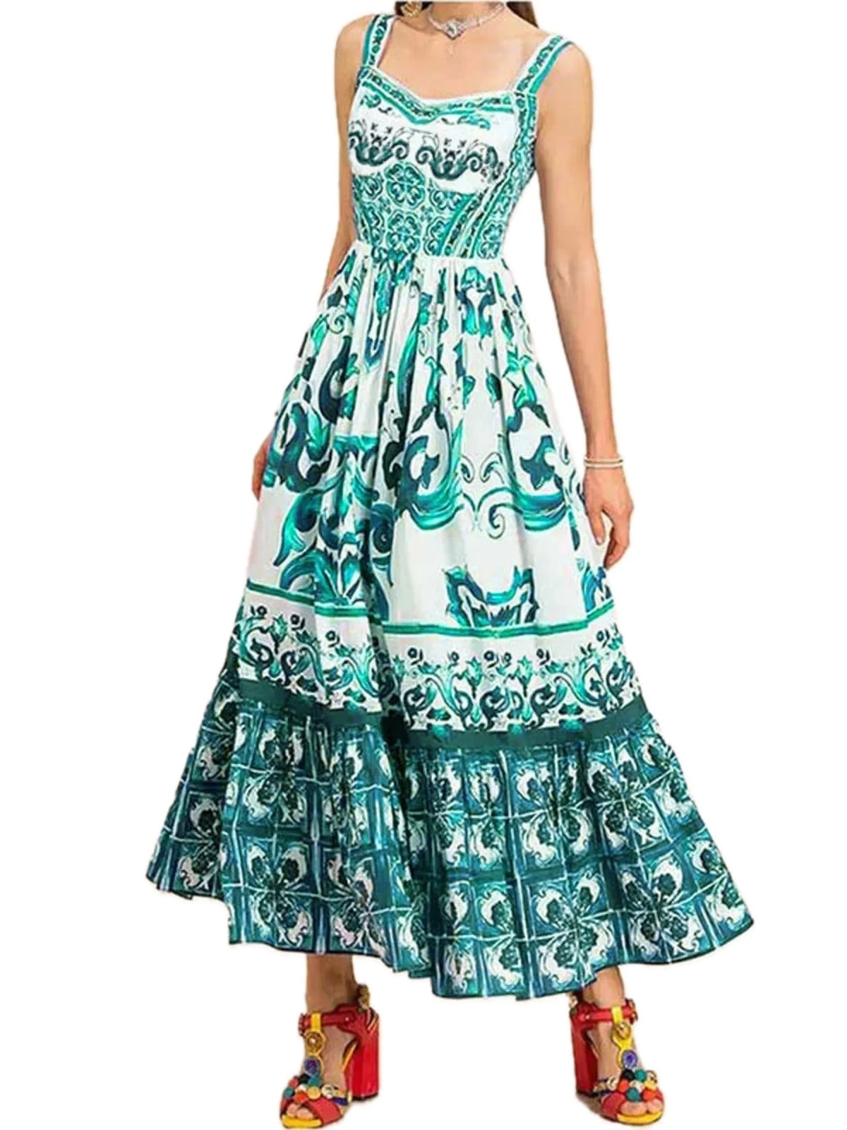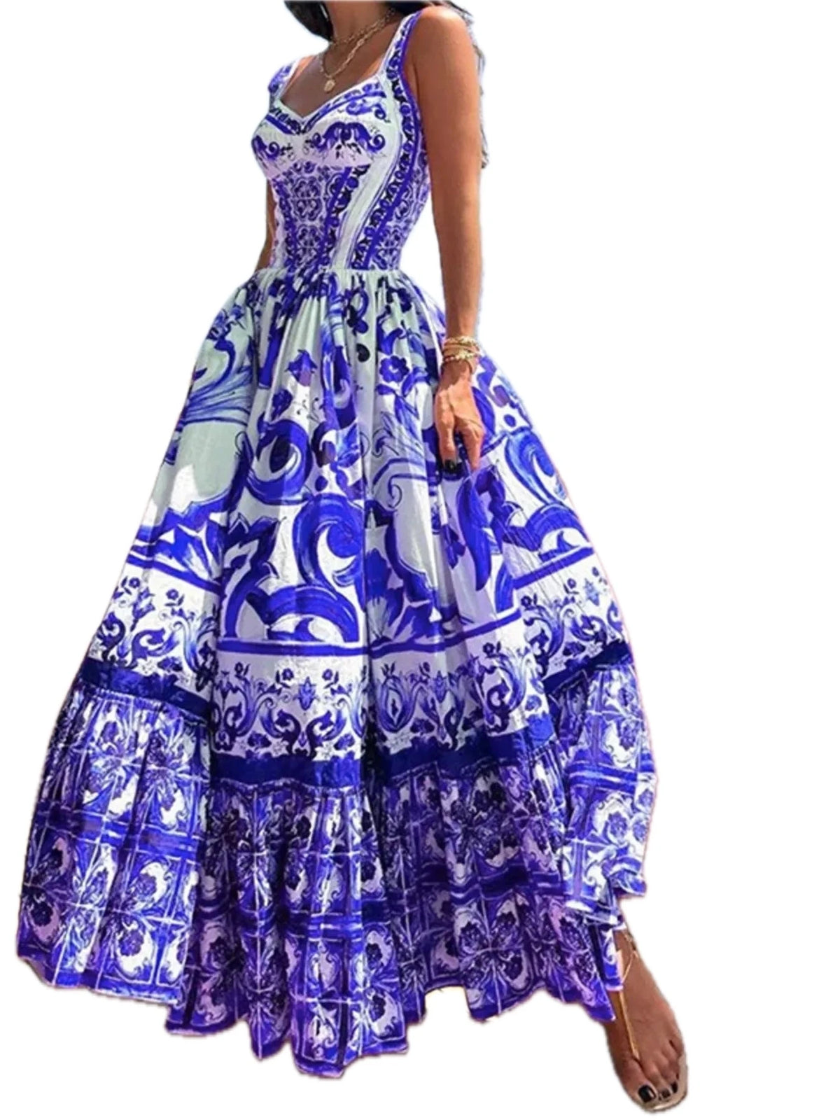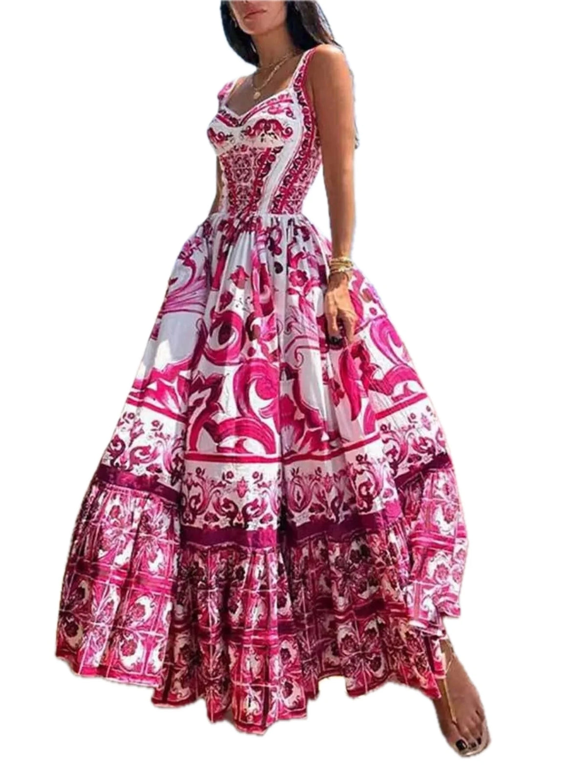 Women's Full Size Printed Sweetheart Neck Maxi Cami Dress Plus Size Tiered Ruffle Smocked Look 100% Polyester Style