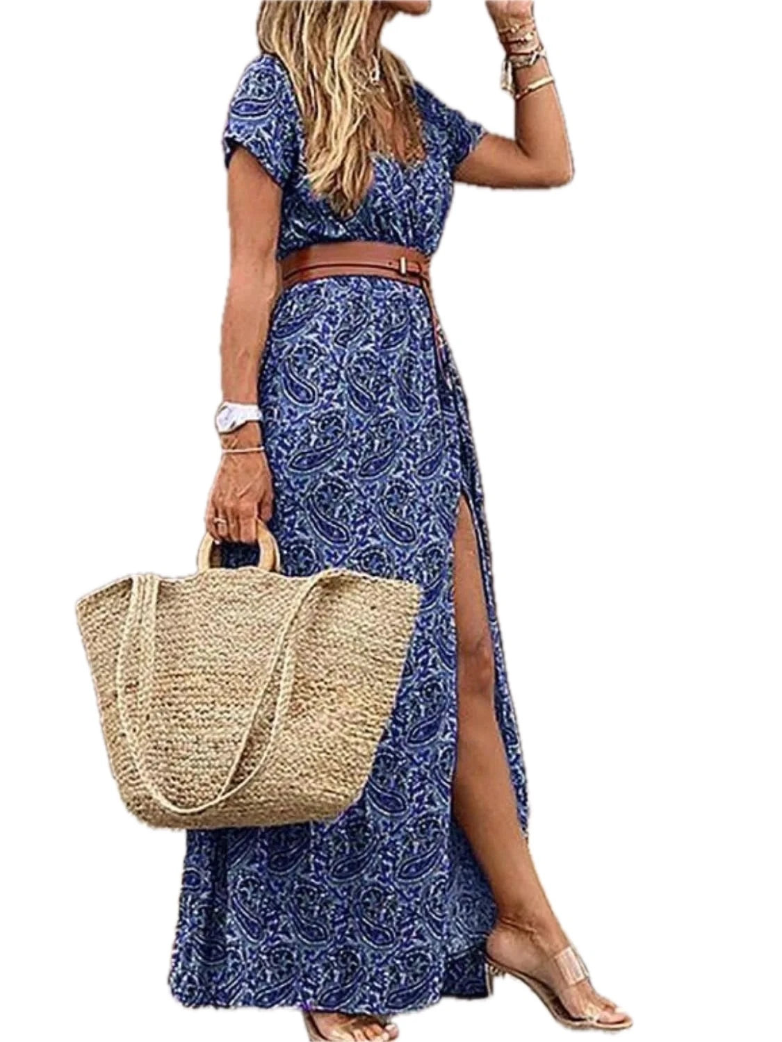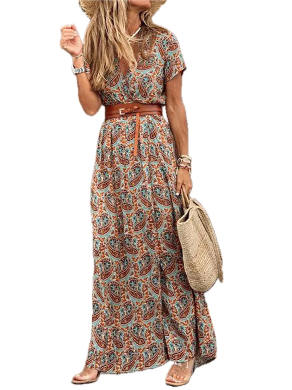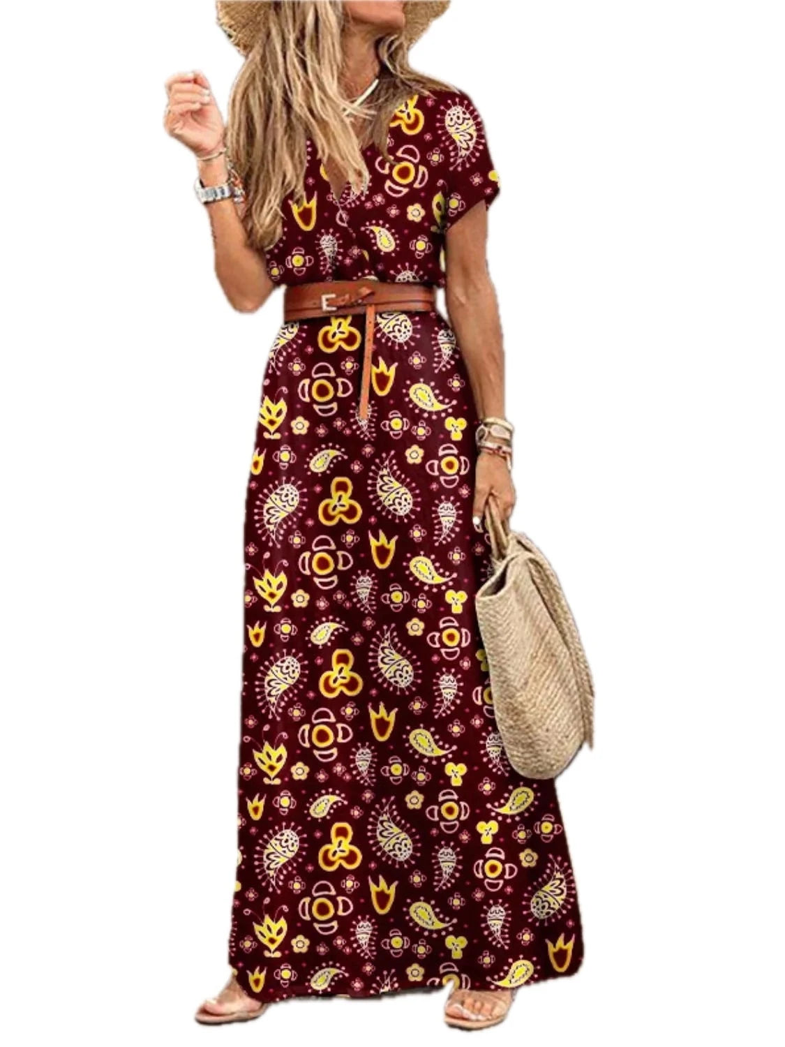 Women's Printed V Neck Short Sleeve Maxi Dress Belted with Pockets Plus Size Full Length 100% Polyester Fabric Comfort