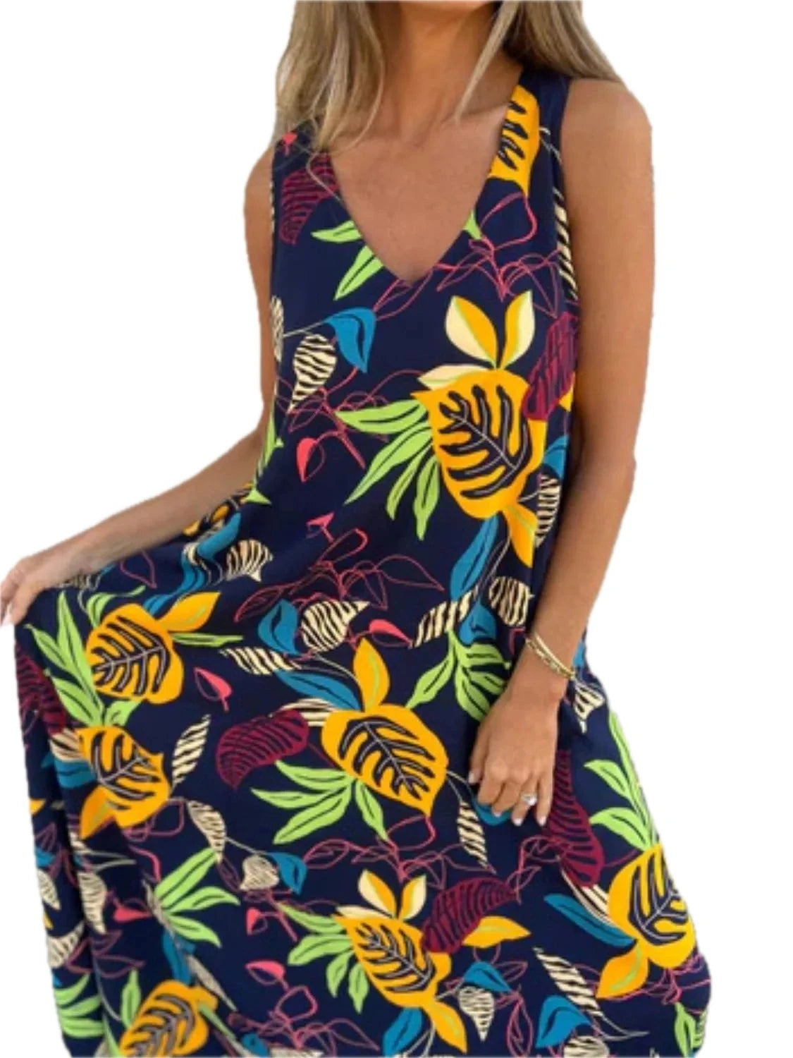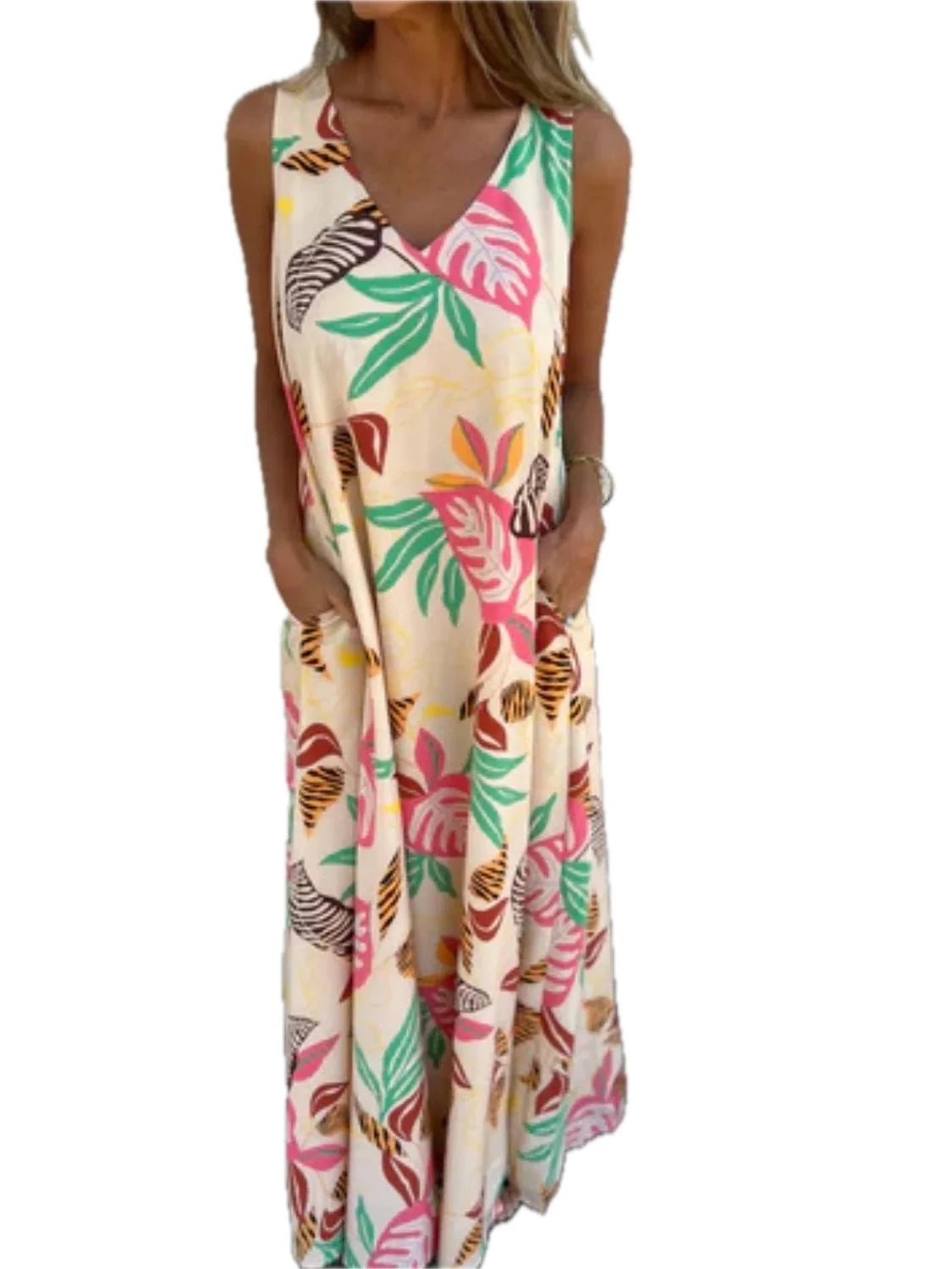 Women's Full Size Printed V Neck Sleeveless Dress with 100% Polyester Fabric Plus Size Everyday Wear Ideal for Travel