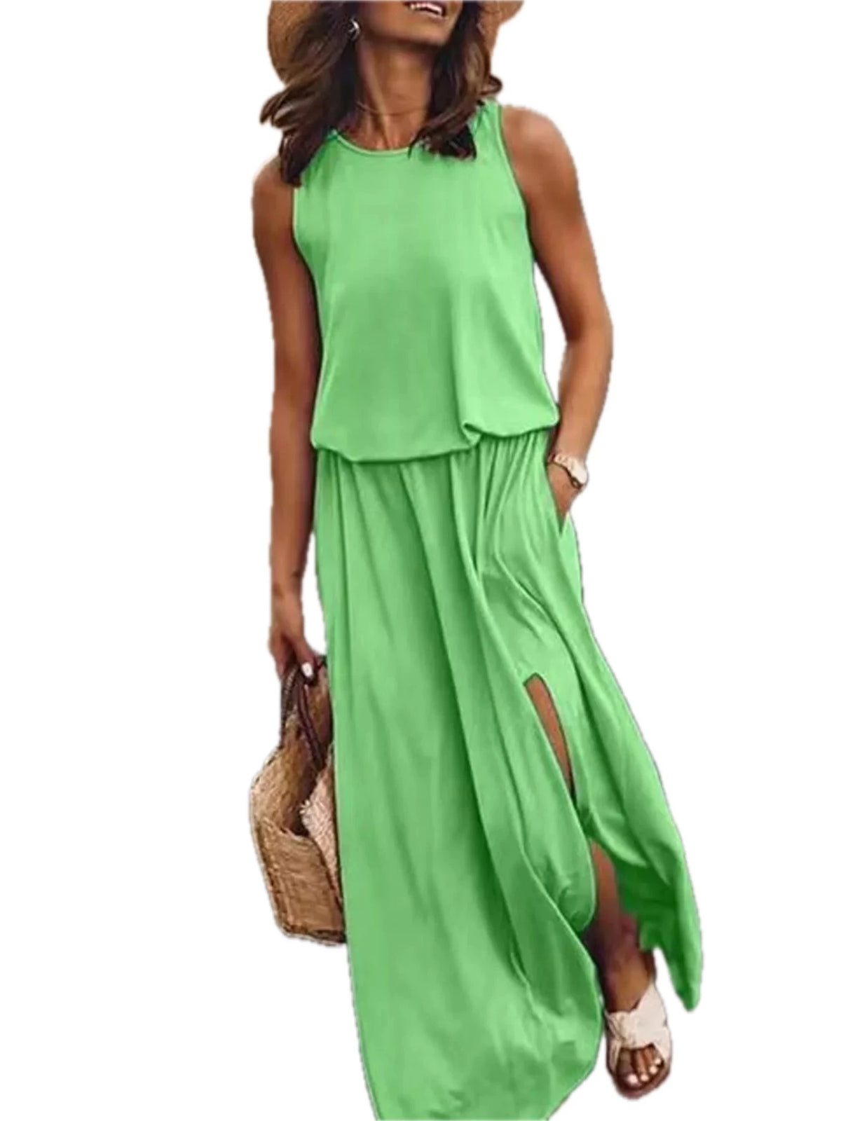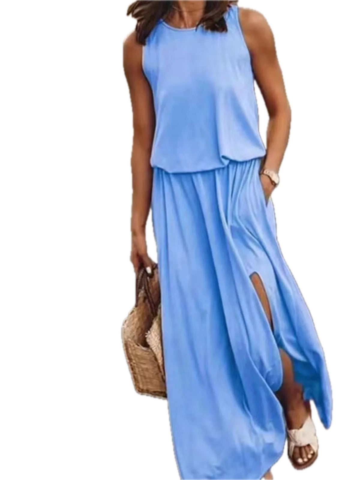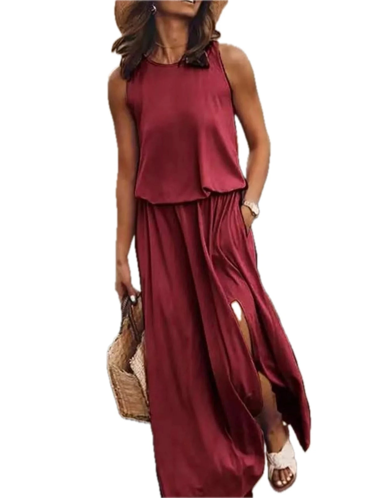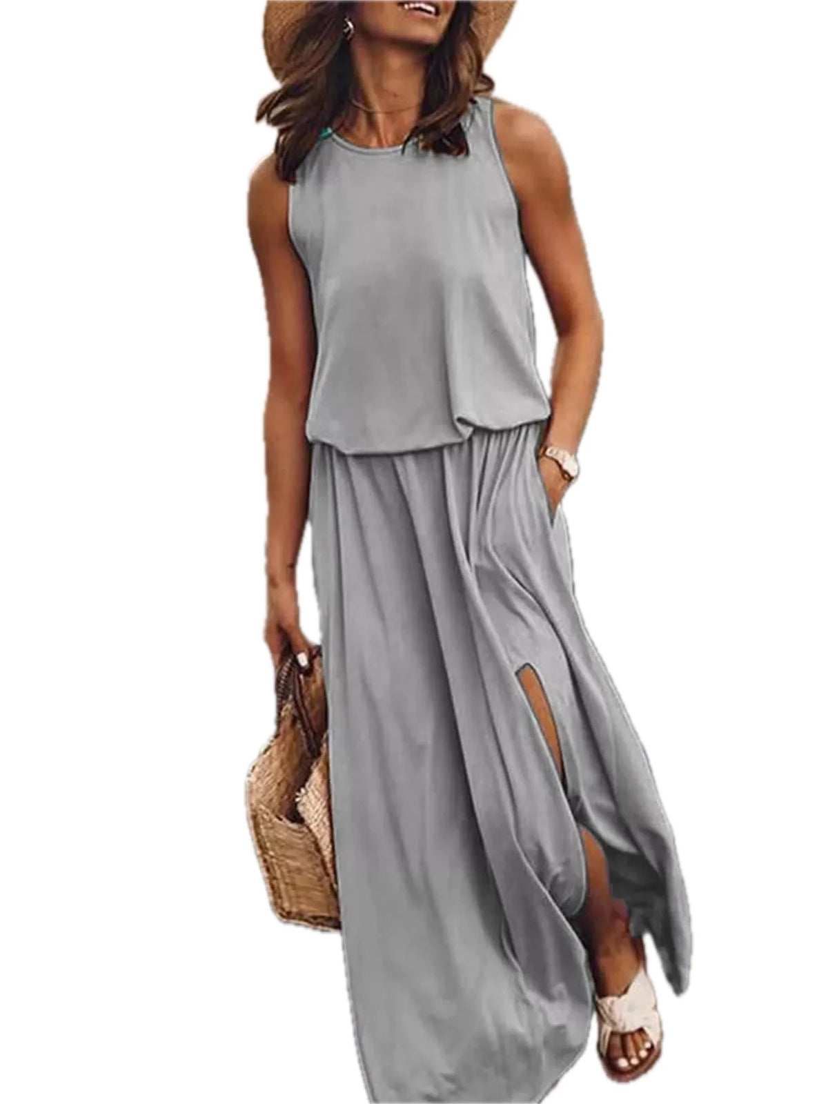 Women's Plus Size Round Neck Sleeveless Slit Maxi Dress with Pockets 95% polyester and 5% spandex Soft Breathable