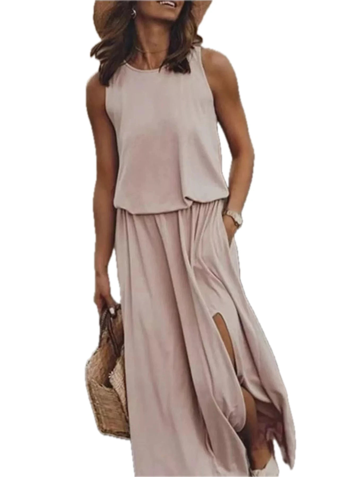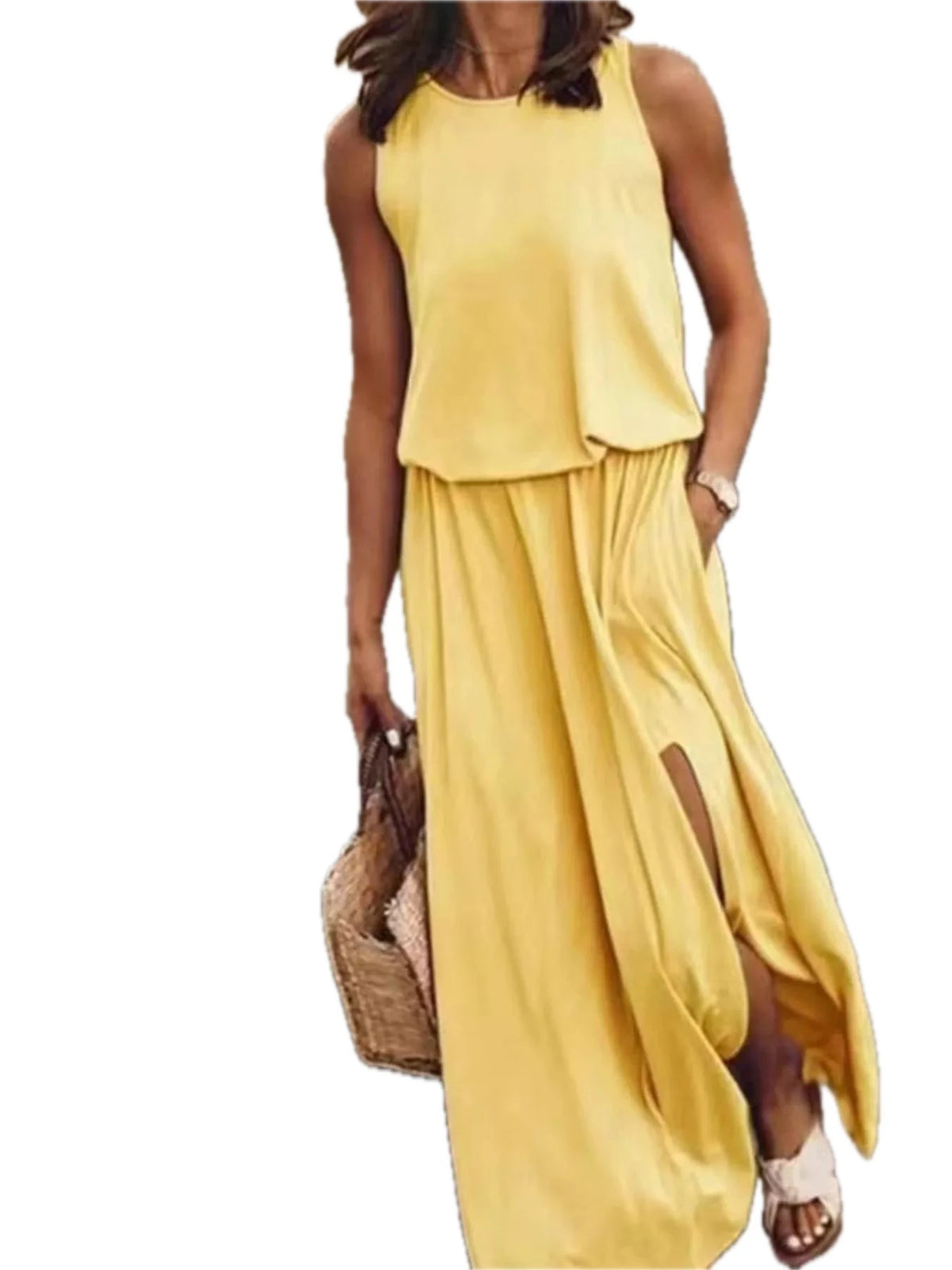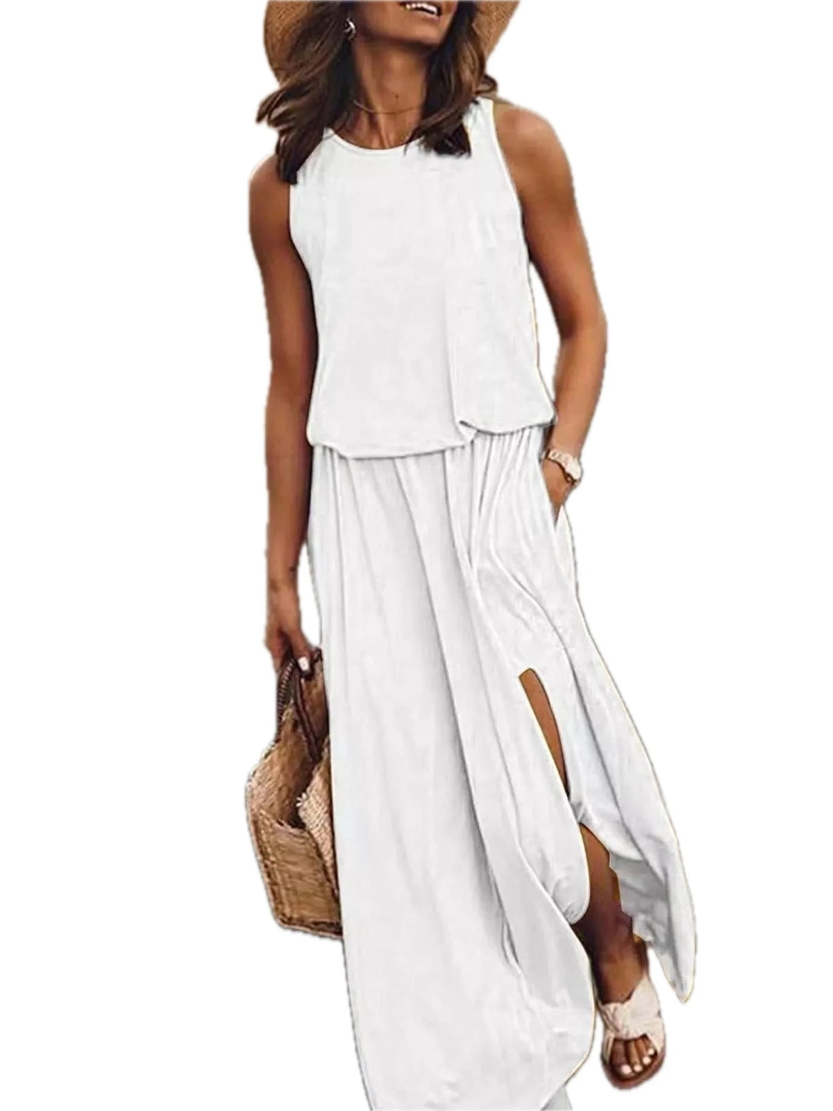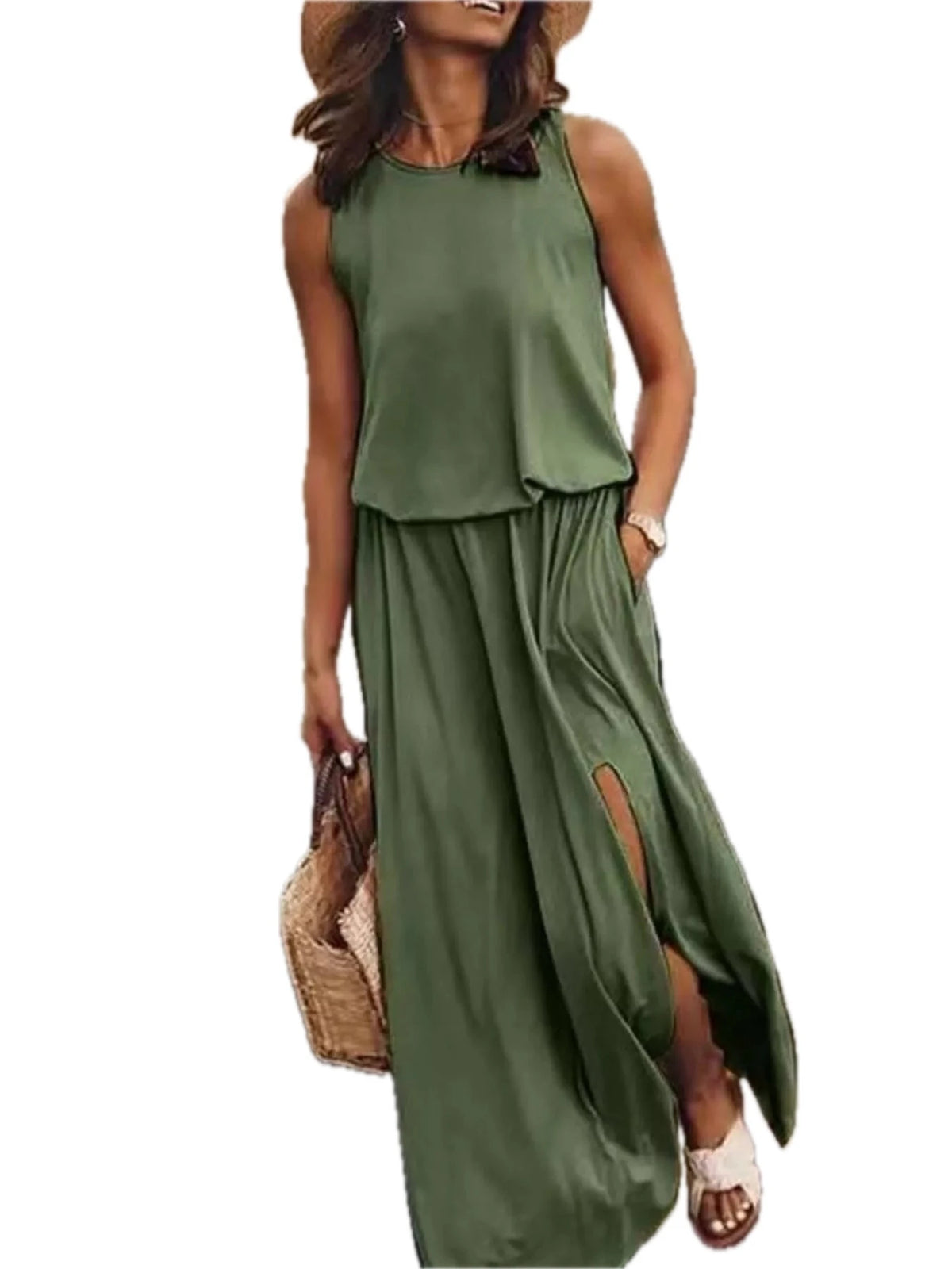 Women's Plus Size Round Neck Sleeveless Slit Maxi Dress with Pockets 95% polyester and 5% spandex Soft Breathable