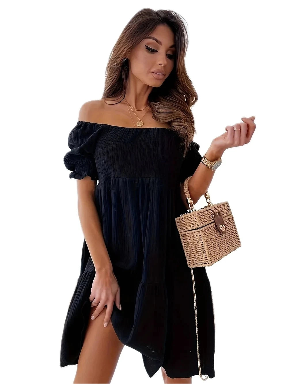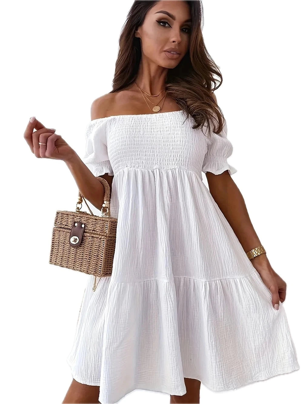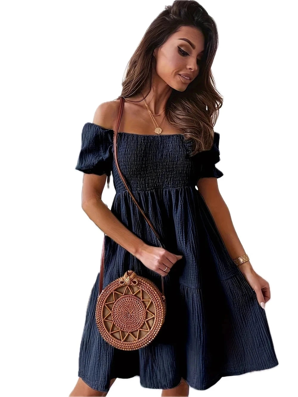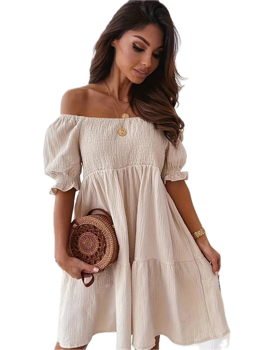 Women's Full Size Ruffled Off Shoulder Short Sleeve Dress with Ruched Sheer Overlay and Opaque Stretch Fabric