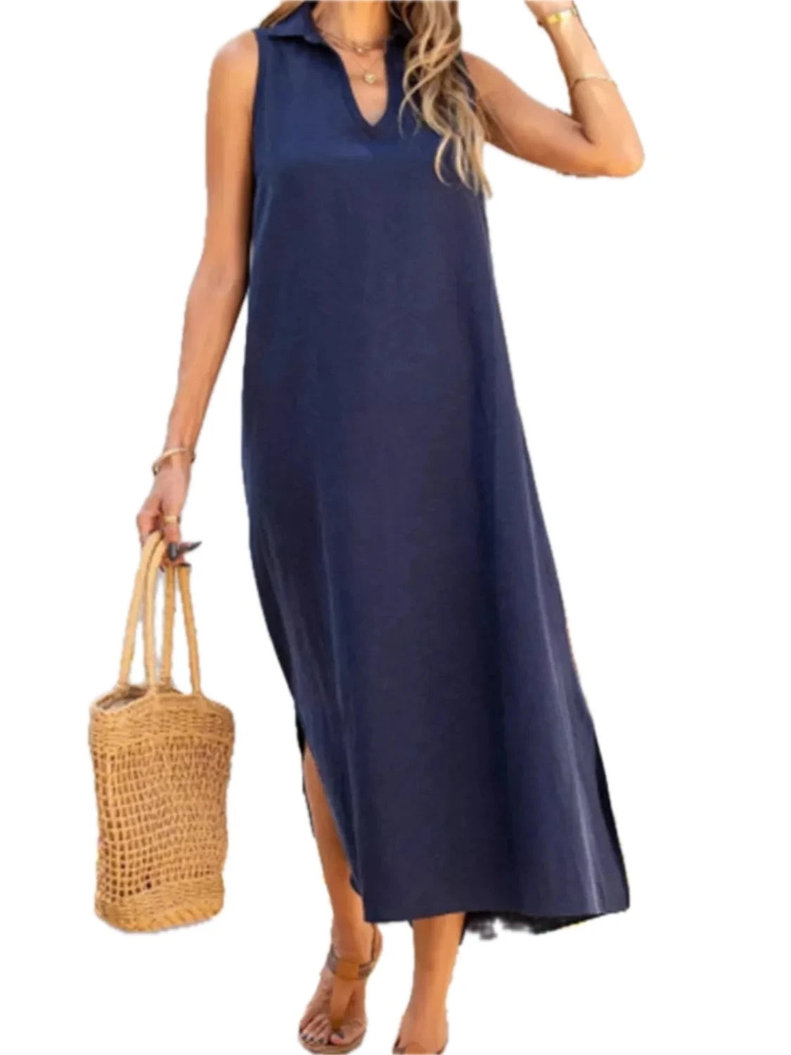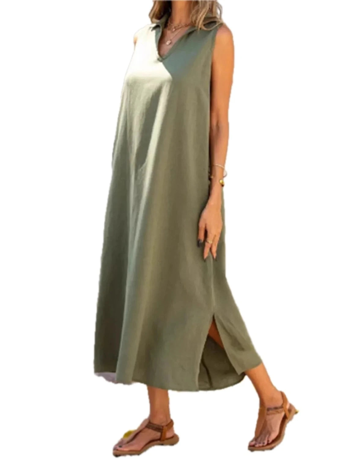 Womens Sleeveless Midi Dress with Side Slit in 100% Polyester Fabric for Plus Size Everyday Wear for flattering fit