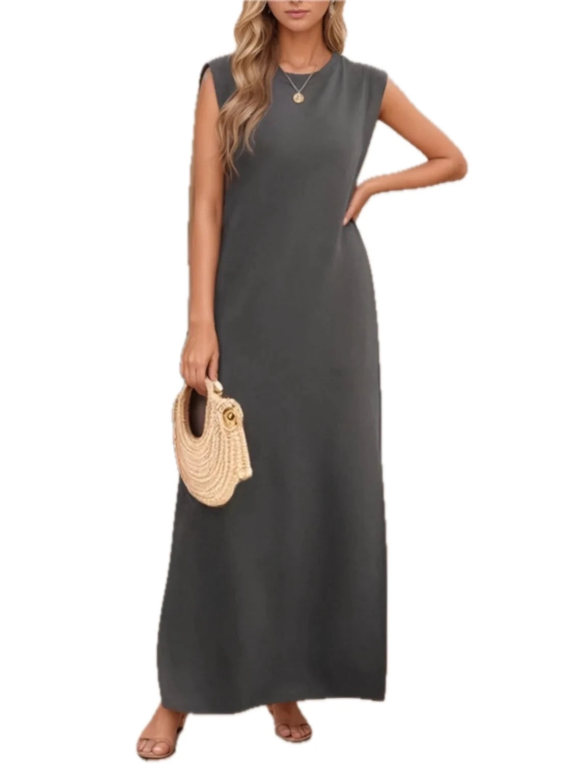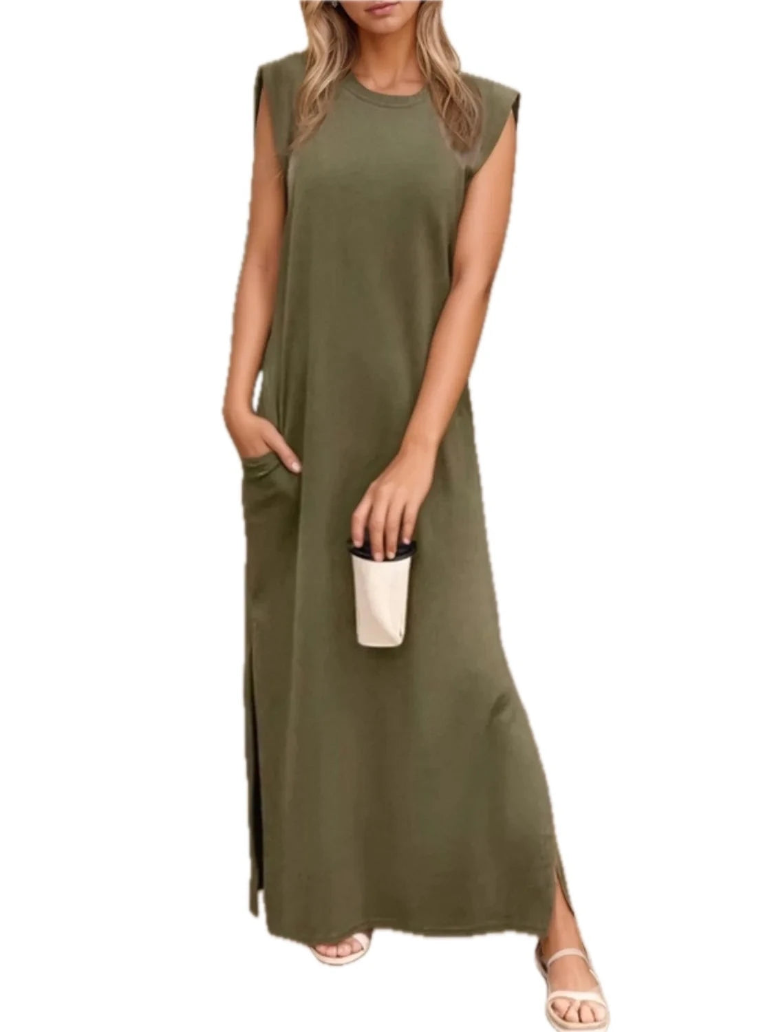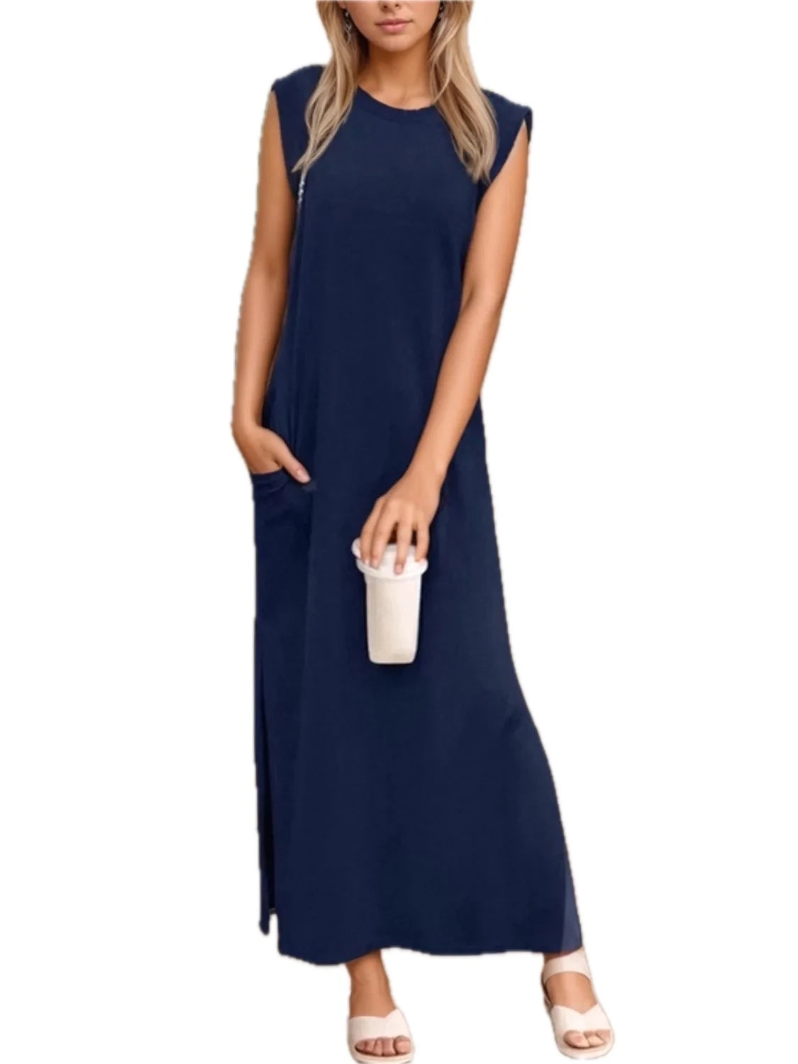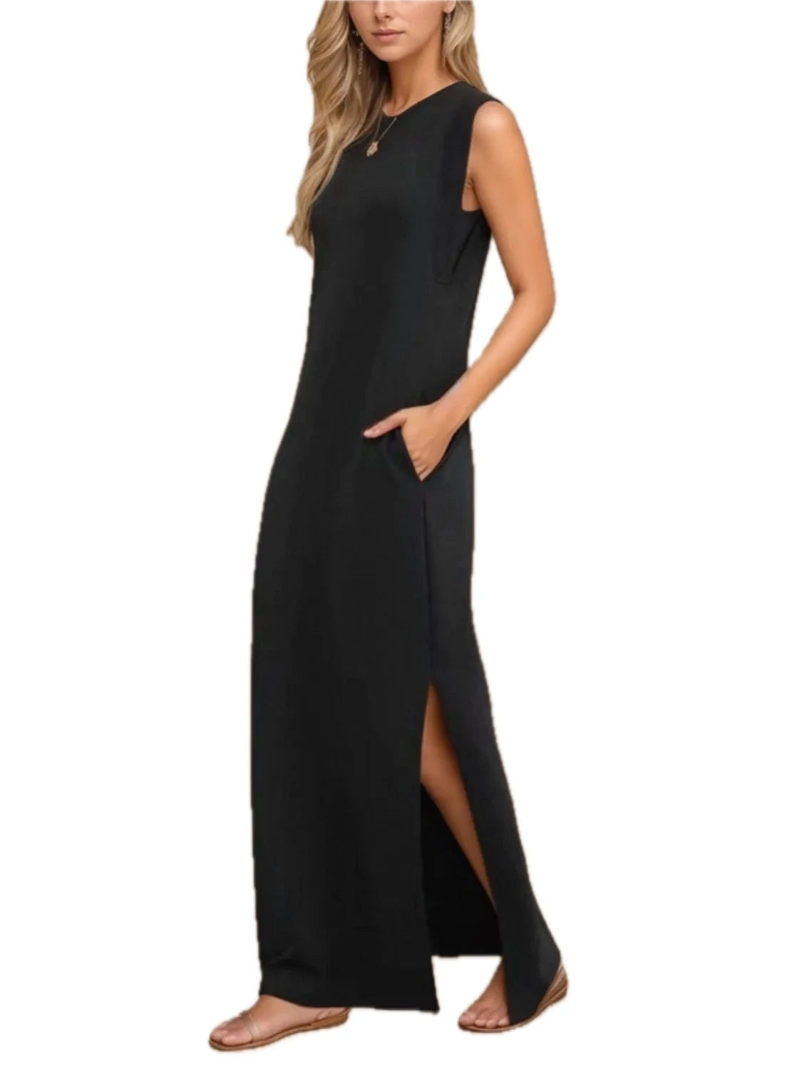 Women's Maxi Tank Dress with Round Neck and Slit Full Length Sleeveless Pocketed Plus Size 95% Polyester 5% Spandex