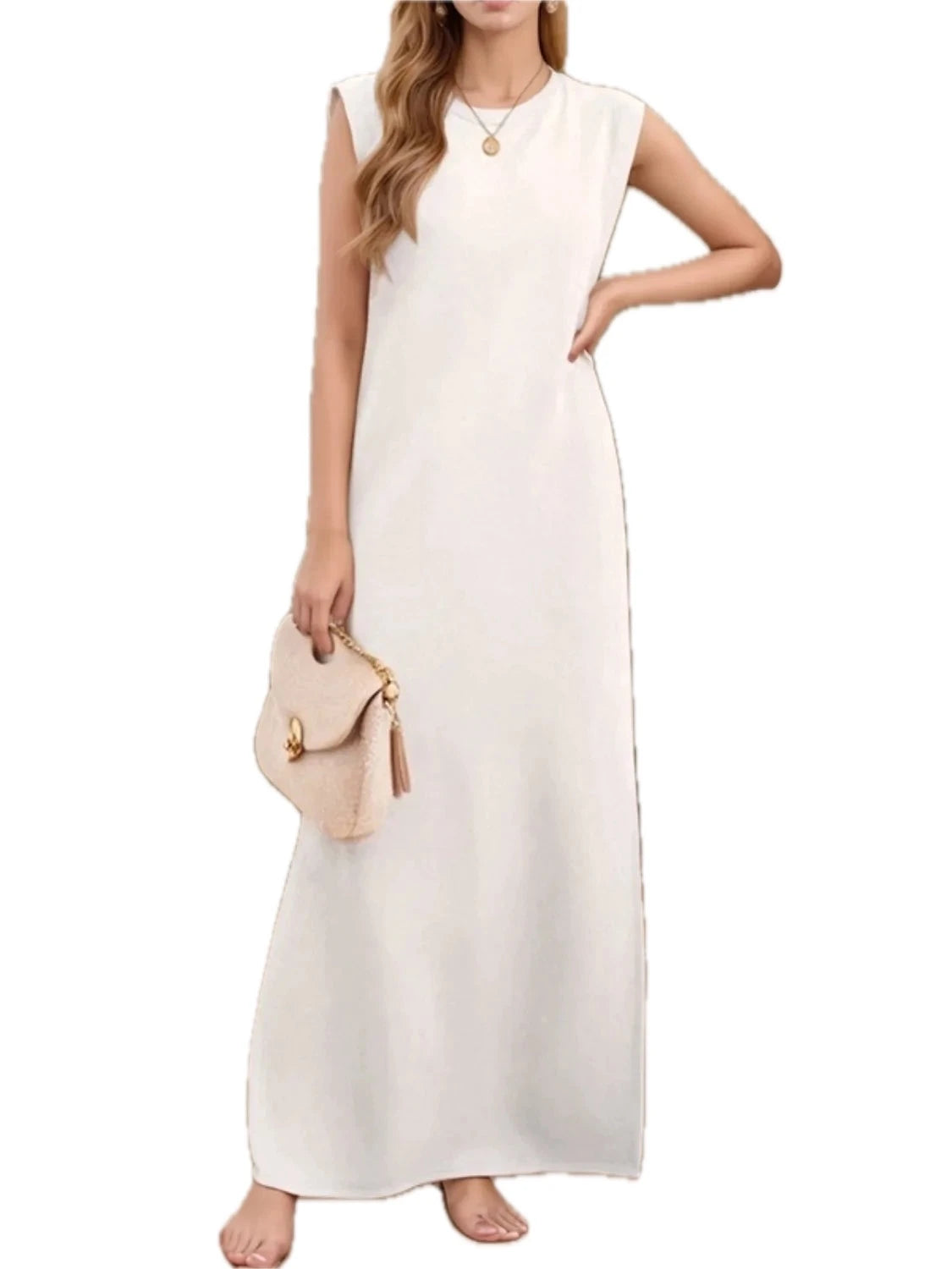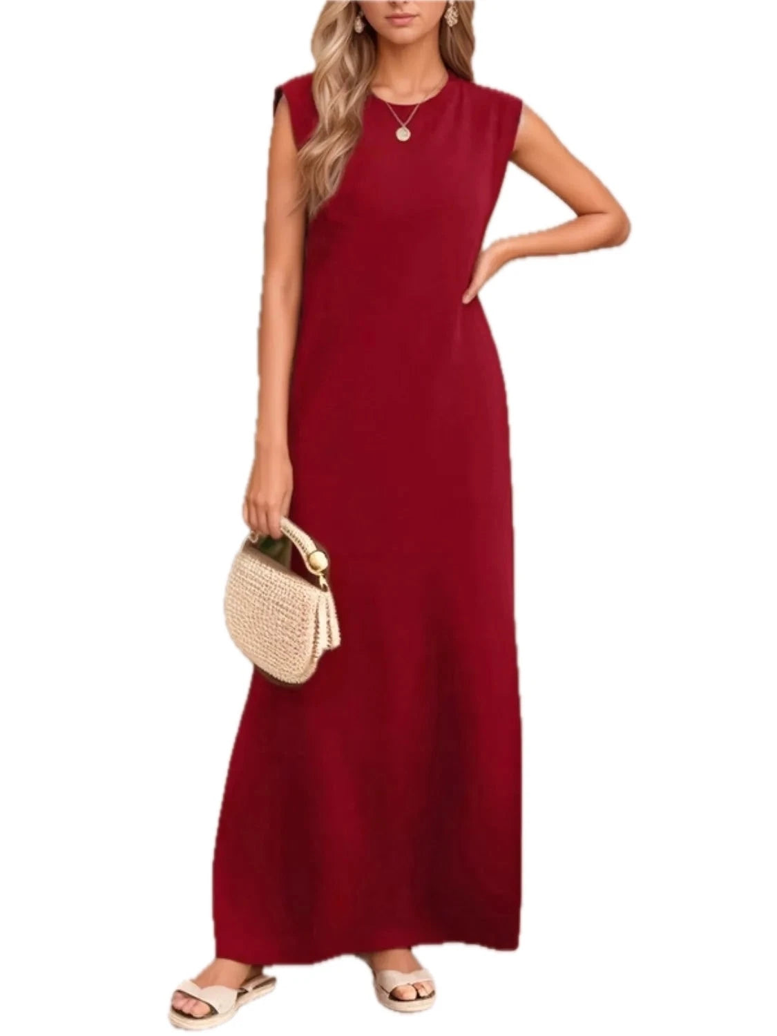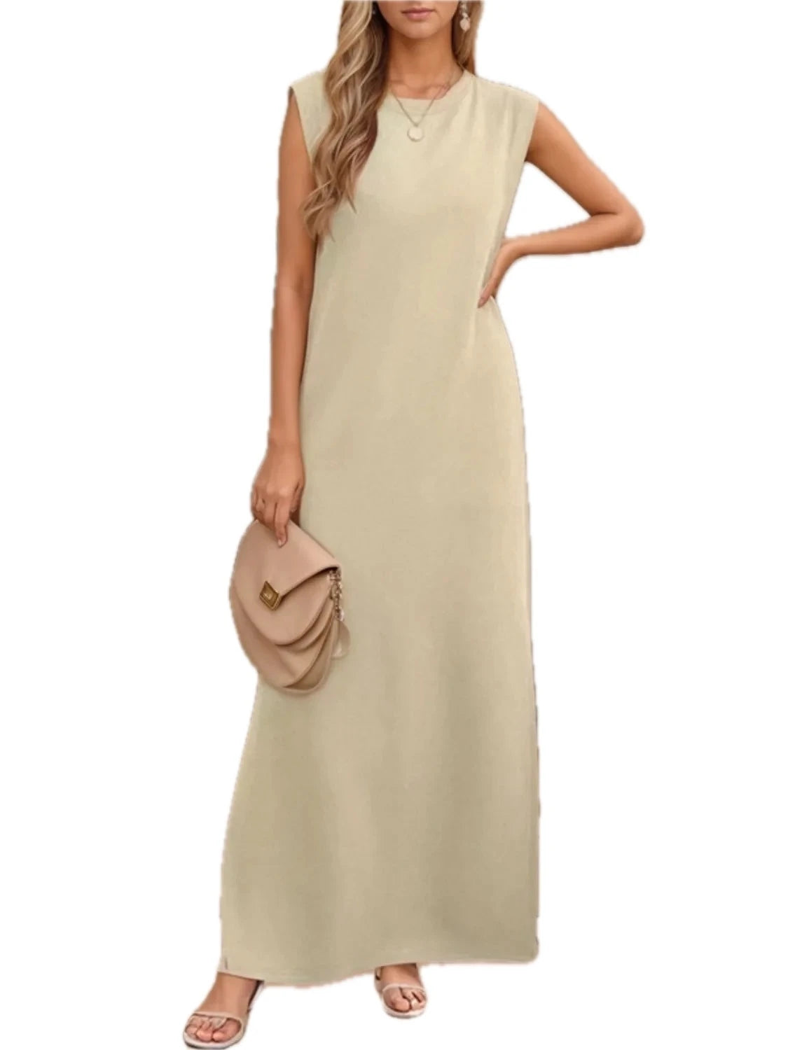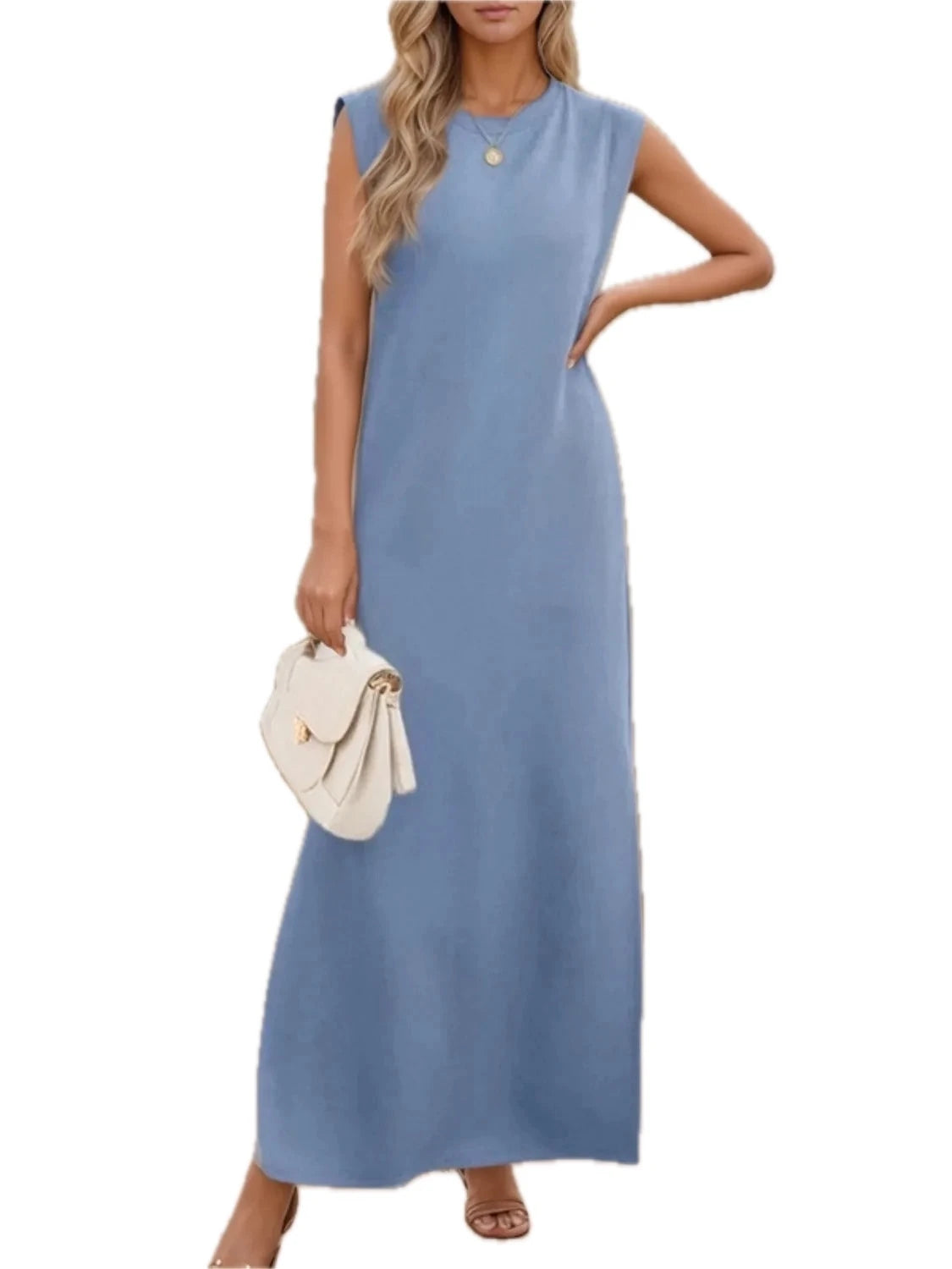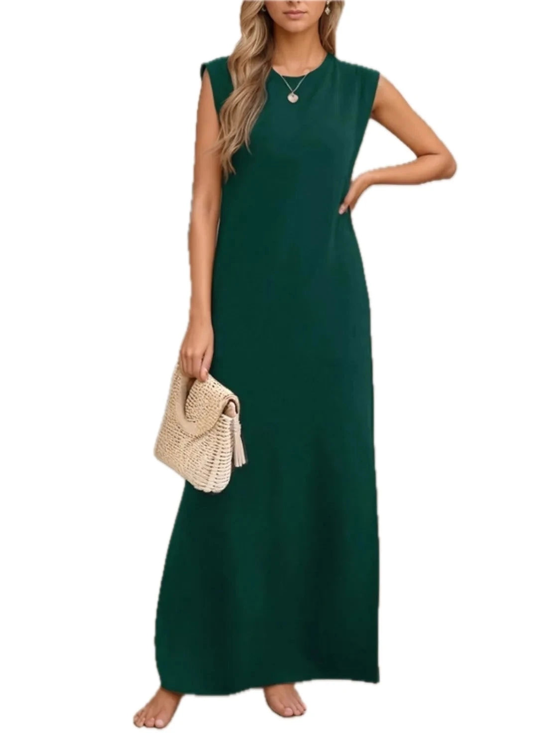 Women's Maxi Tank Dress with Round Neck and Slit Full Length Sleeveless Pocketed Plus Size 95% Polyester 5% Spandex