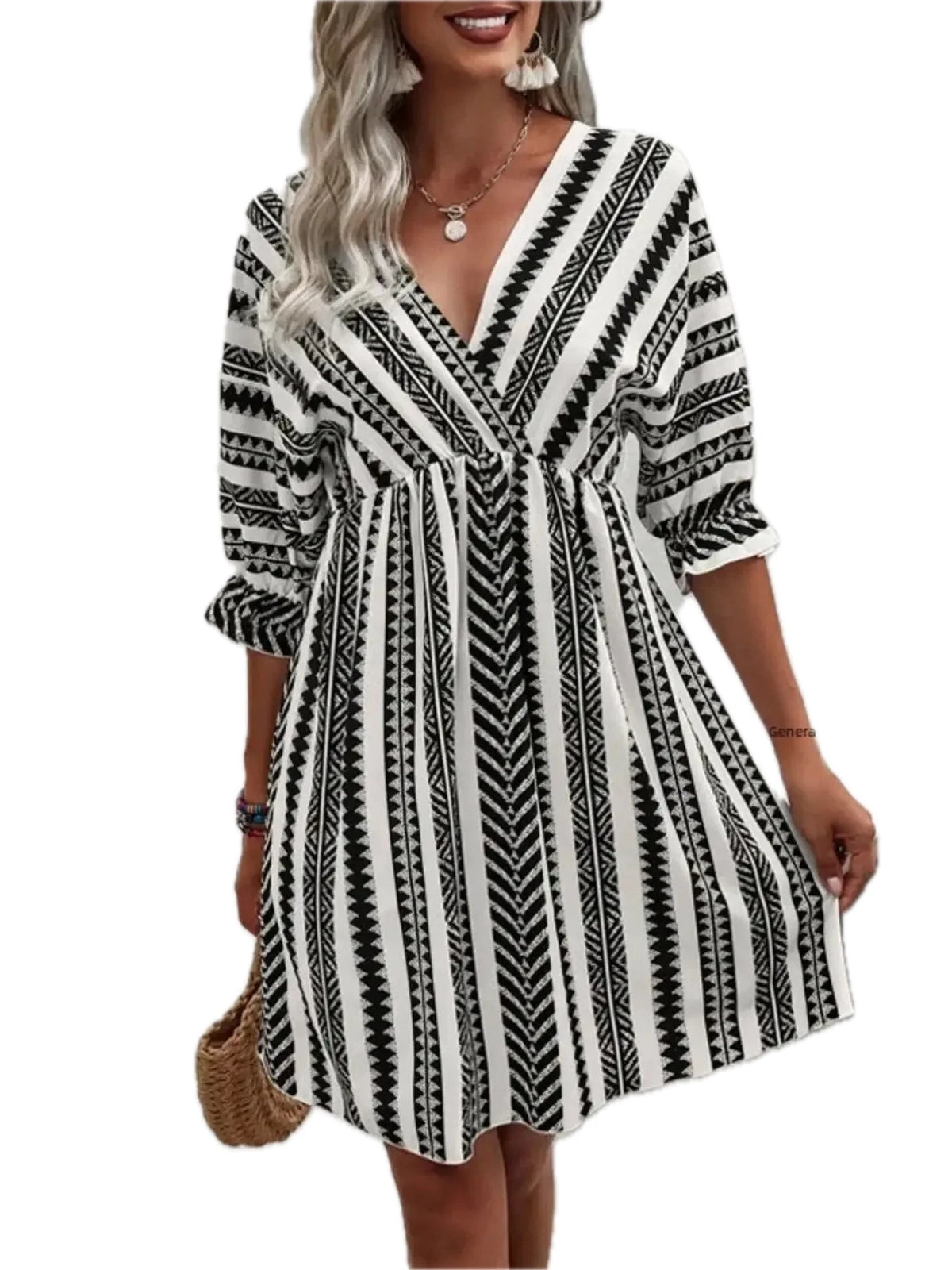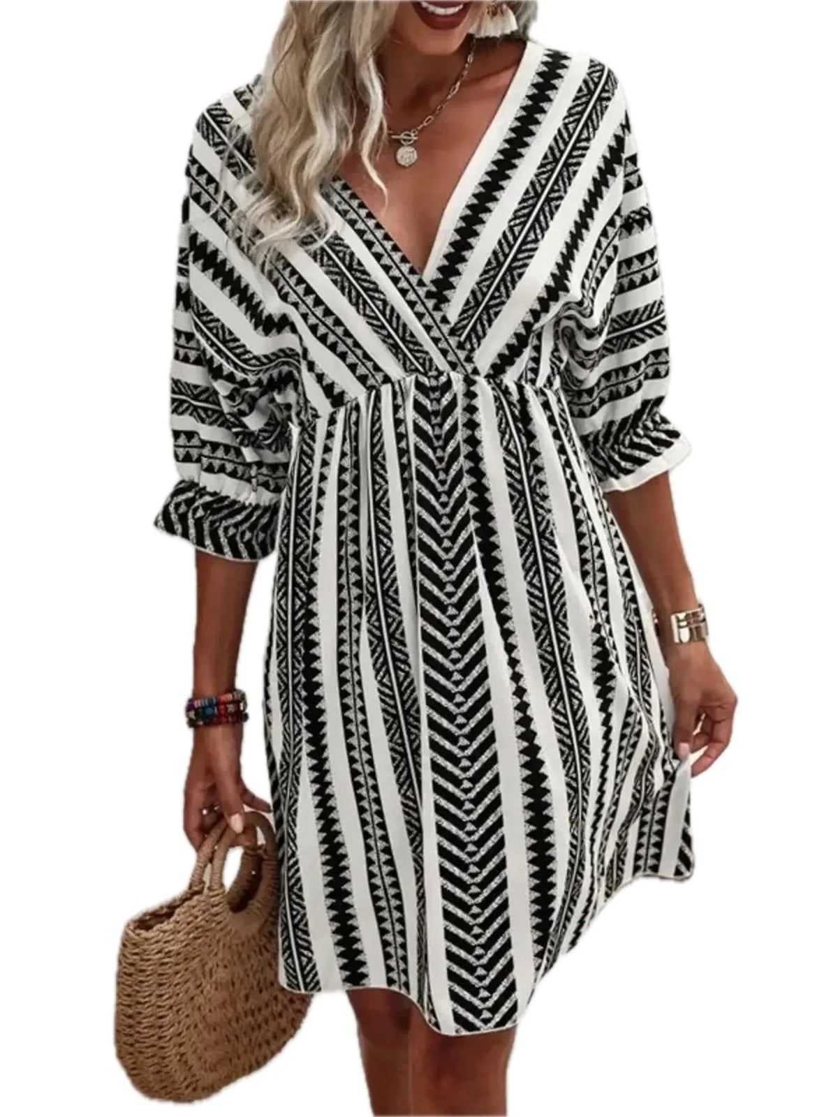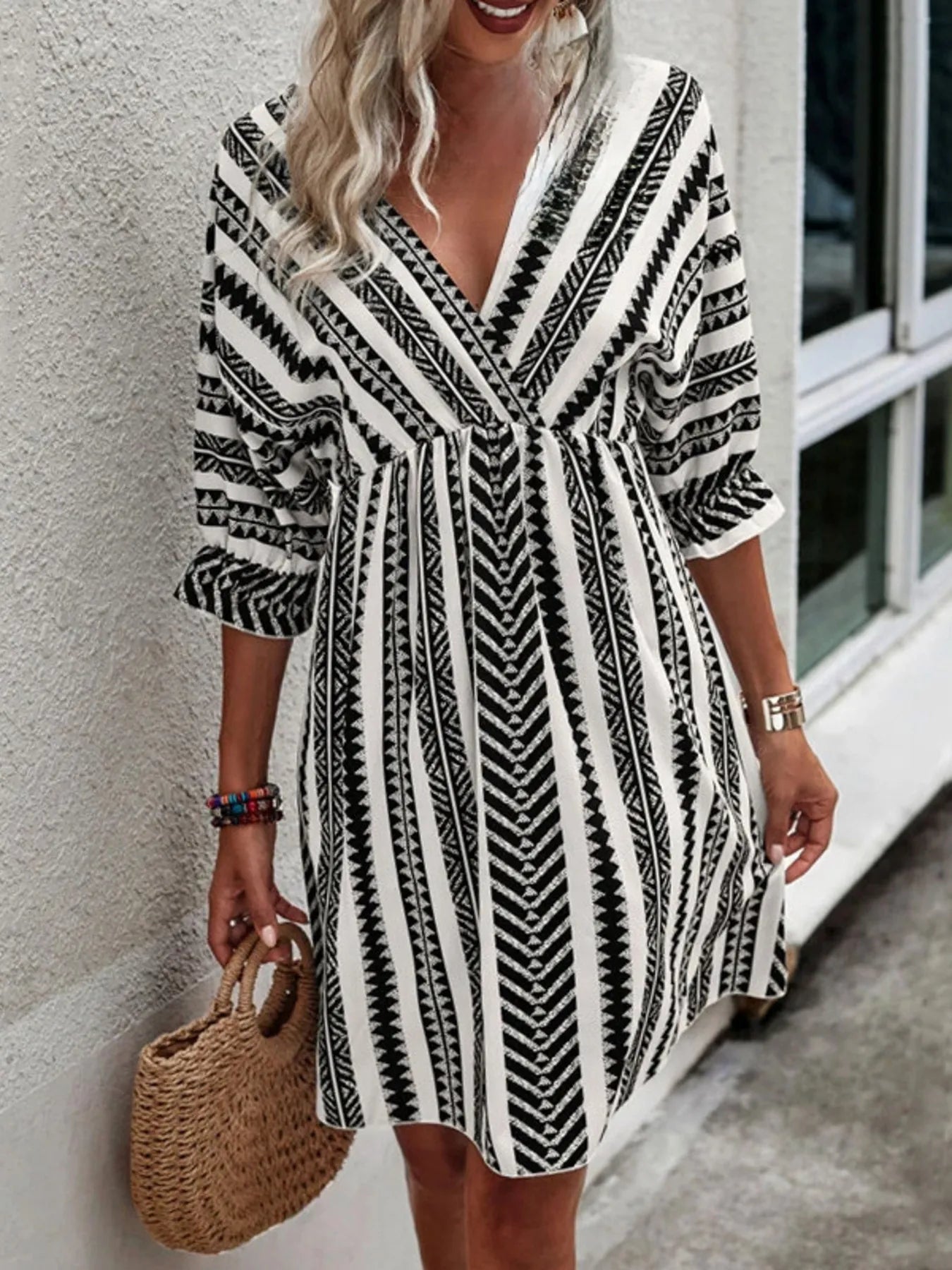 Women's Geometric Print V Neck Mini Dress 100% Polyester Lightweight Flowy Summer Everyday Dress For Day To Night