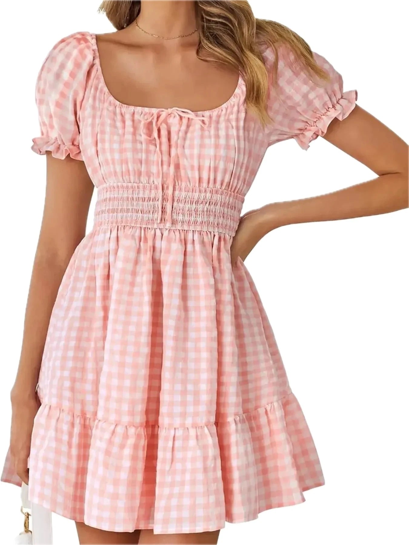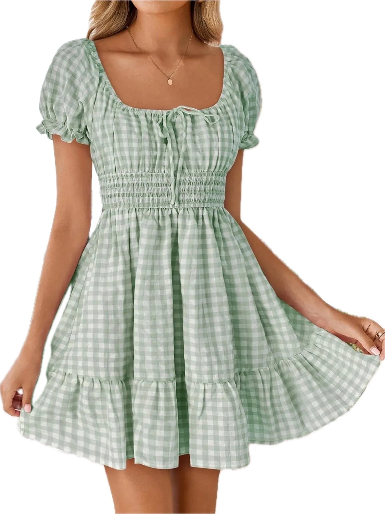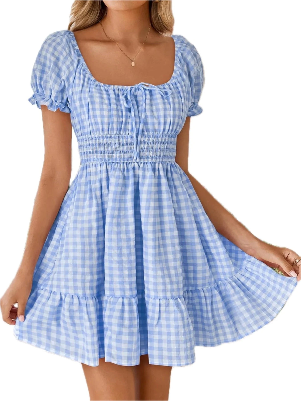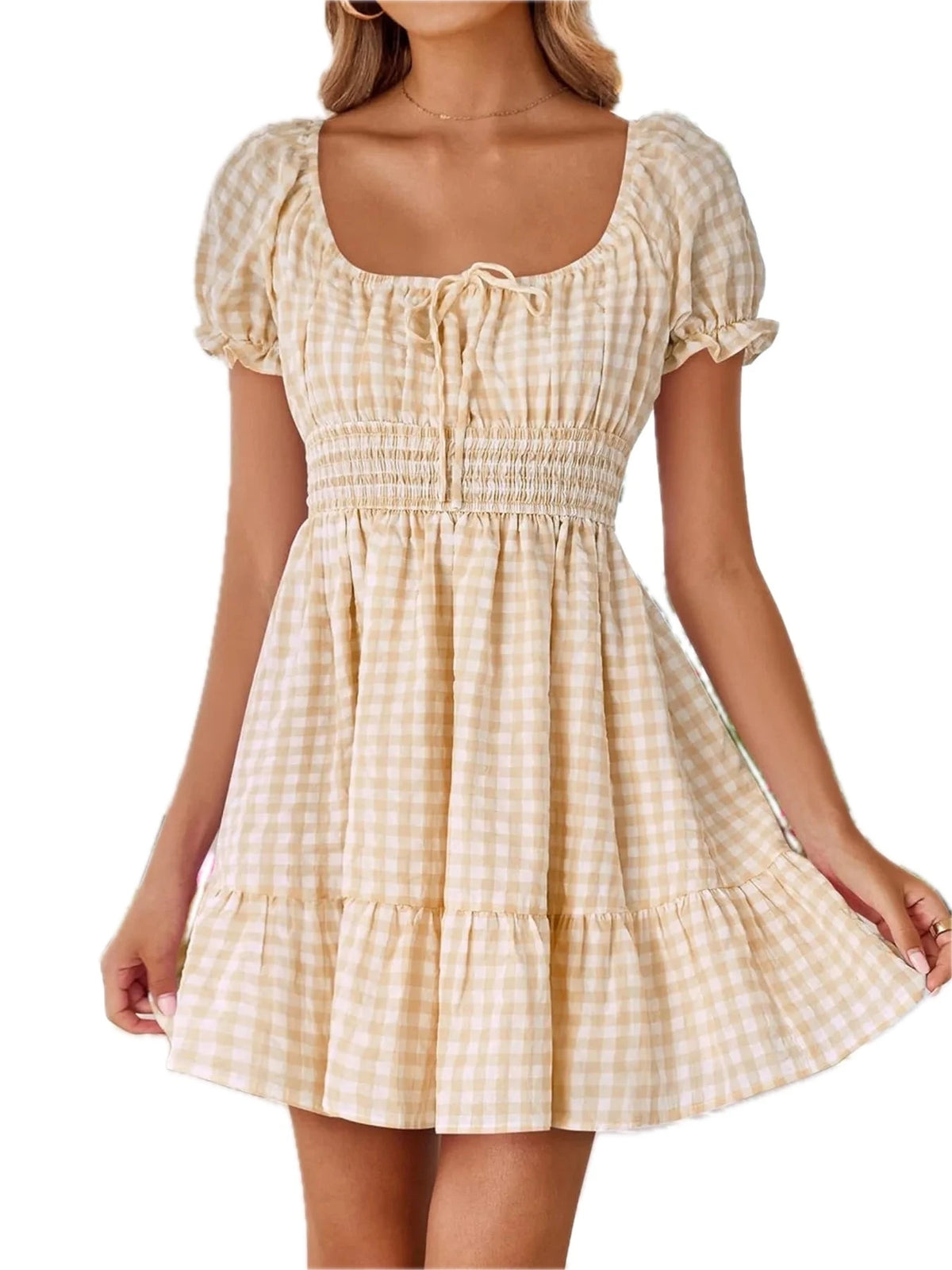 Women's Gingham Smocked Puff Sleeve Summer Dress 100% Polyester Fabric for Light Breezy Comfort and Flattering Fit