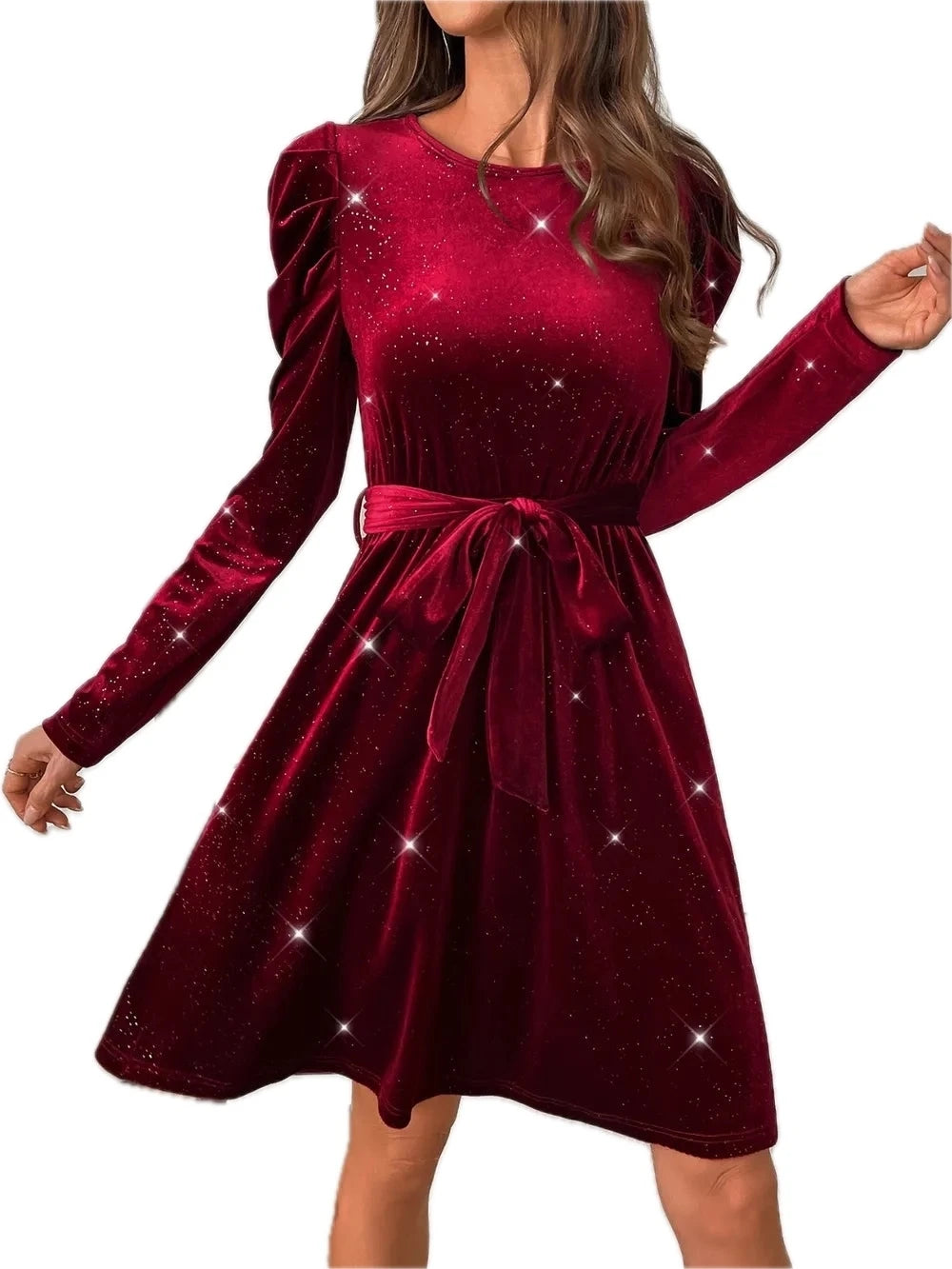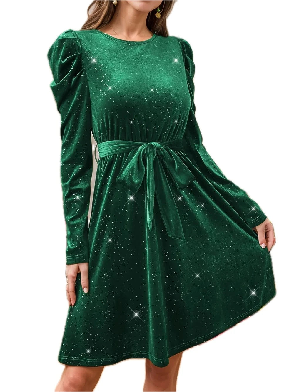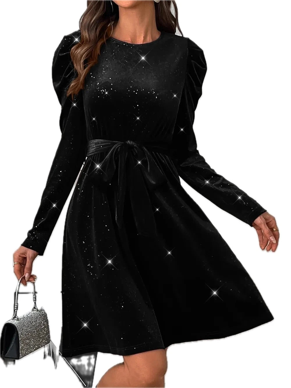 Women's Glitter Round Neck Puff Sleeve Dress 100% Polyester Fabric Shimmering Evening Party Wear Glamorous Attire