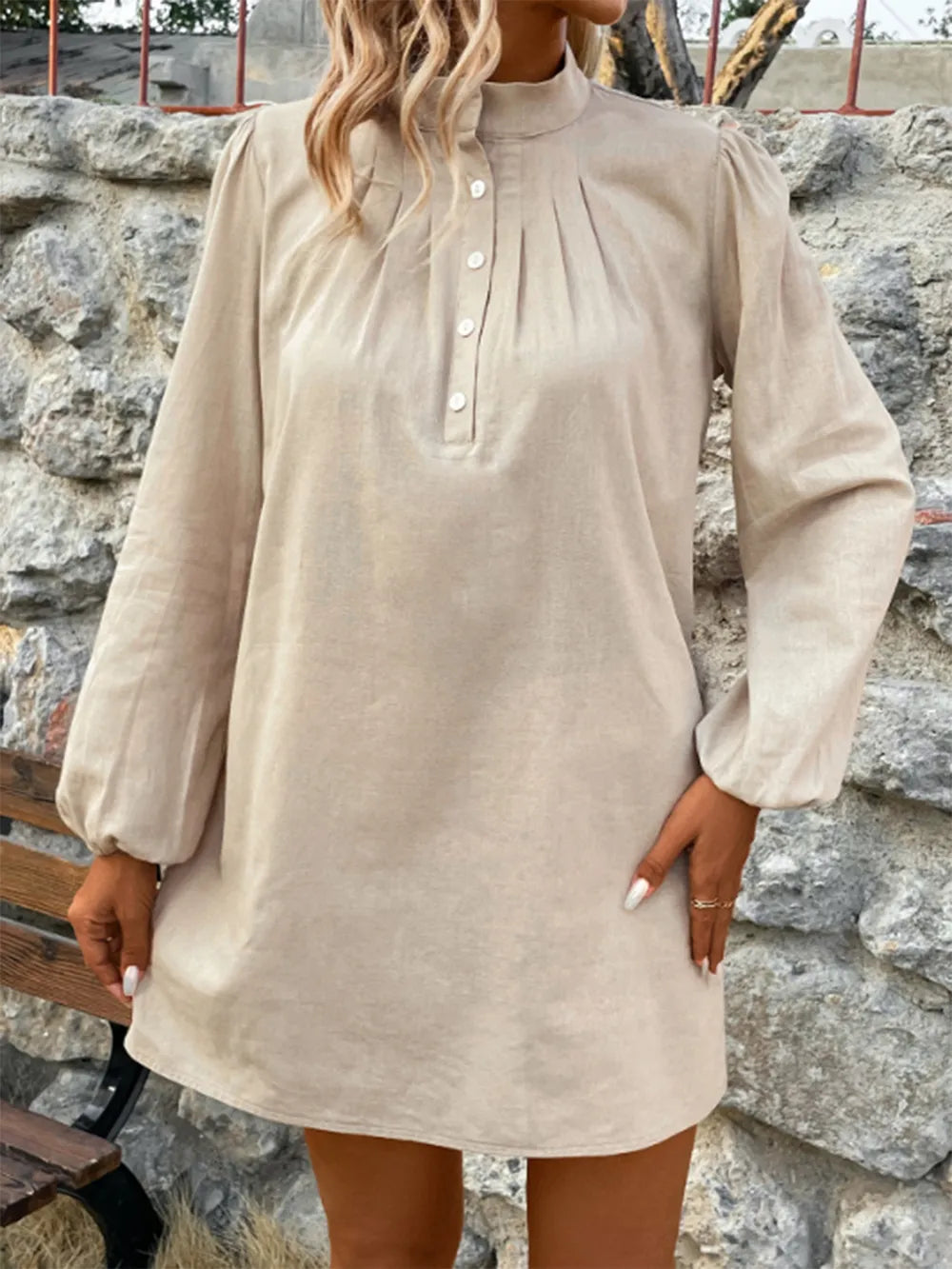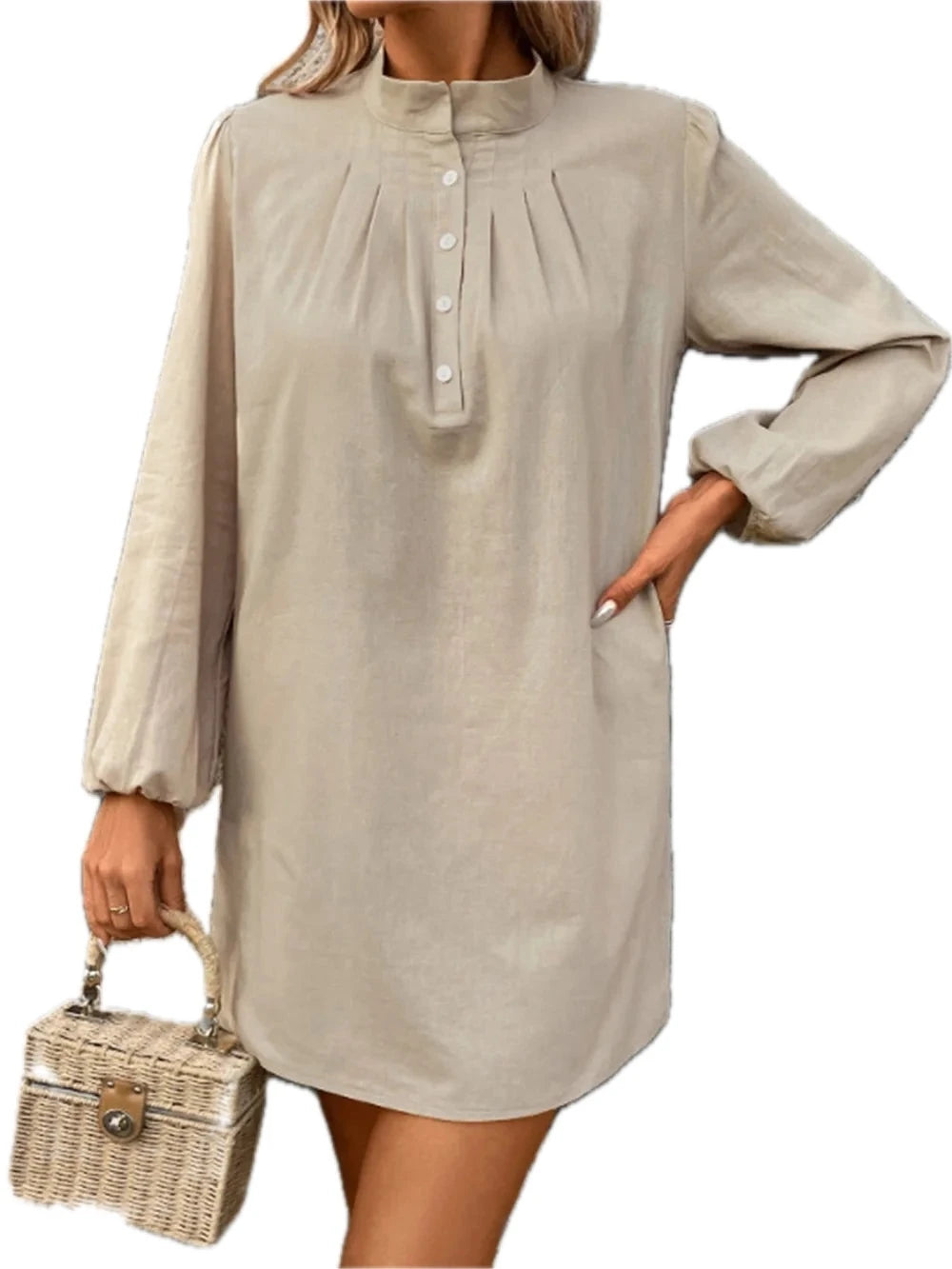 Women's Half Button Mock Neck Long Sleeve Mini Shirt Dress 100% Cotton Fabric Elegant Casual Everyday Wear All Seasons