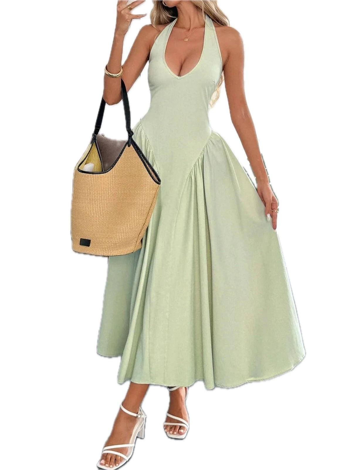 Women's Halter Neck Ruched Midi Dress with Tied Bodice and Zipper Elegant Party Wear in 100% Polyester Fabric Finish