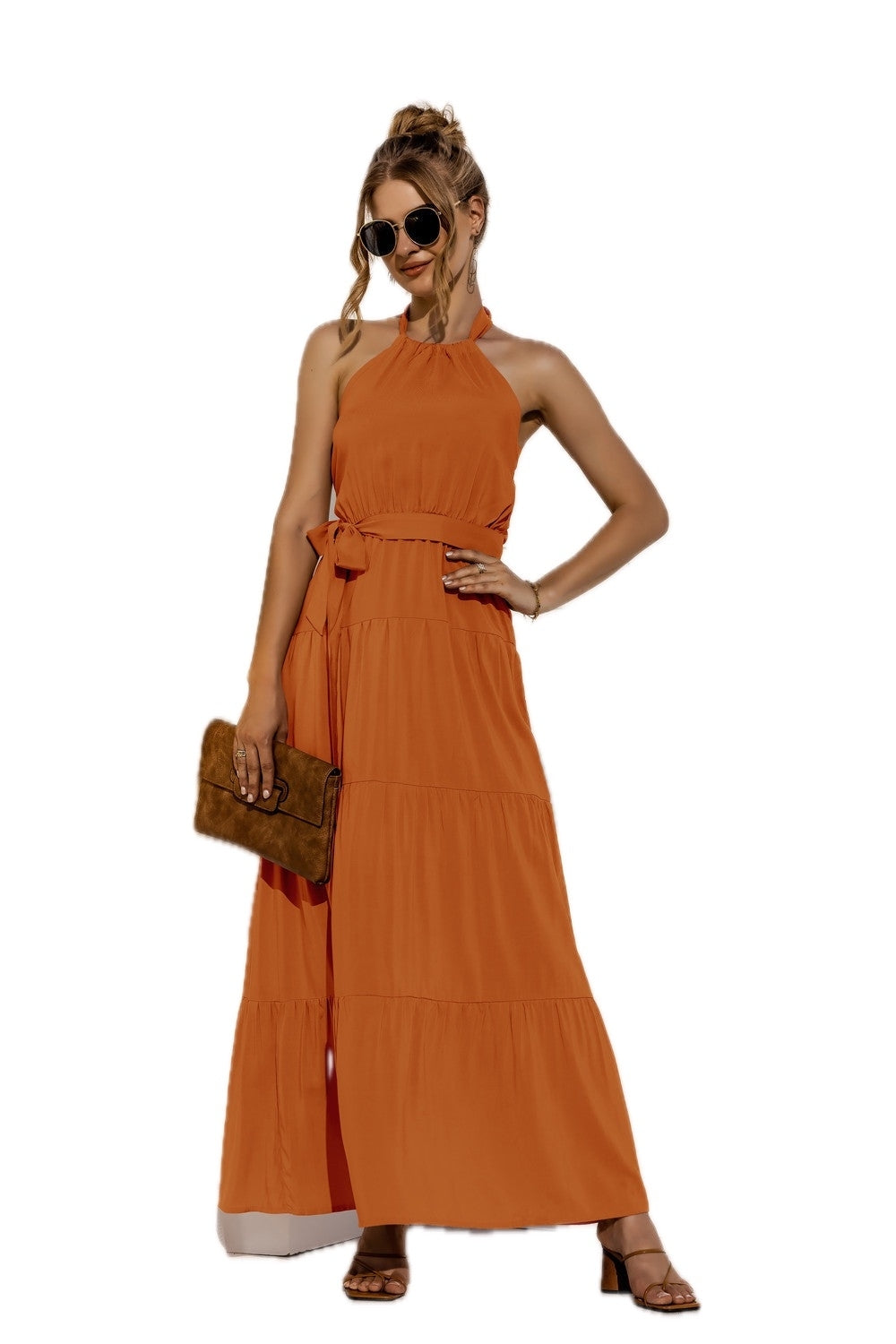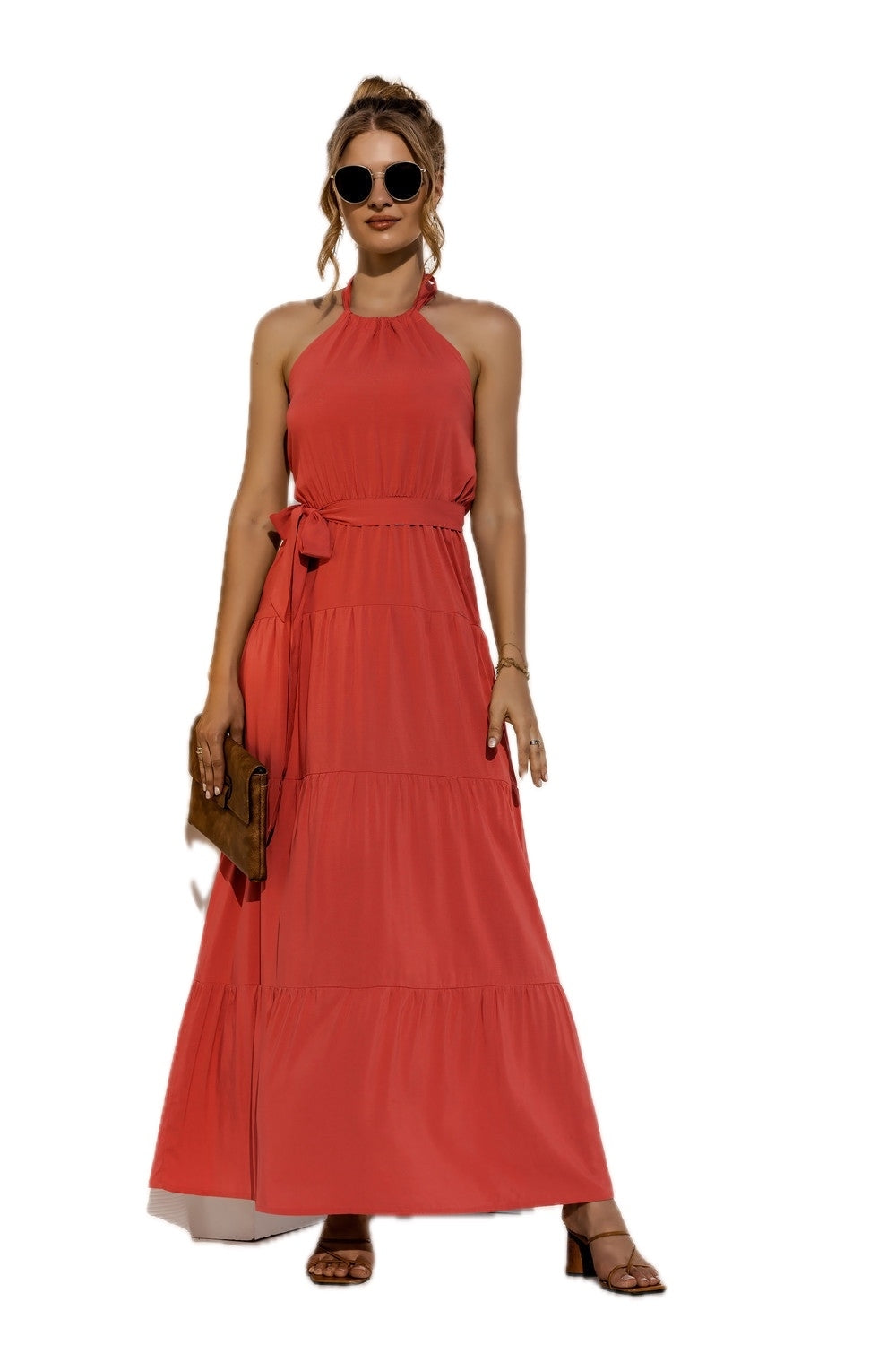 Women's Halter Neck Tie Waist Tiered Maxi Dress Casual Wear with ninety five percent polyester and five percent spandex