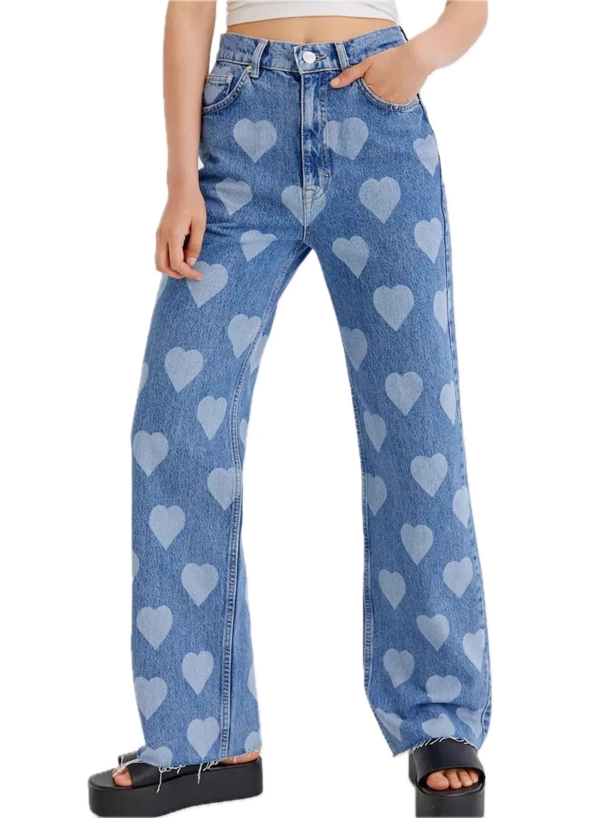 Womens High Waist Wide Leg Jeans Heart Pattern Pocketed Washed Denim Pants Trendy Durable Everyday Wear Comfortable Fit