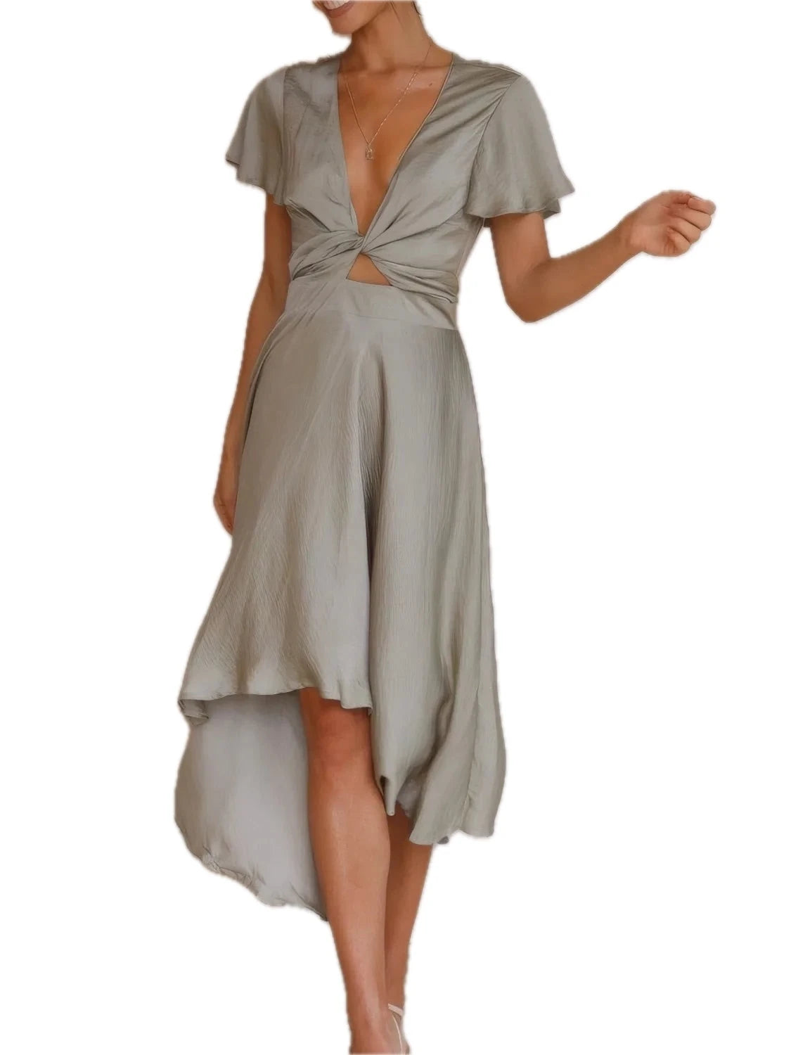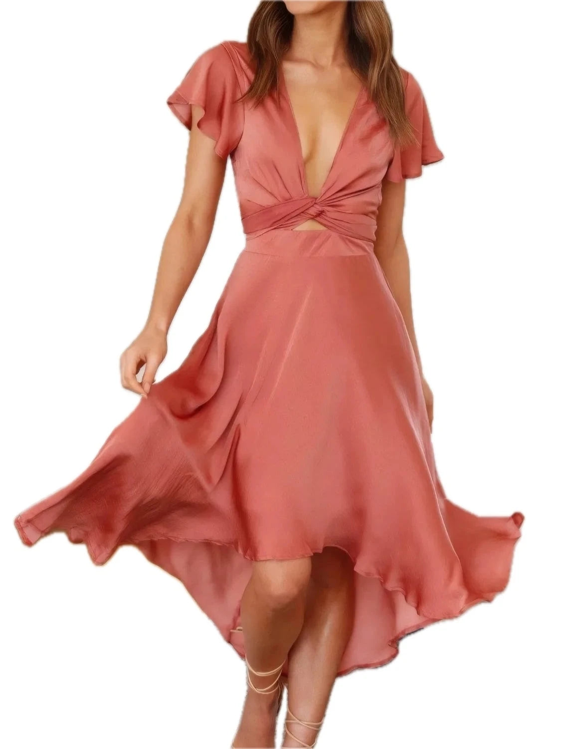 Women's High Low Plunge Flutter Sleeve Dress with Tied Crisscross Front and Flowing Silhouette 100% Polyester Everyday Dress