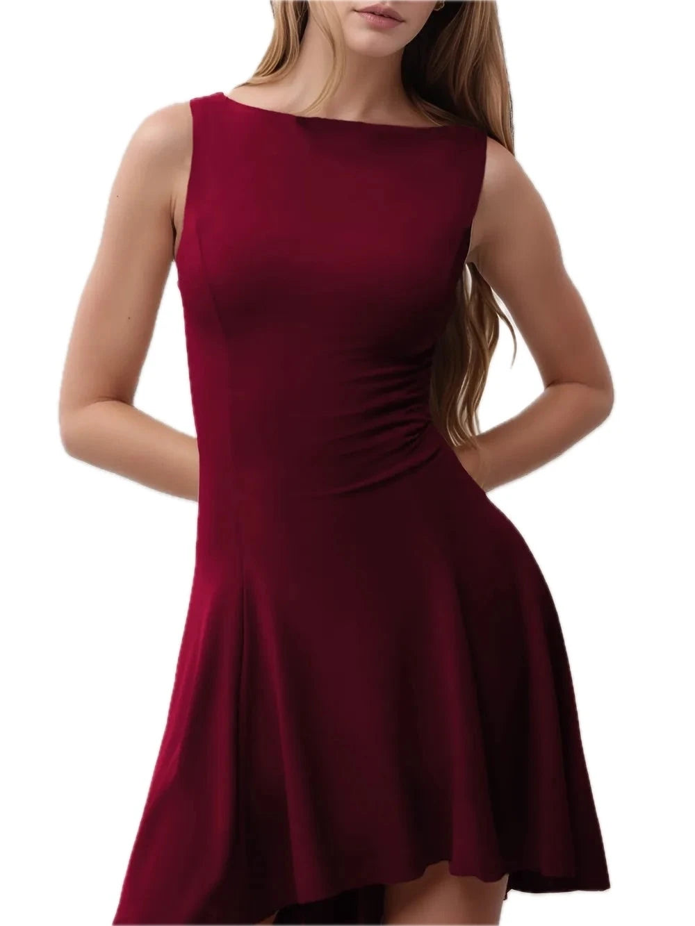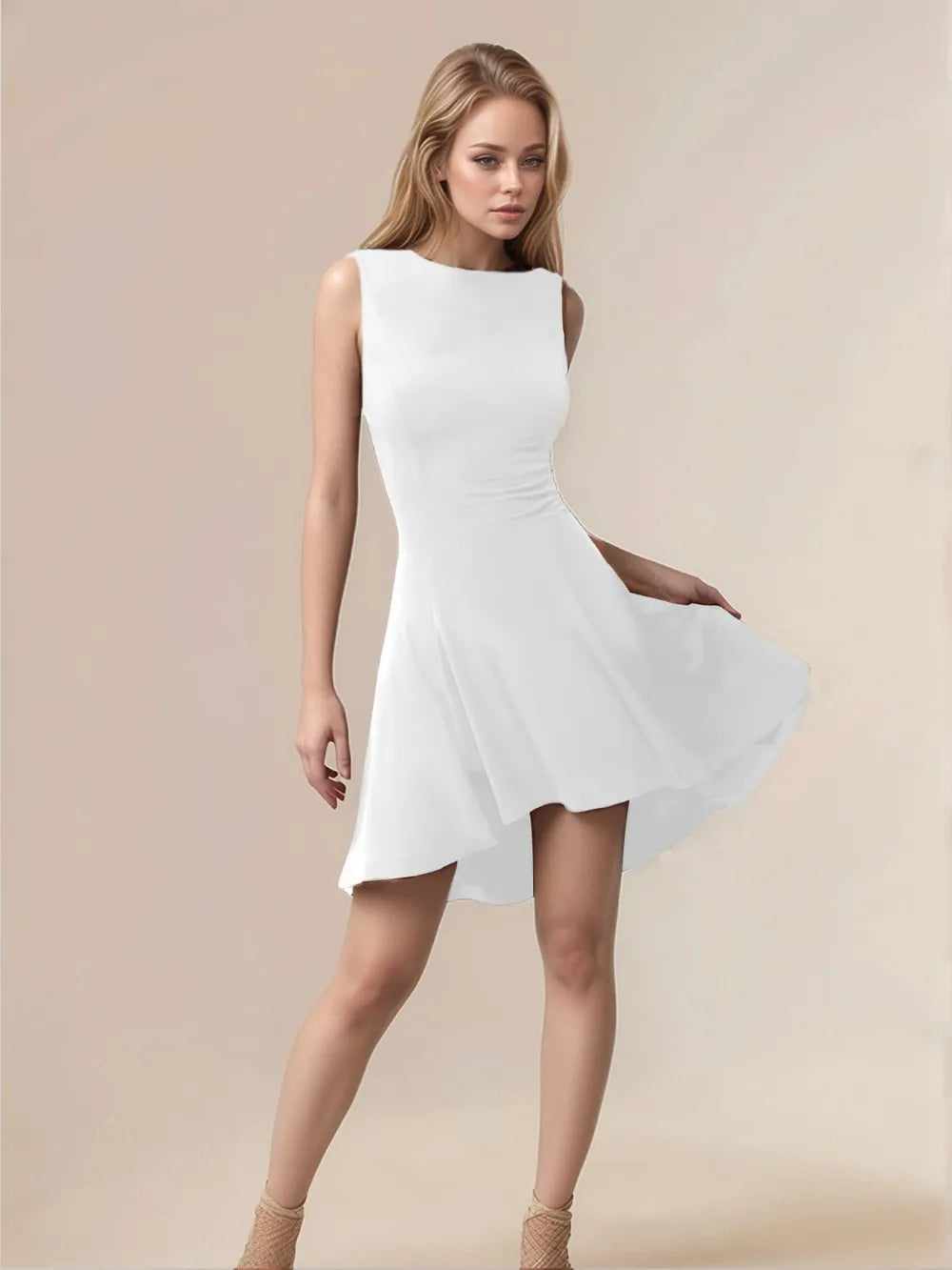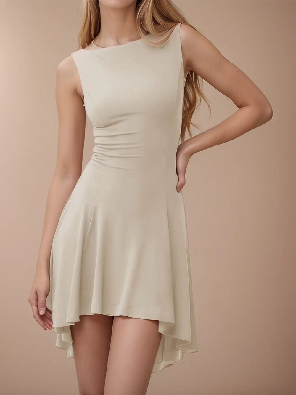 Women's High Low Round Neck Sleeveless Mini Dress with Sheer Overlay and Stretch Fabric 95% Polyester 5% Spandex