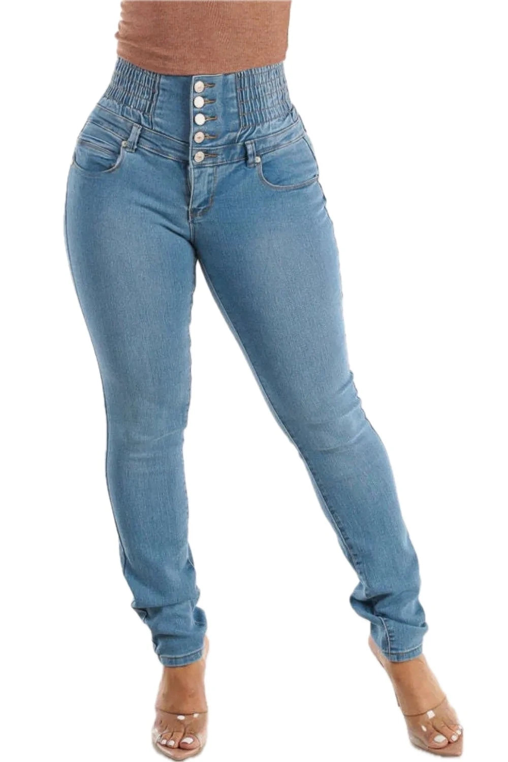Womens High Waist Skinny Jeans Buttoned Hip Lifting Pocketed Smocked Waist Stretch Denim for Daily Wear Everyday