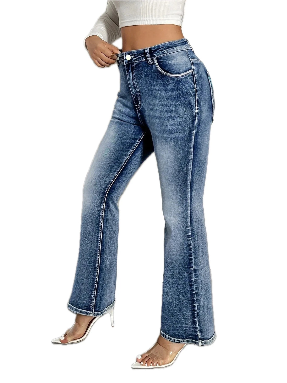 Womens High Waist Flare Denim Jeans Vintage Wash with Buttoned Pockets Durable Everyday Wear Comfortable Stretch Fabric