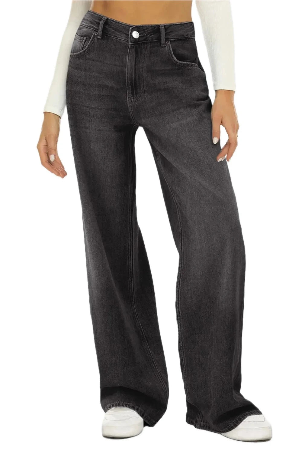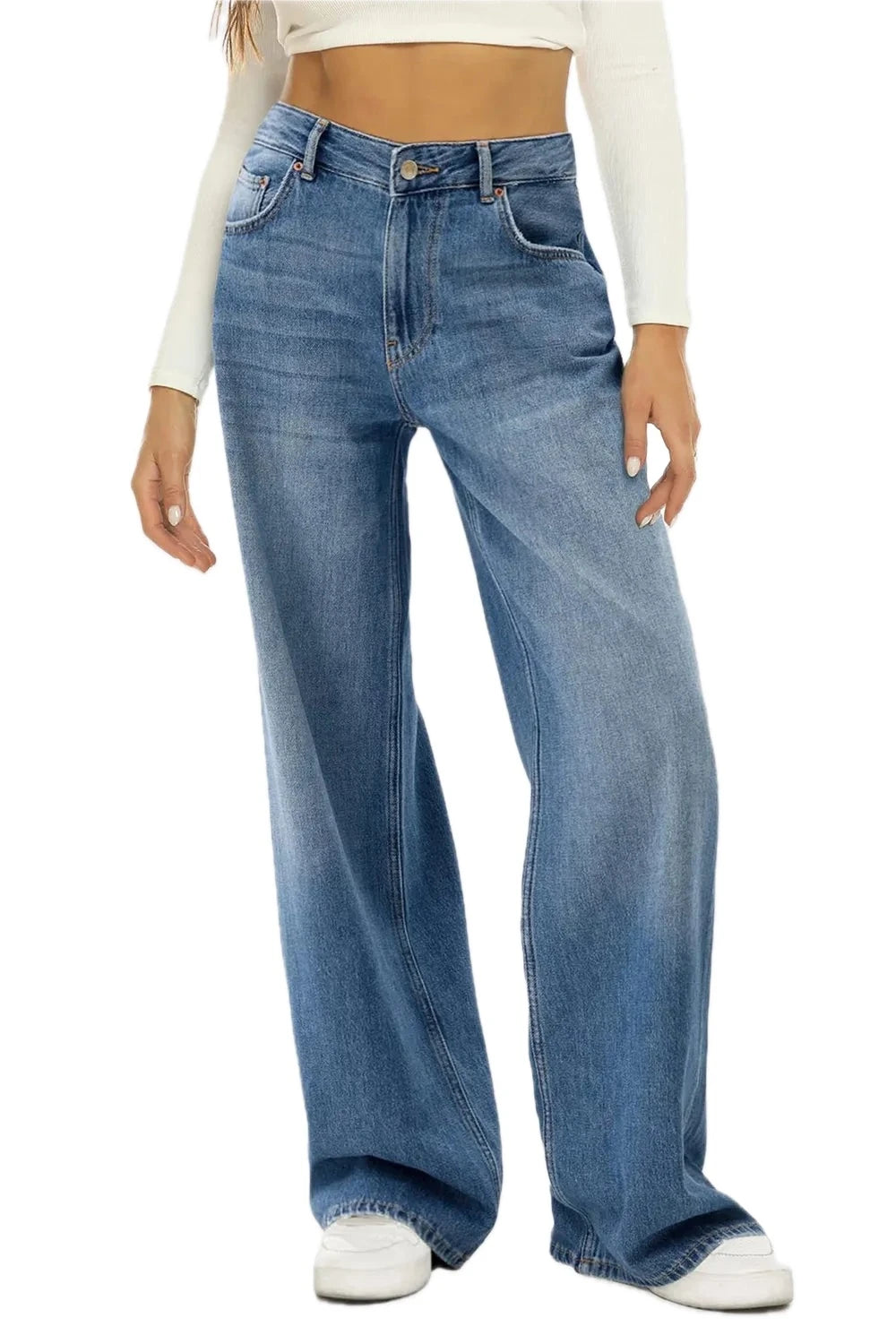 Womens High Waist Wide Leg Jeans Buttoned Pockets No Stretch Durable Denim Pants For Classic Casual Everyday Wear