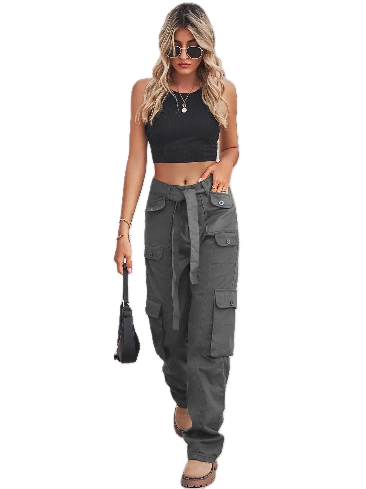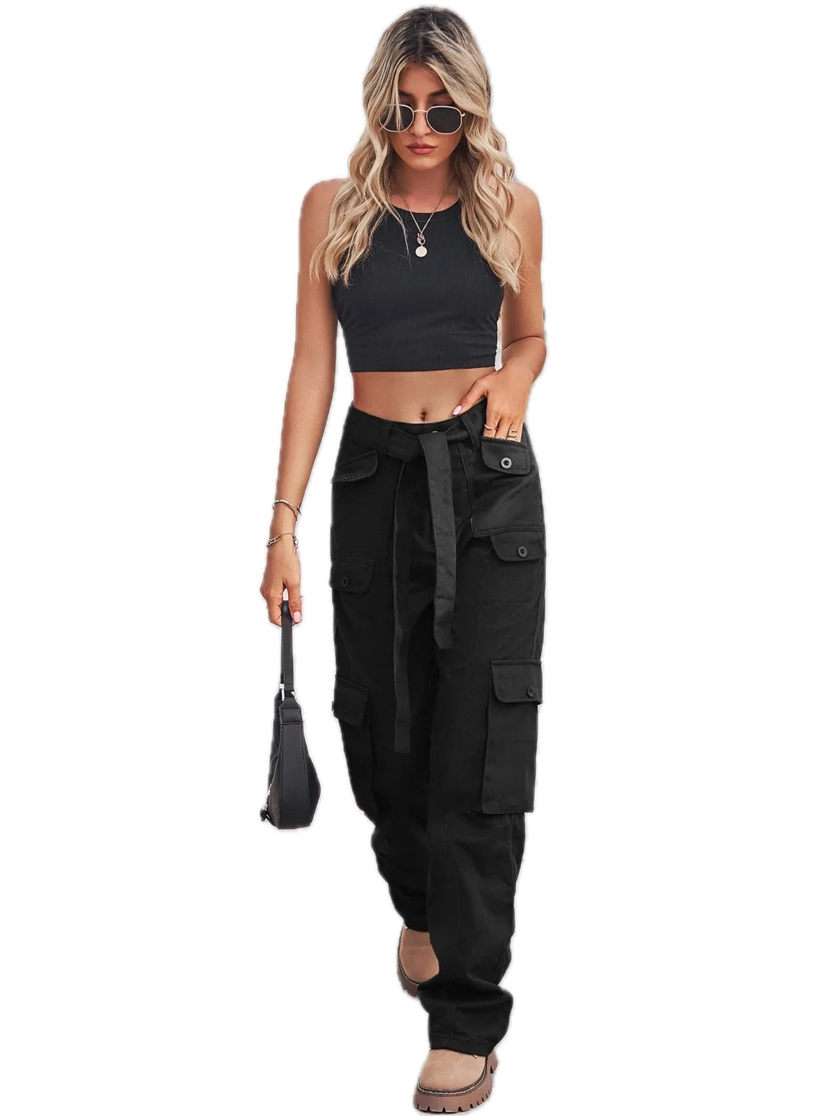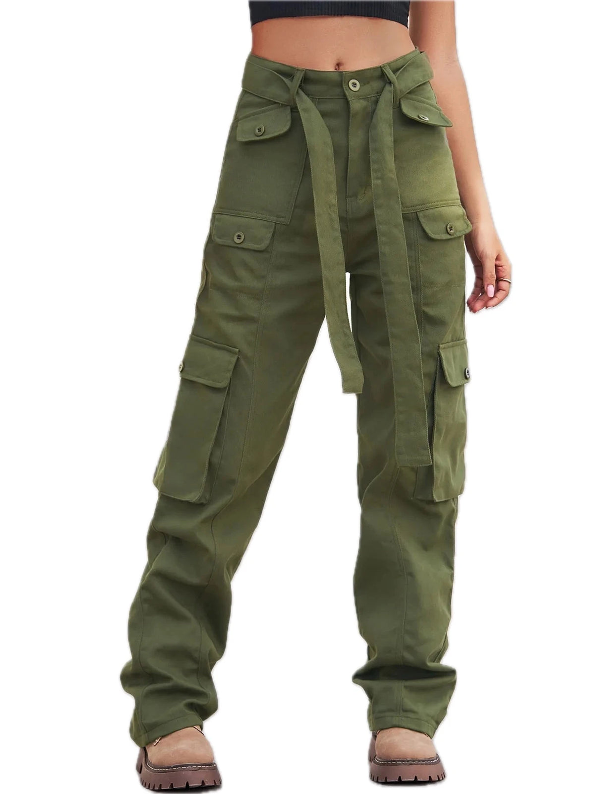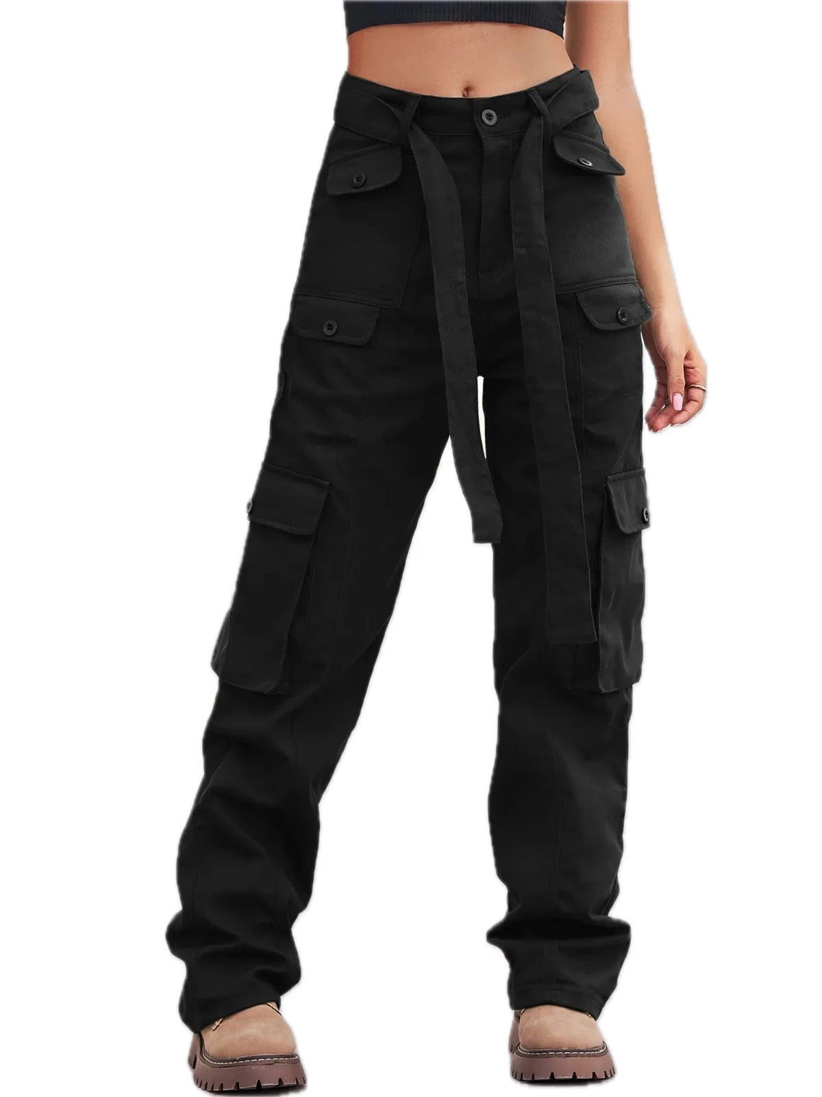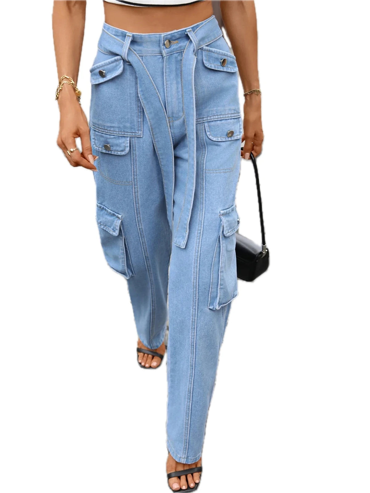 Women High Waisted Cargo Jeans Belted with Pockets Slightly Stretchy Durable Versatile Everyday Outdoor Casual Pants
