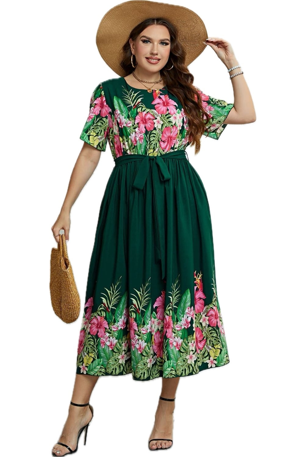 Women's Floral Tie Waist Round Neck Midi Dress Flutter Sleeves Chic Elegant Everyday Wear 95% Polyester 5% Elastane